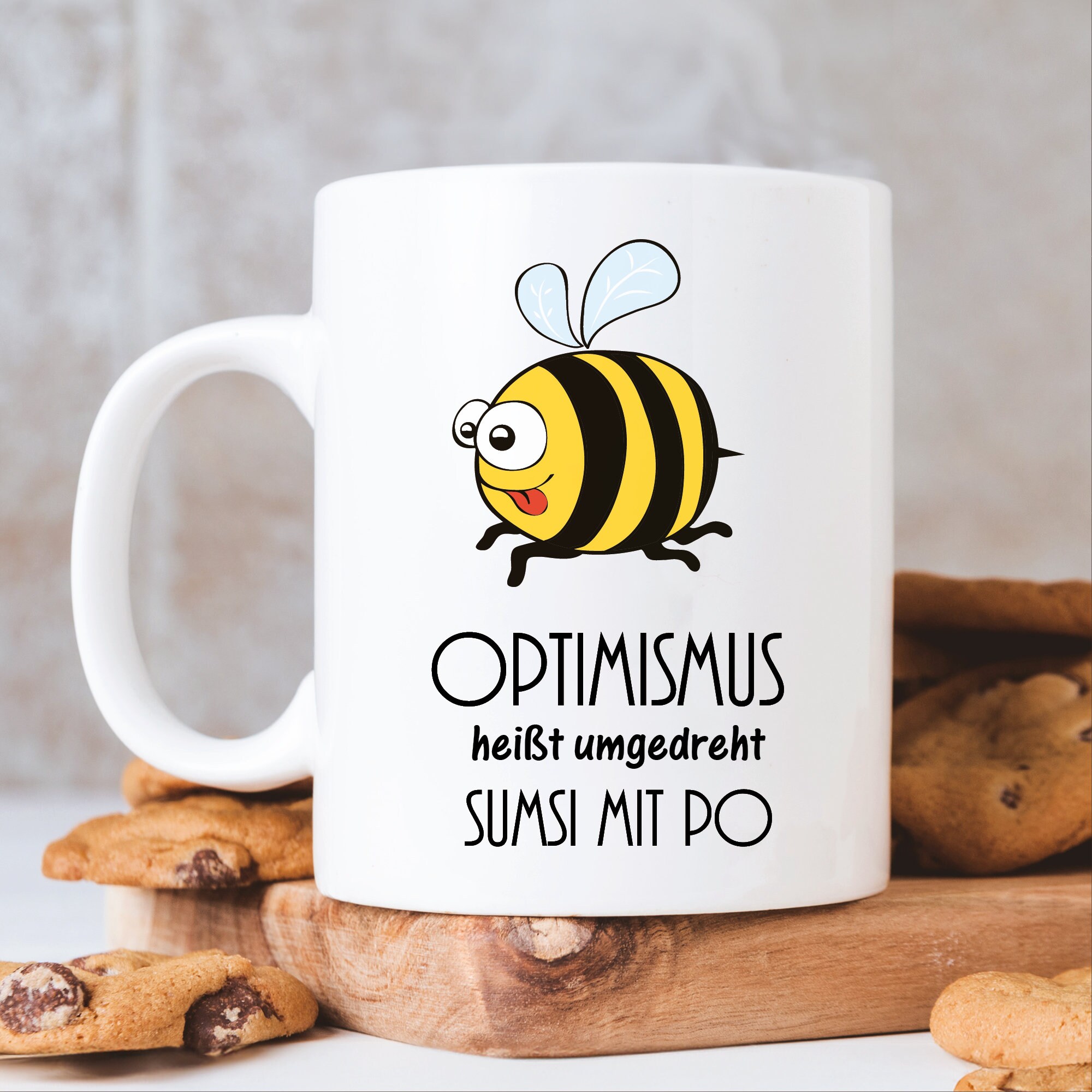 Bedruckte Kaffeetasse “OPTIMISMUS heißt umgedreht Sumsi mit Po” spülmaschinenfest Biene Tasse Becher Geschenk Geburtstag