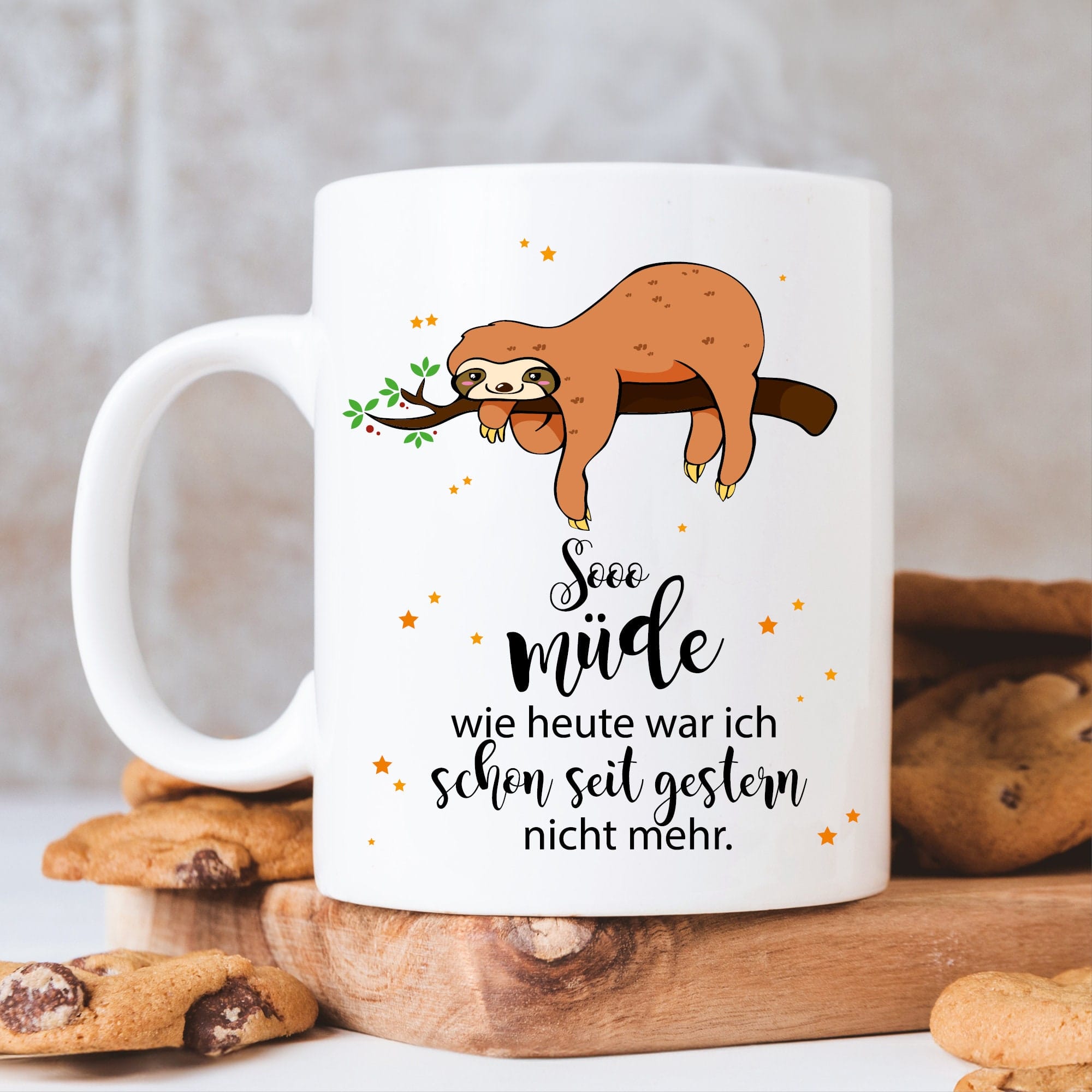 Bedruckte Keramik Tasse niedliches Faultier auf Ast “So müde wie heute war ich schon seit gestern nicht mehr!”, Geburtstagsgeschenk