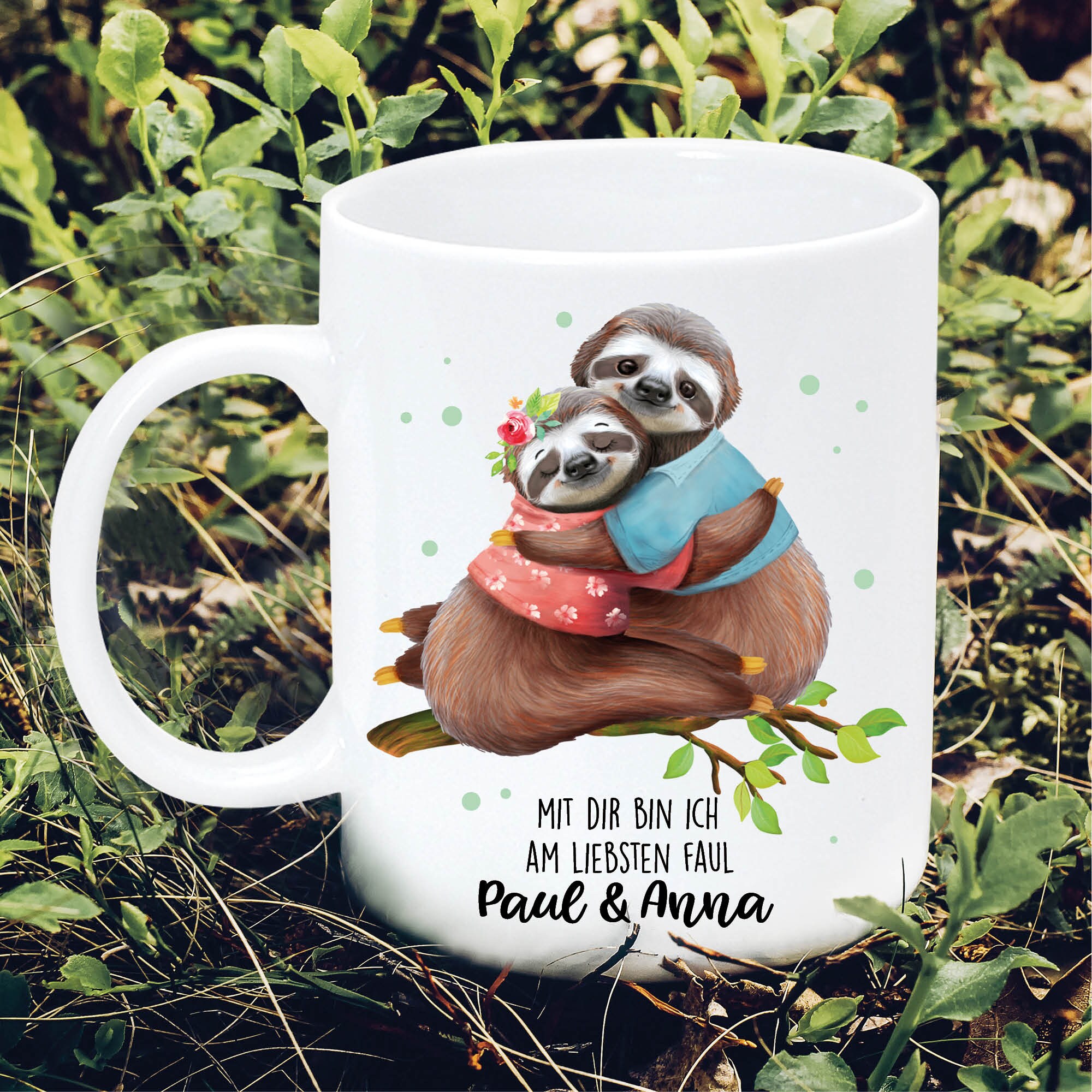 Bedruckte Keramik Tasse weiß Faultiere “Mit dir bin ich am liebsten faul”, Kaffeebecher, Geschenk Geburtstag, Geschenk zu Weihnachten