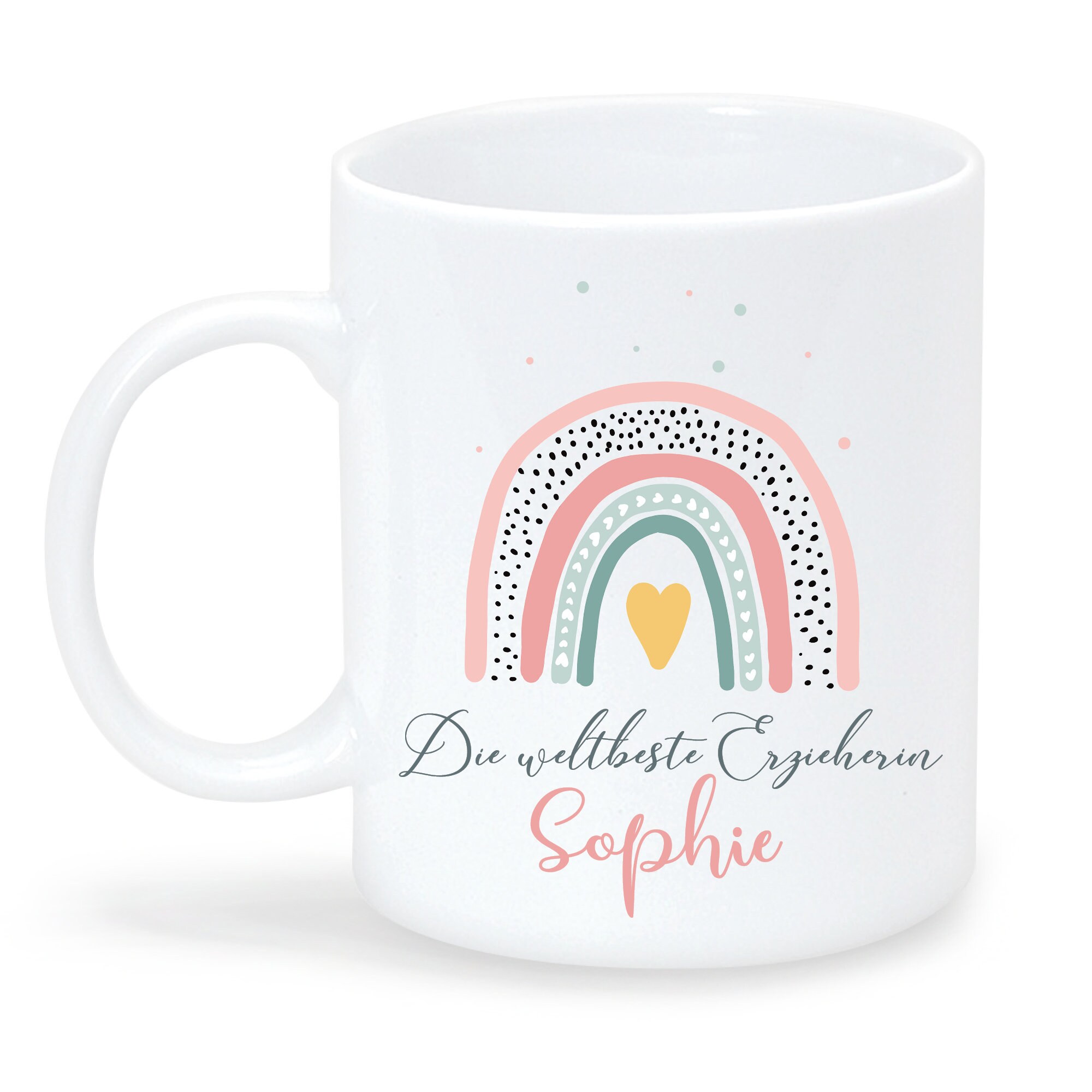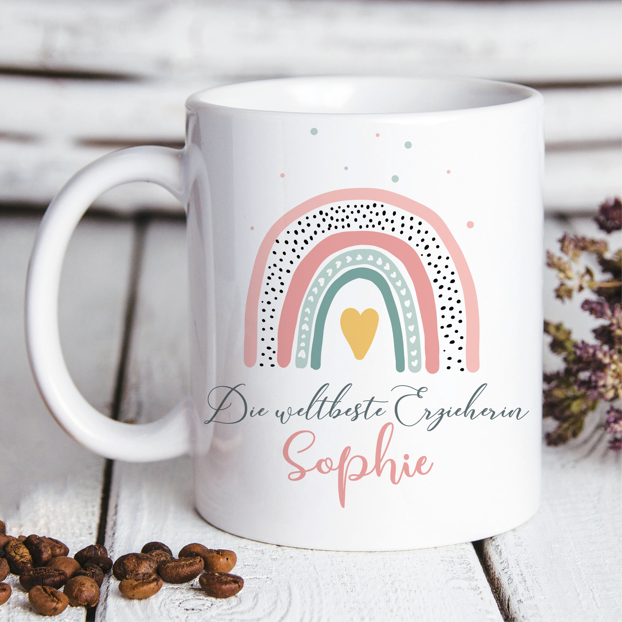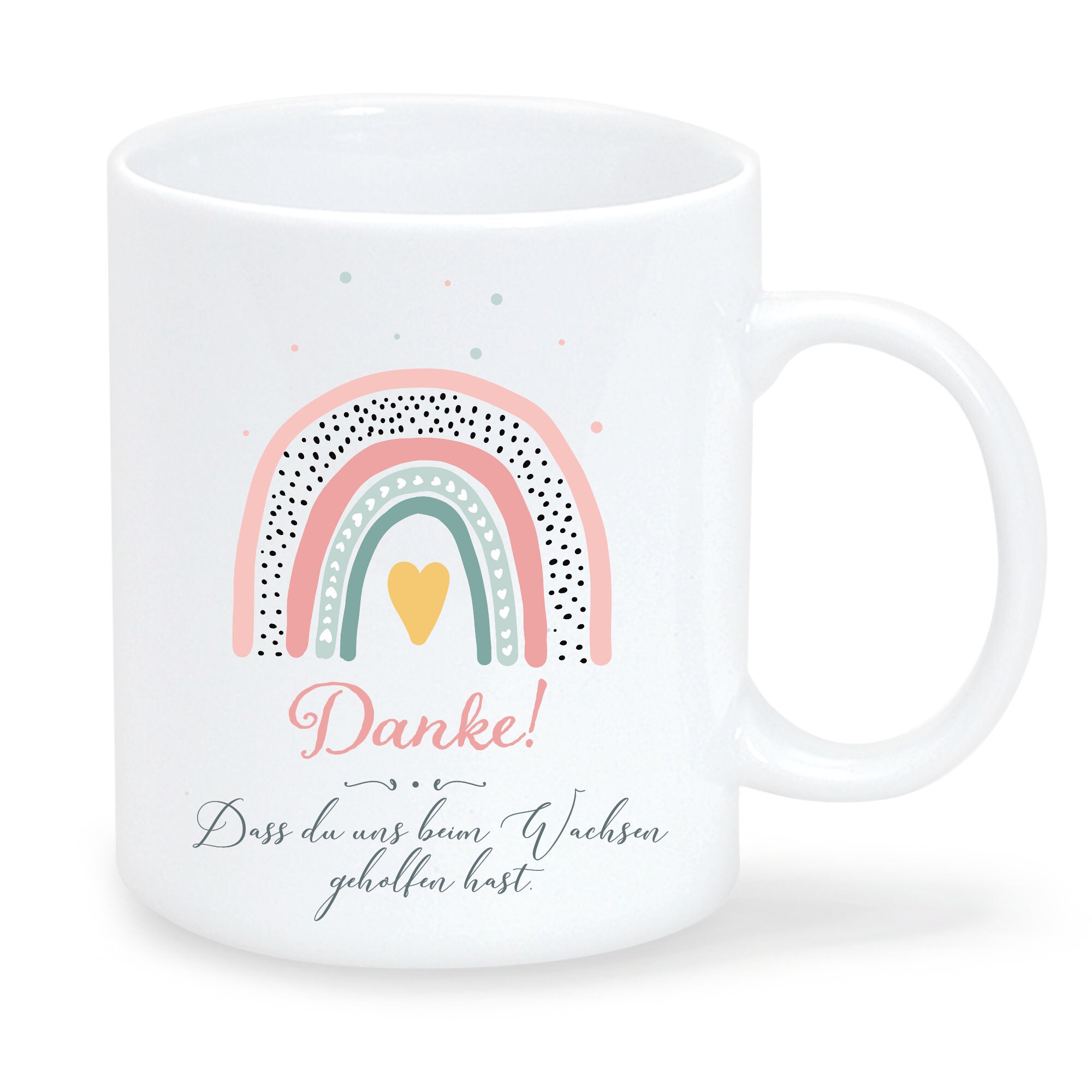 Beidseitig bedruckte Keramiktasse mit Regenbogen Motiv für Erzieherin “Danke! Dass du uns beim Wachsen geholfen hast” auf der einen Seite und Wunschnamen auf der Rückseite – Geschenk für Kindergärtnerin