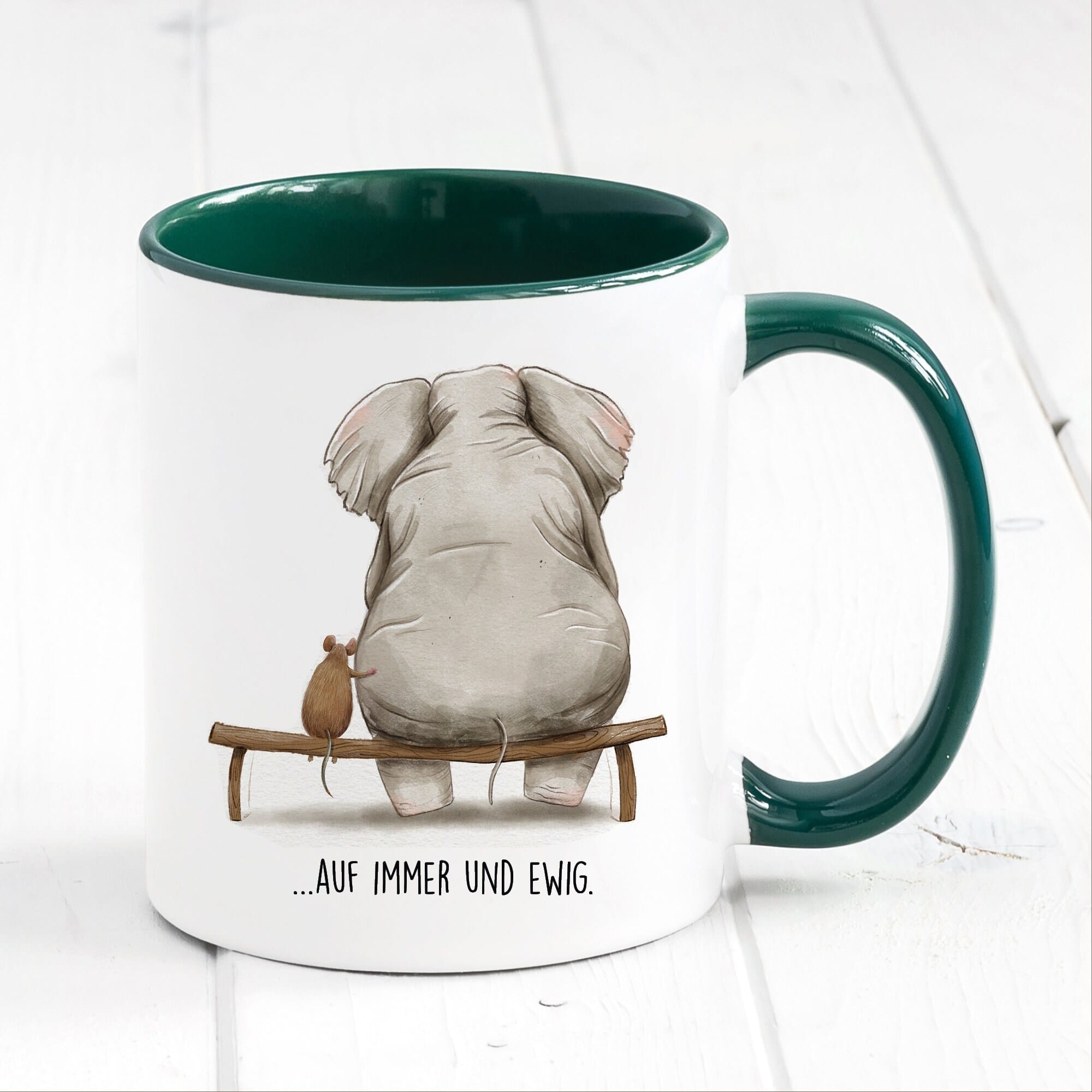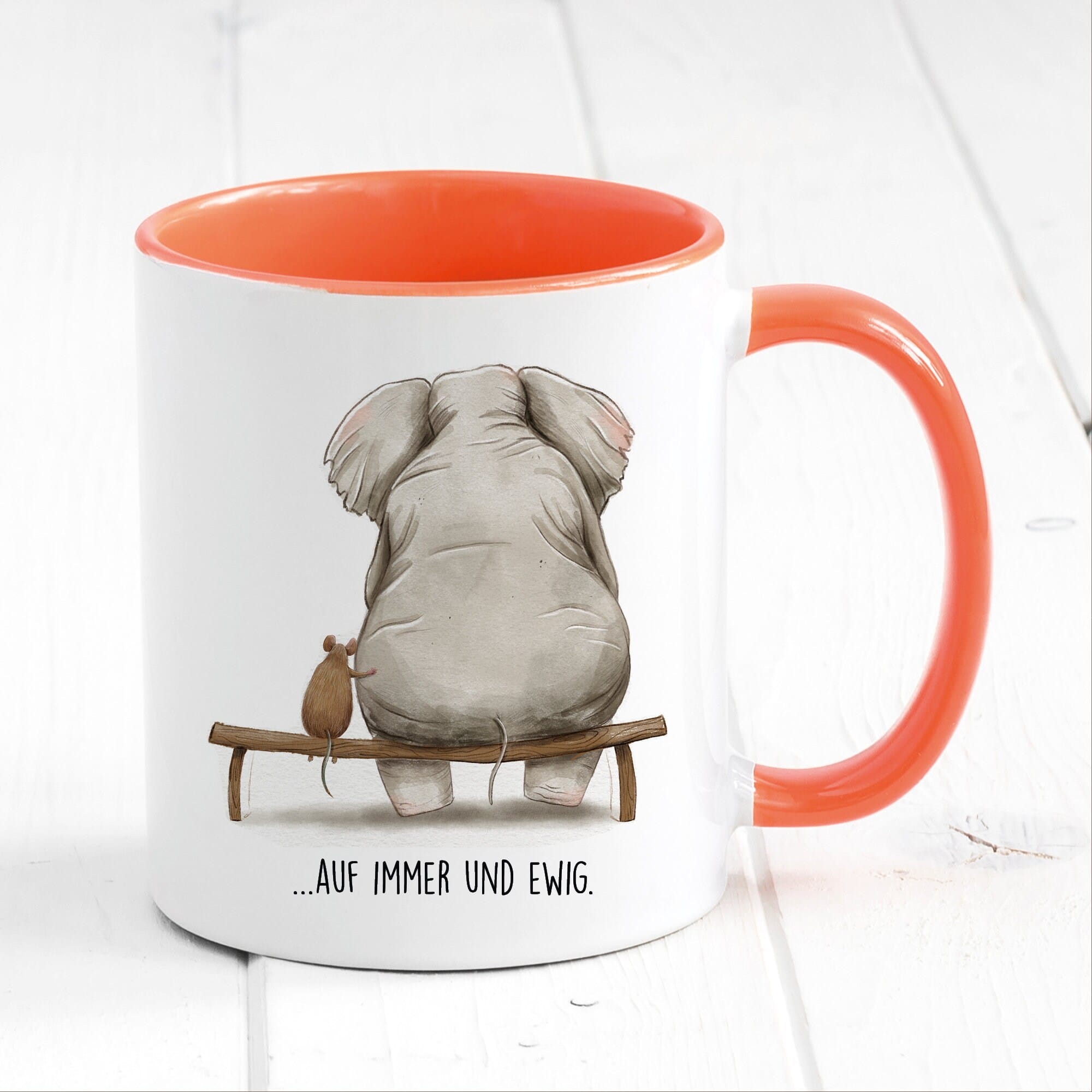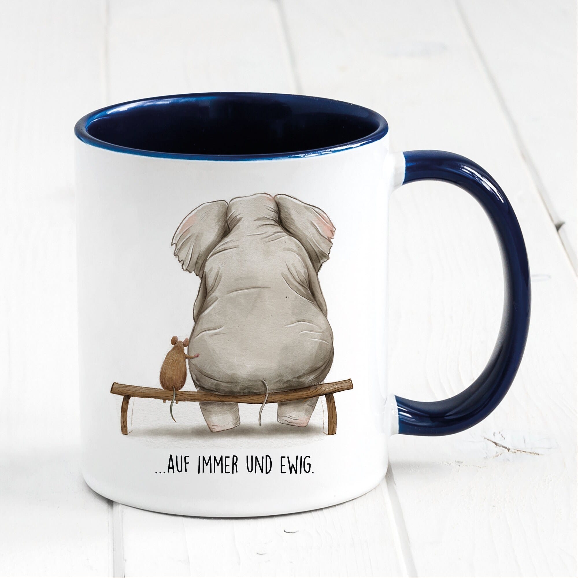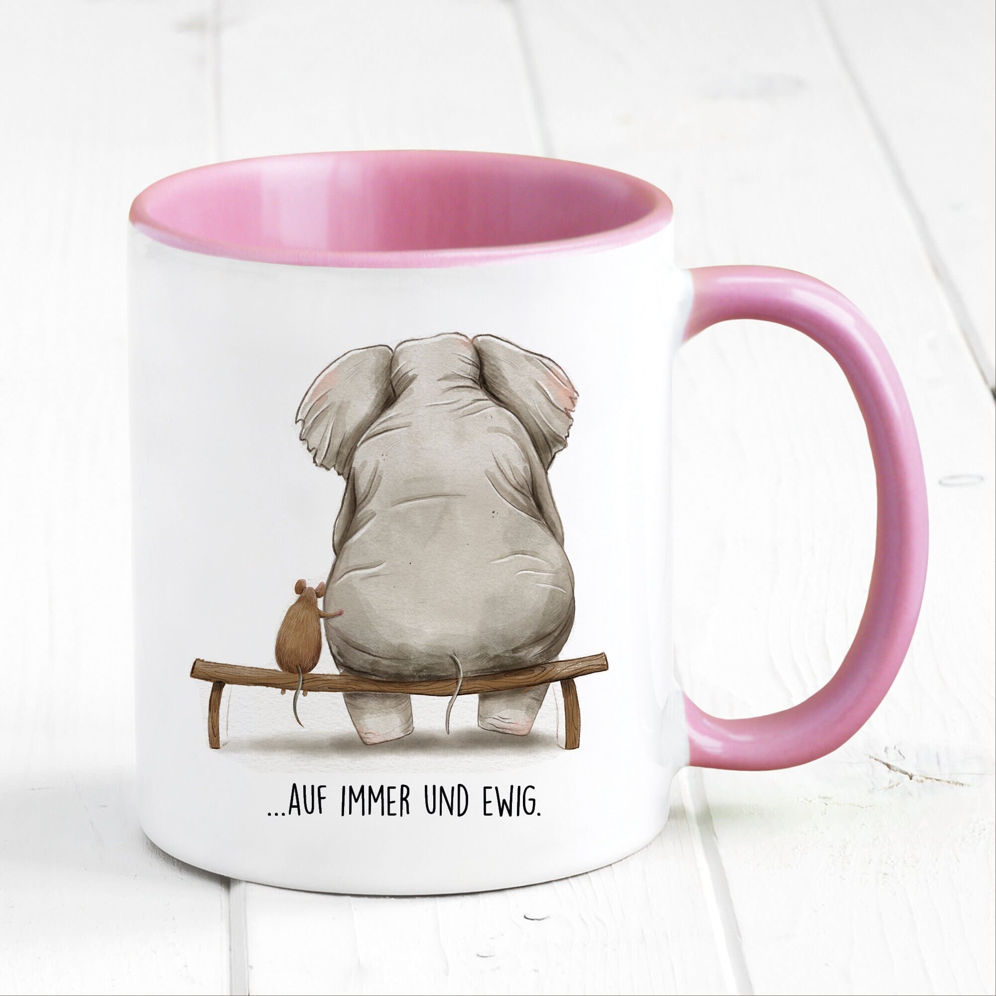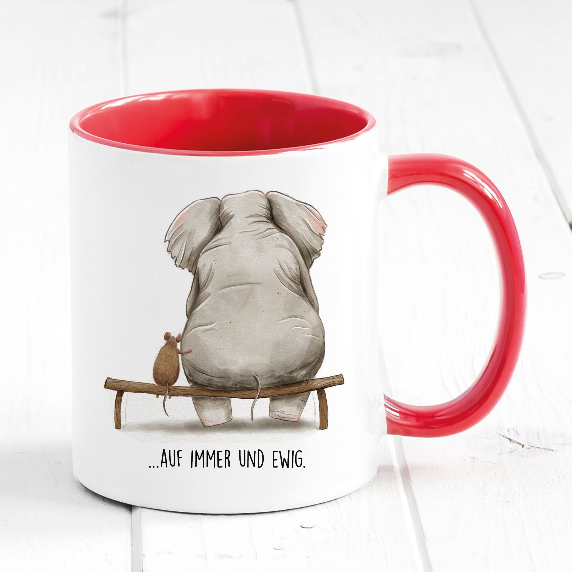 Bedruckte Tasse Auf immer und ewig mit Maus und Elefant, Geschenk Geburtstag Kaffeetasse Kaffeebecher Liebe Freundschaft