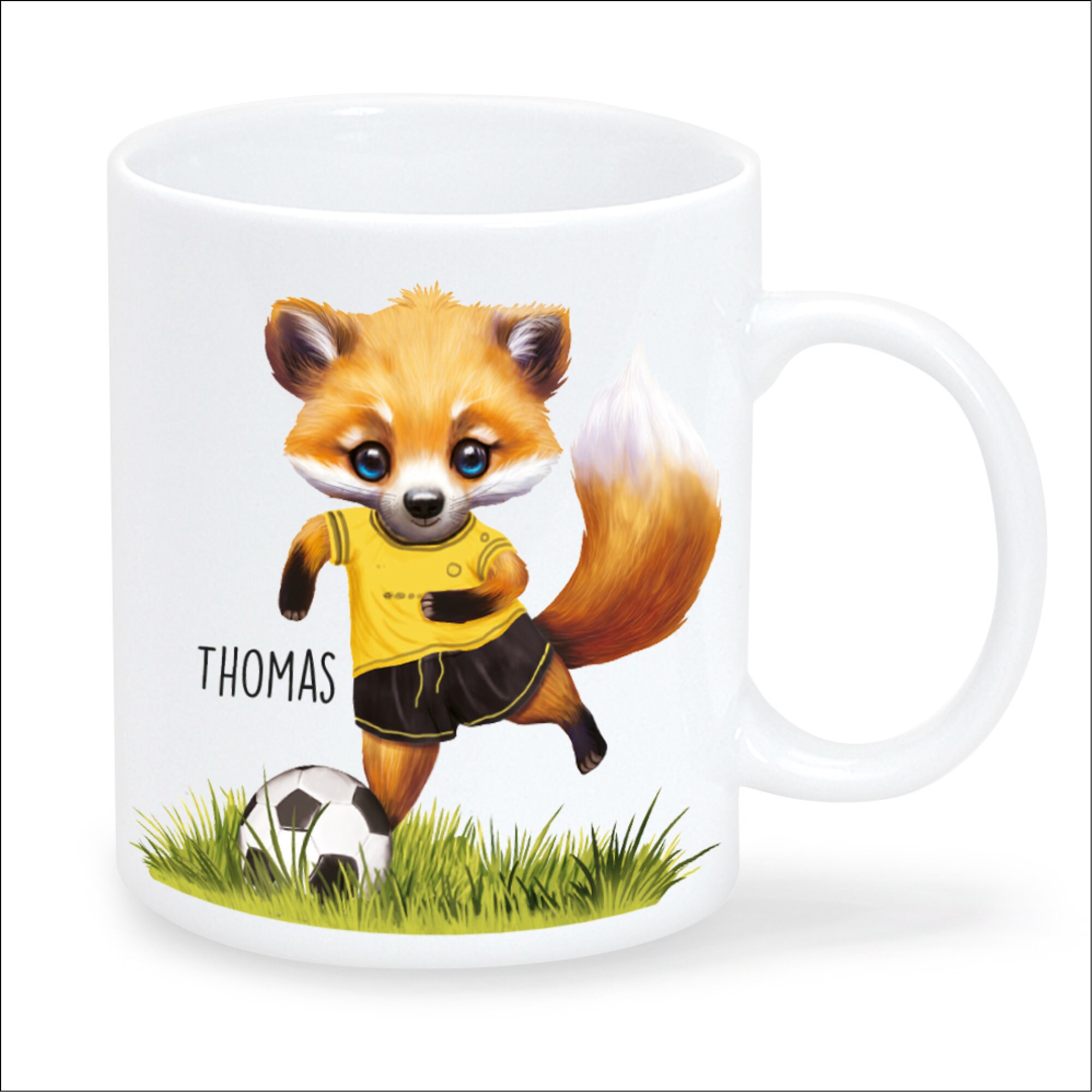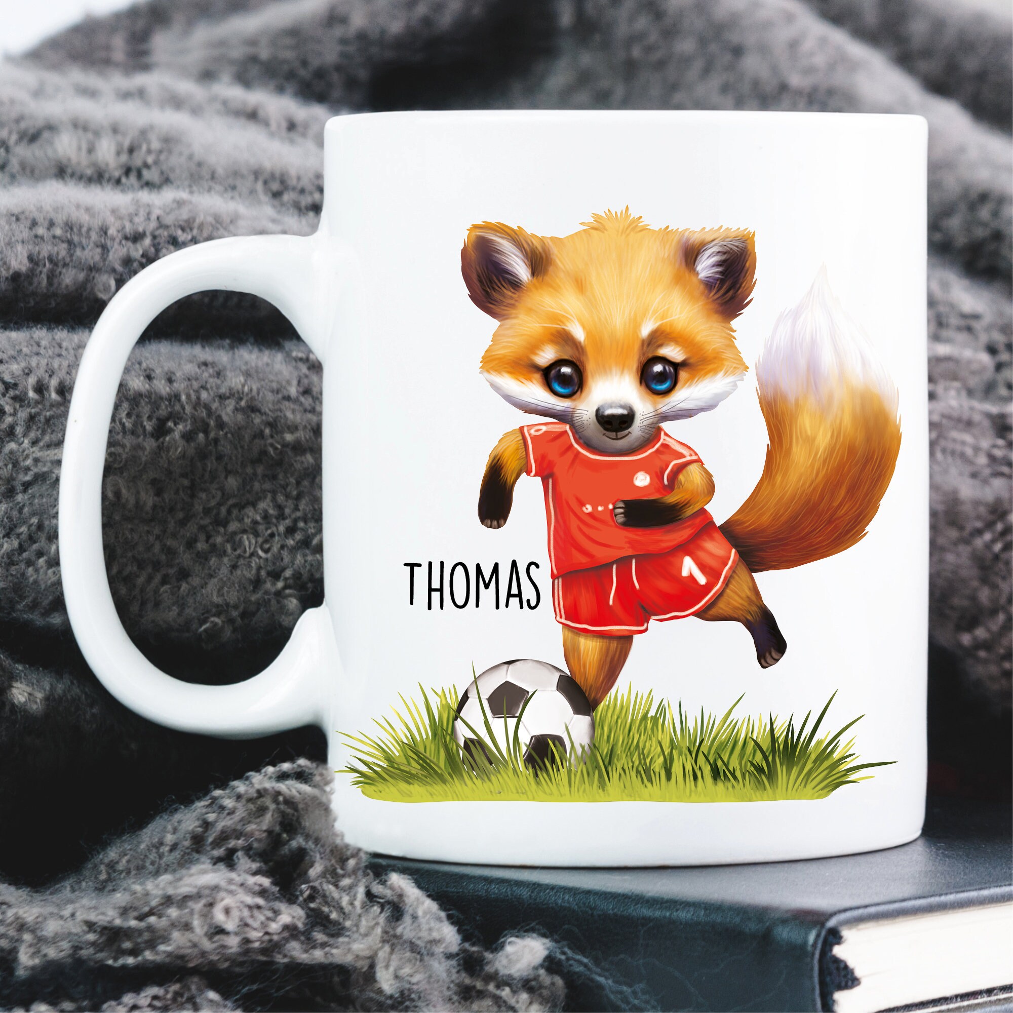 Bedruckte Tasse Becher Fuchs Fußballfan personalisiert mit Wunschname, Geschenk Geburtstag Fußballer