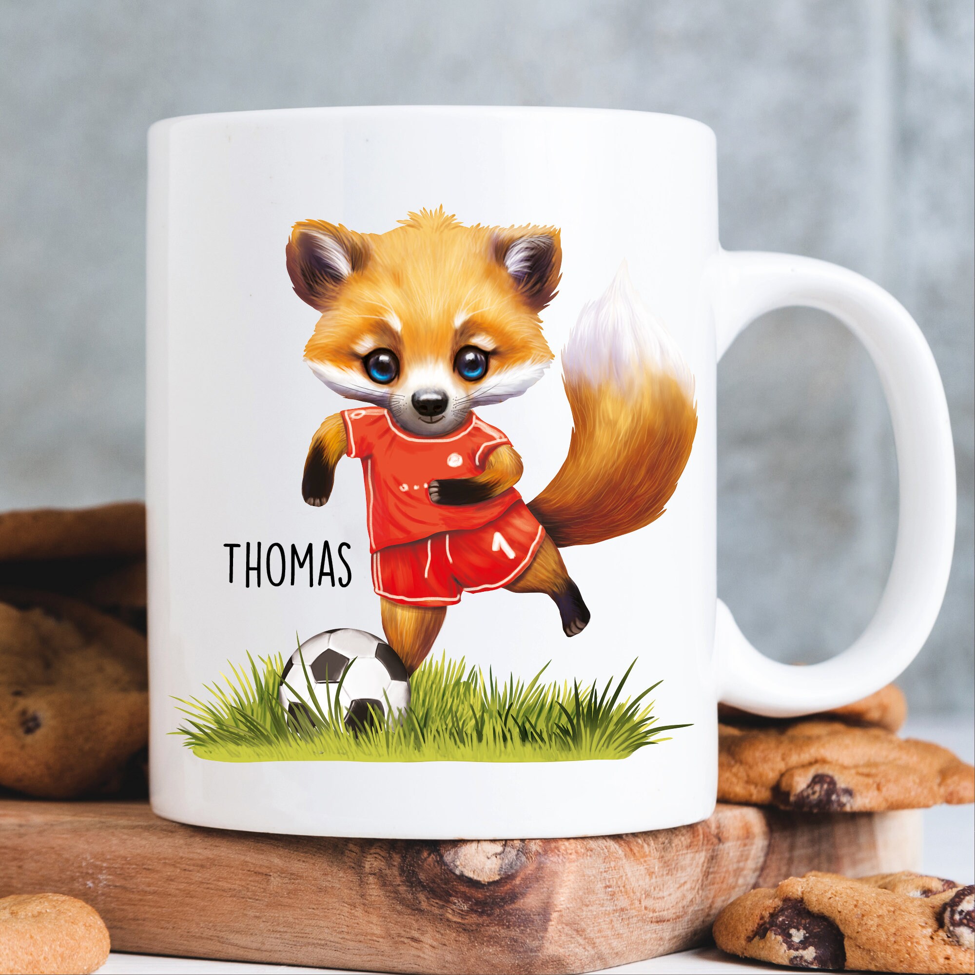Auf dem Bild ist das Produkt: Bedruckte Tasse Becher Fuchs Fussballfan personalisiert mit Wunschname, Geschenk Geburtstag zum Preis von €17.90 abgebildet.
