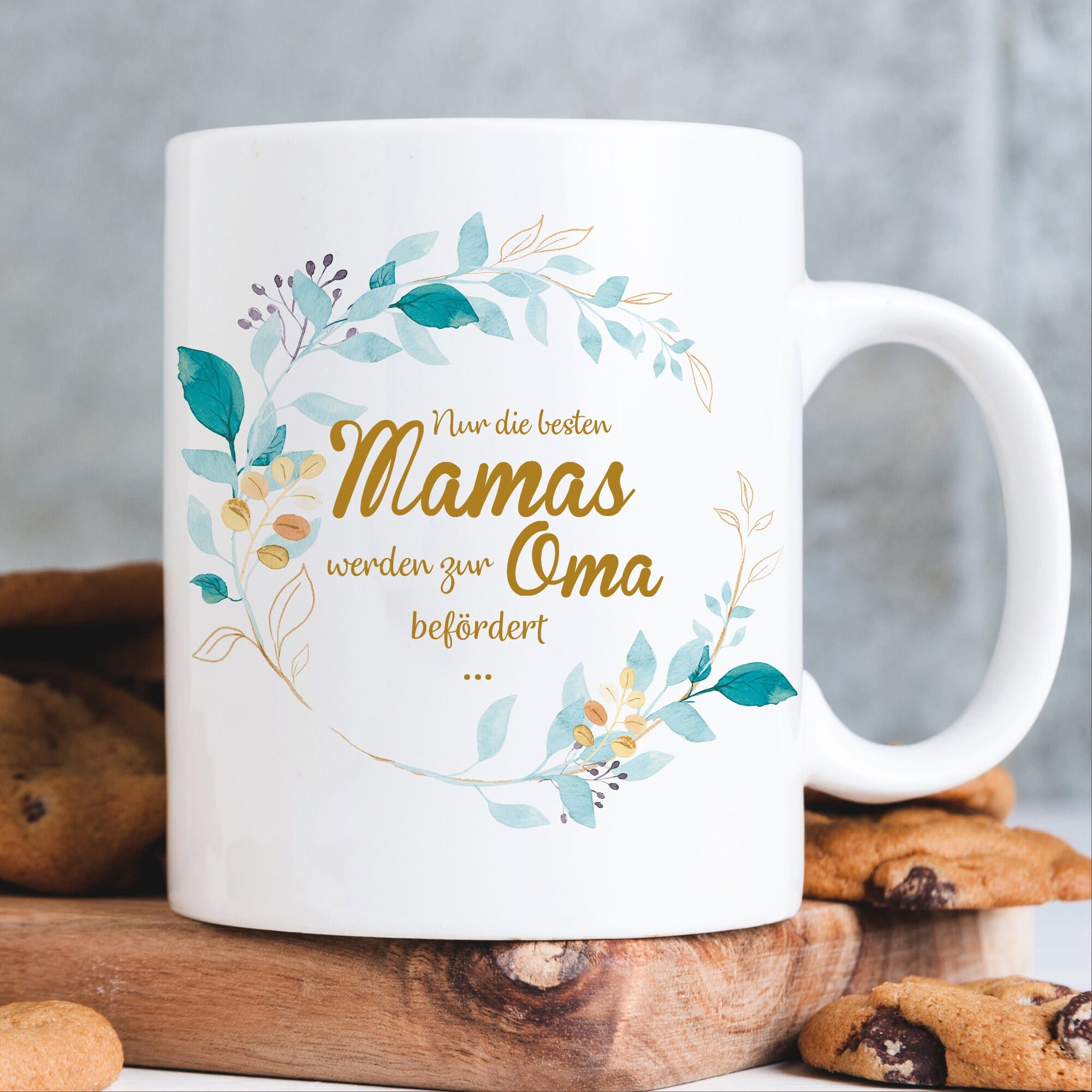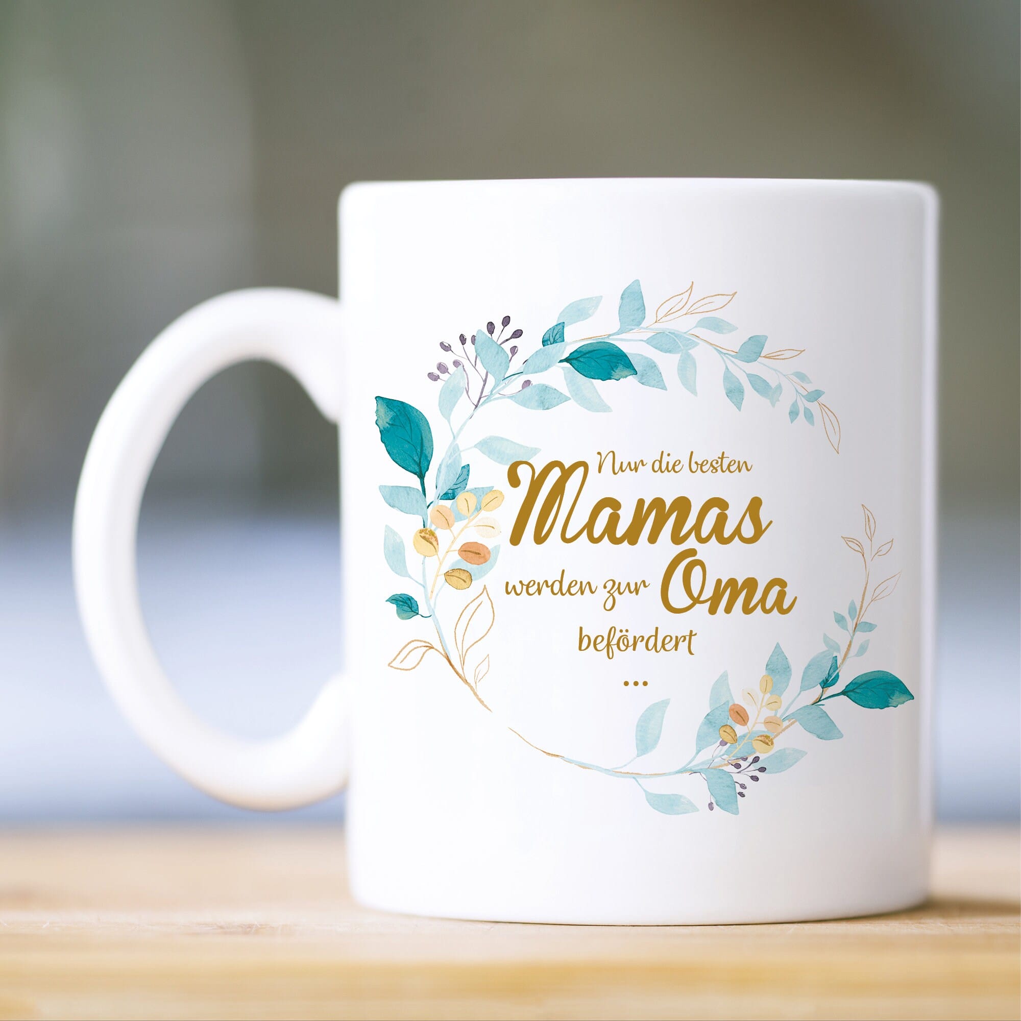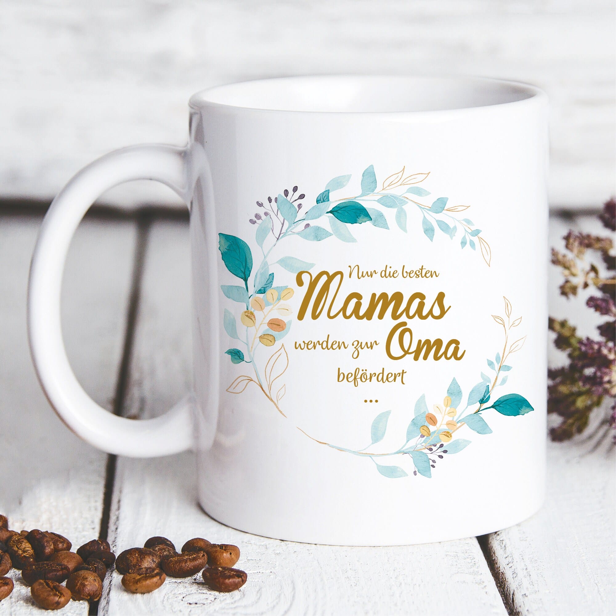 Wer zur Geburt des Enkelkindes die Großmutter überraschen möchte, ist mit diesem Kaffeebecher mit Spruch bestens beraten. Die beidseitig bedruckte weiße Keramiktasse trägt als Motiv einen hübschen Blätterkranz mit dem Spruch „Nur die besten Mamas werden zu Omas befördert …“