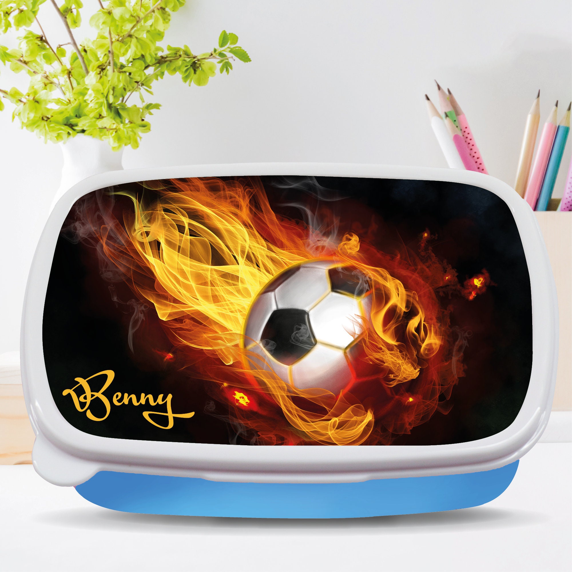 Brotdose Fußball Feuer personalisiert mit Wunschnamen Schule Geschenk Einschulung, Geschenk Geburtstag, Einschulungsgeschenk
