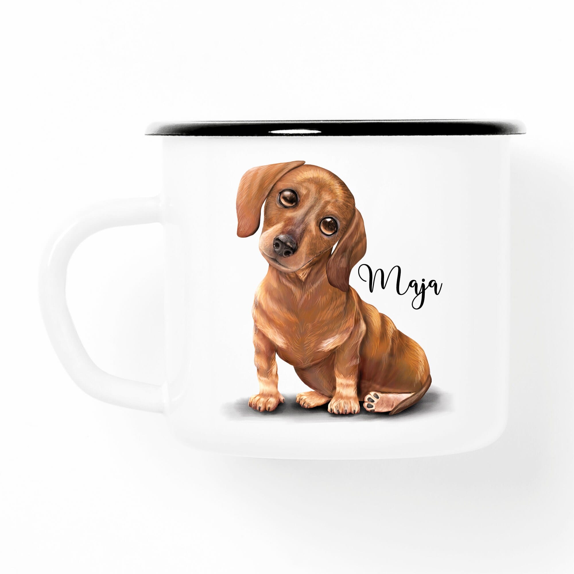 Campingbecher Emaille Hund Dackel mit Wunschname Emaille Tasse, personalisiertes Geschenk