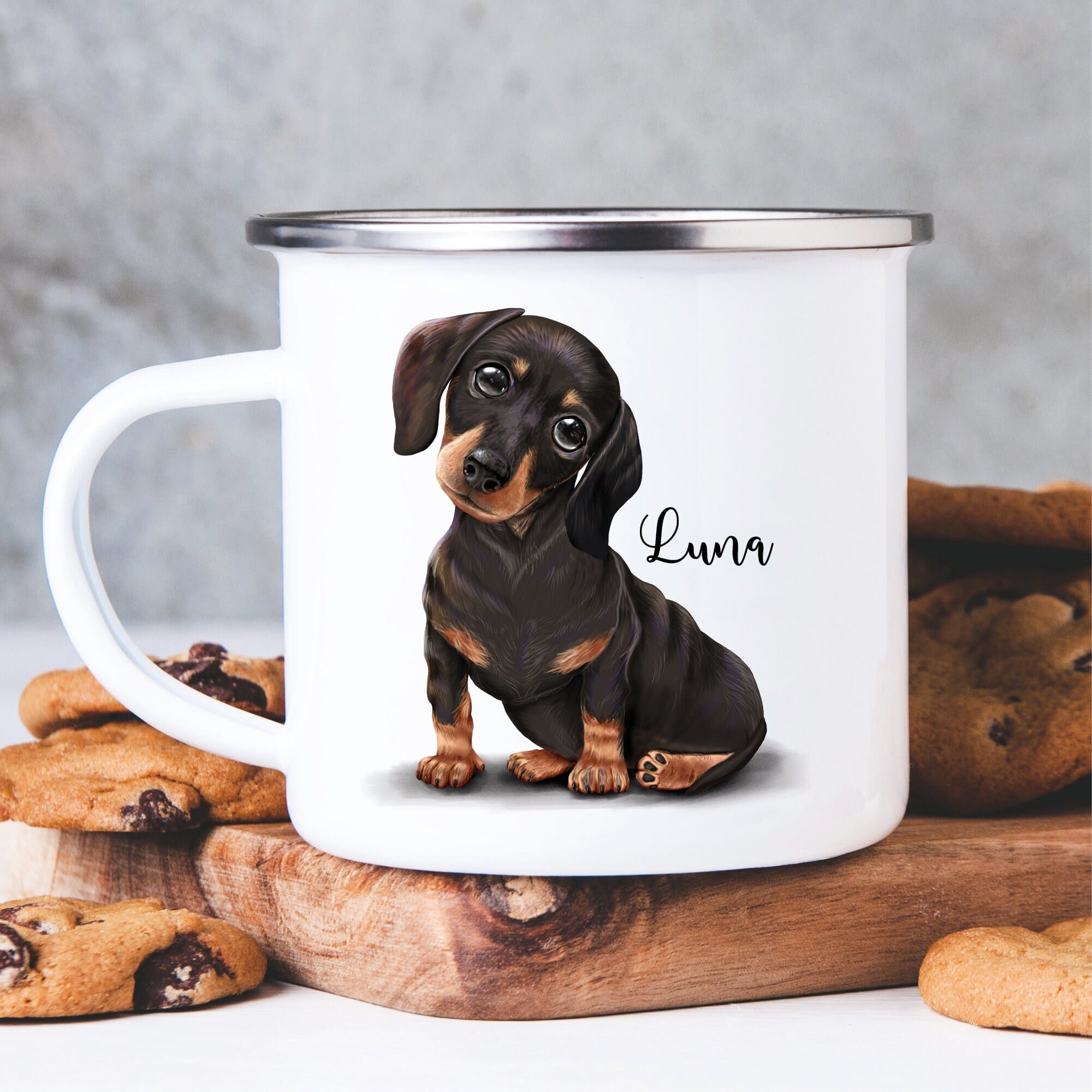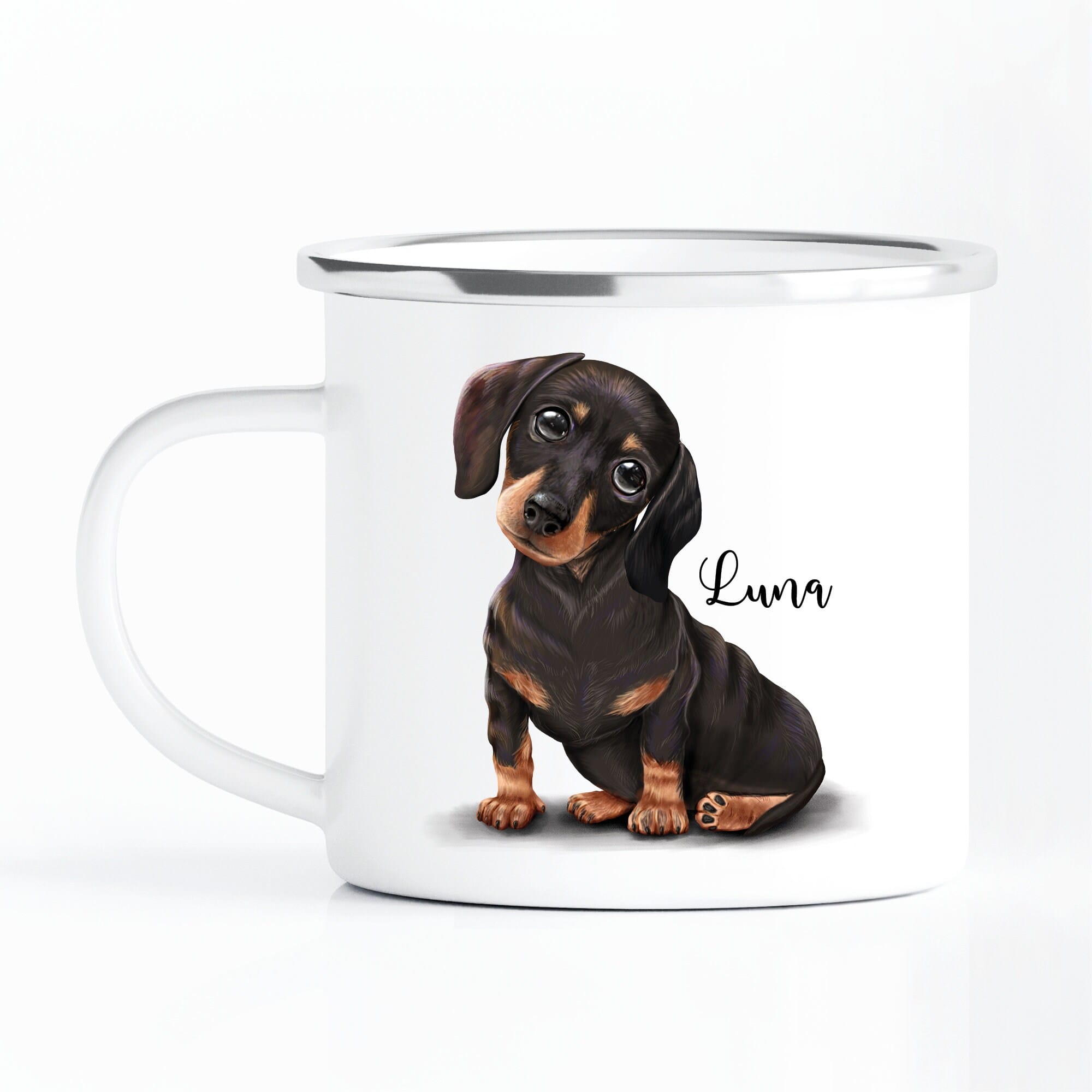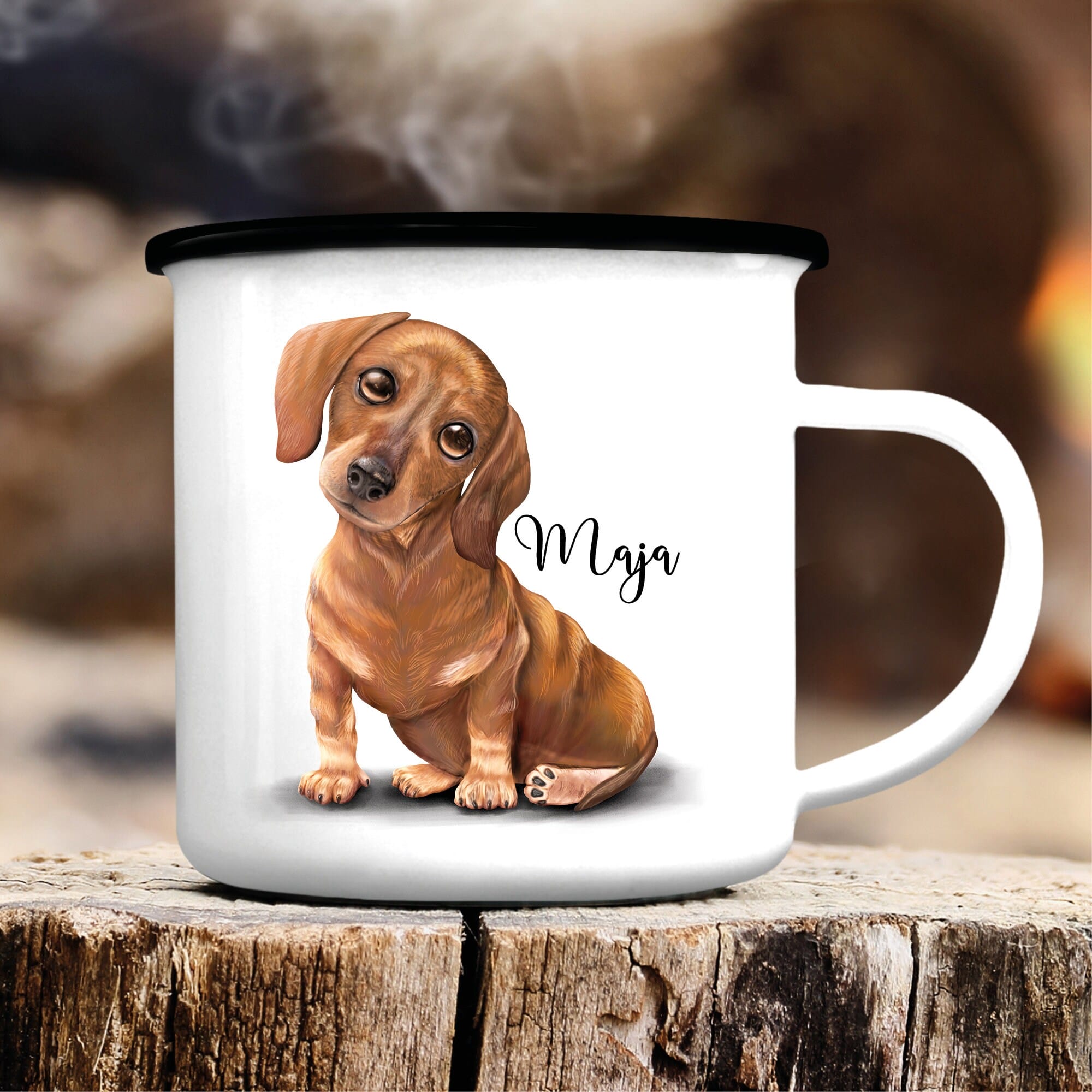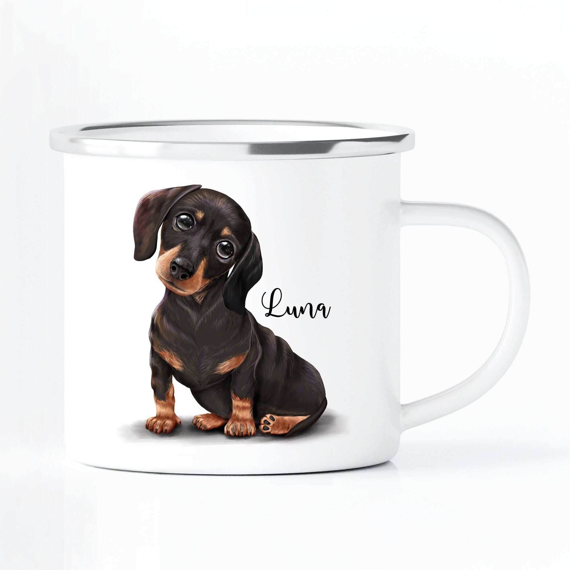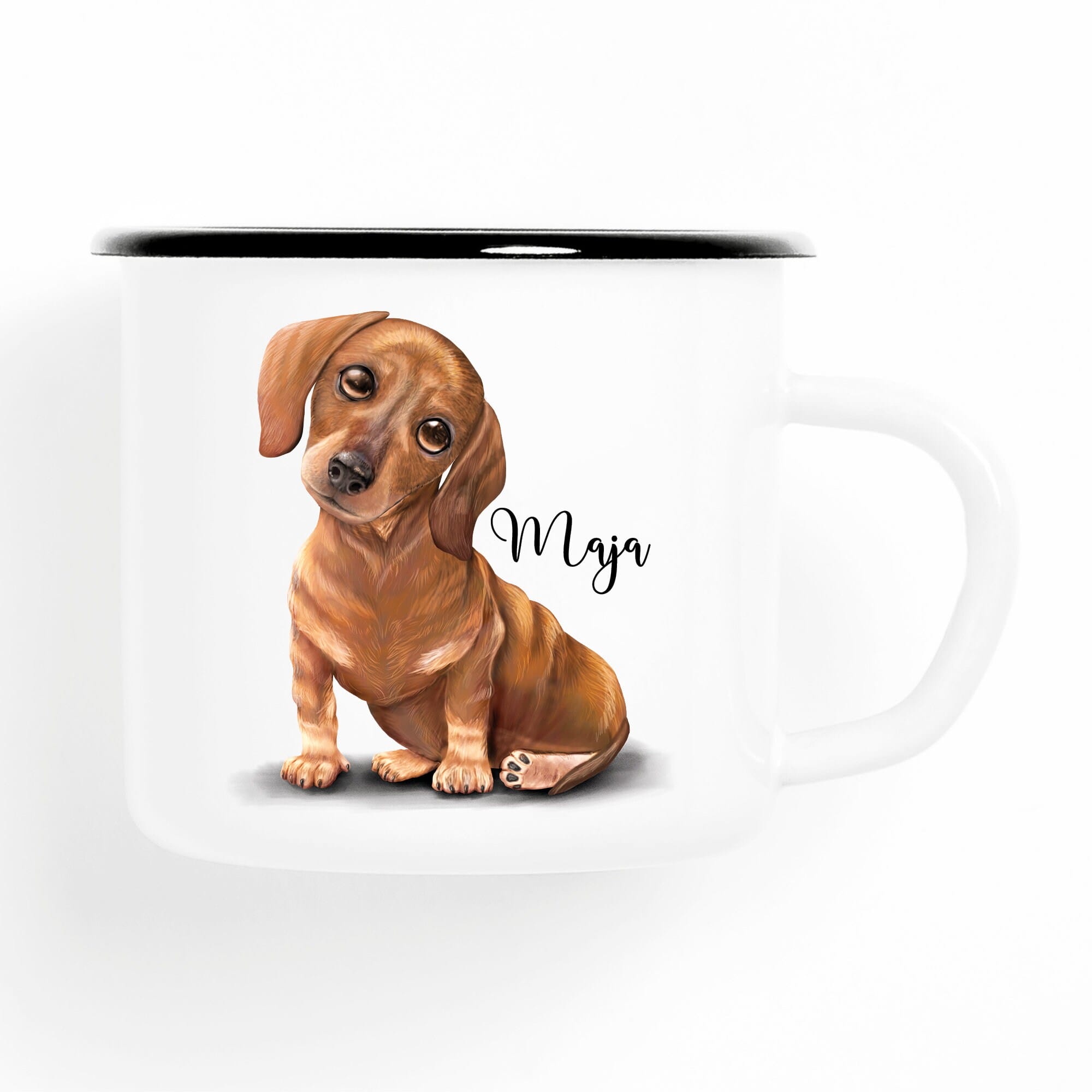 Campingbecher Emaille Hund Dackel mit Wunschname Emaille Tasse, personalisiertes Geburtstagsgeschenk