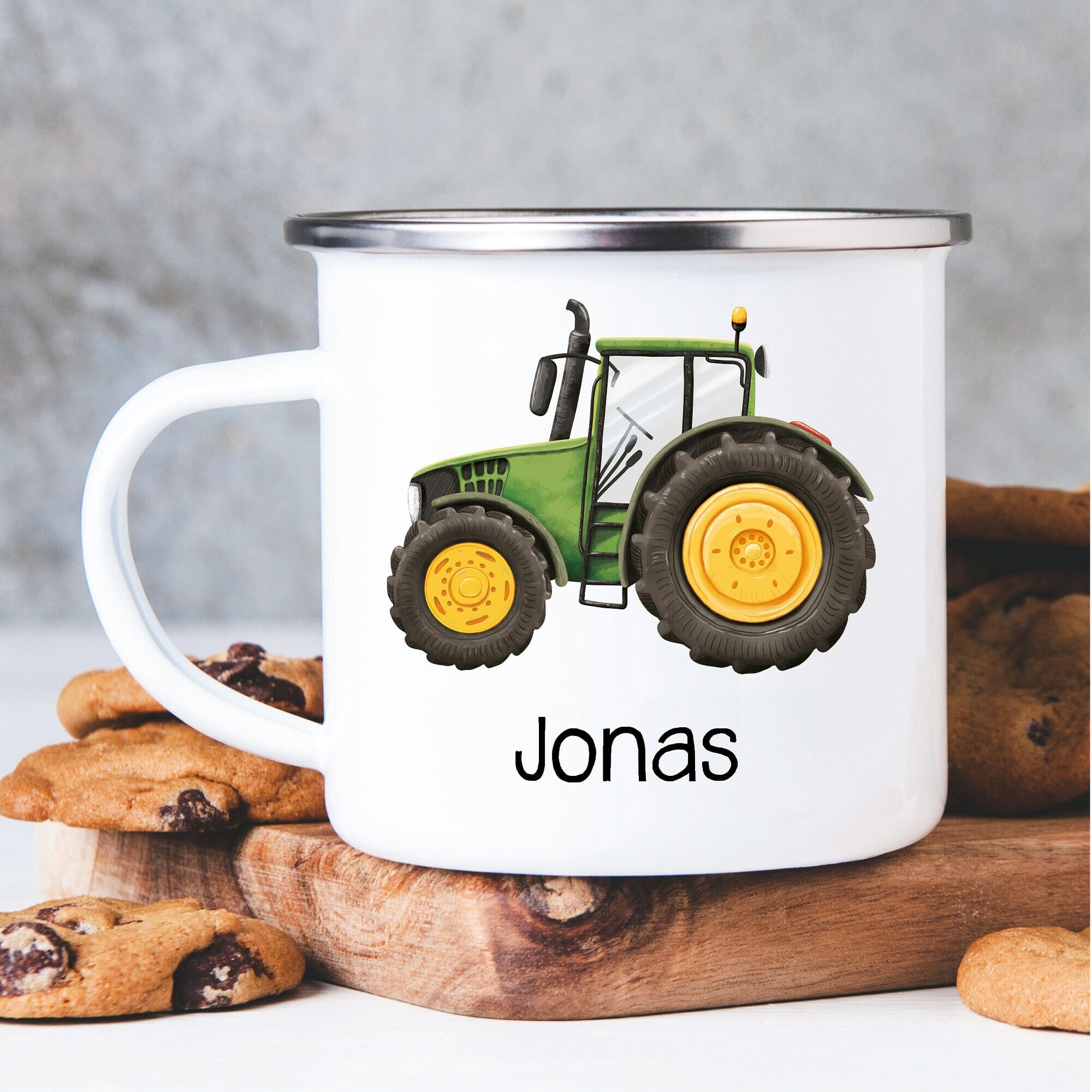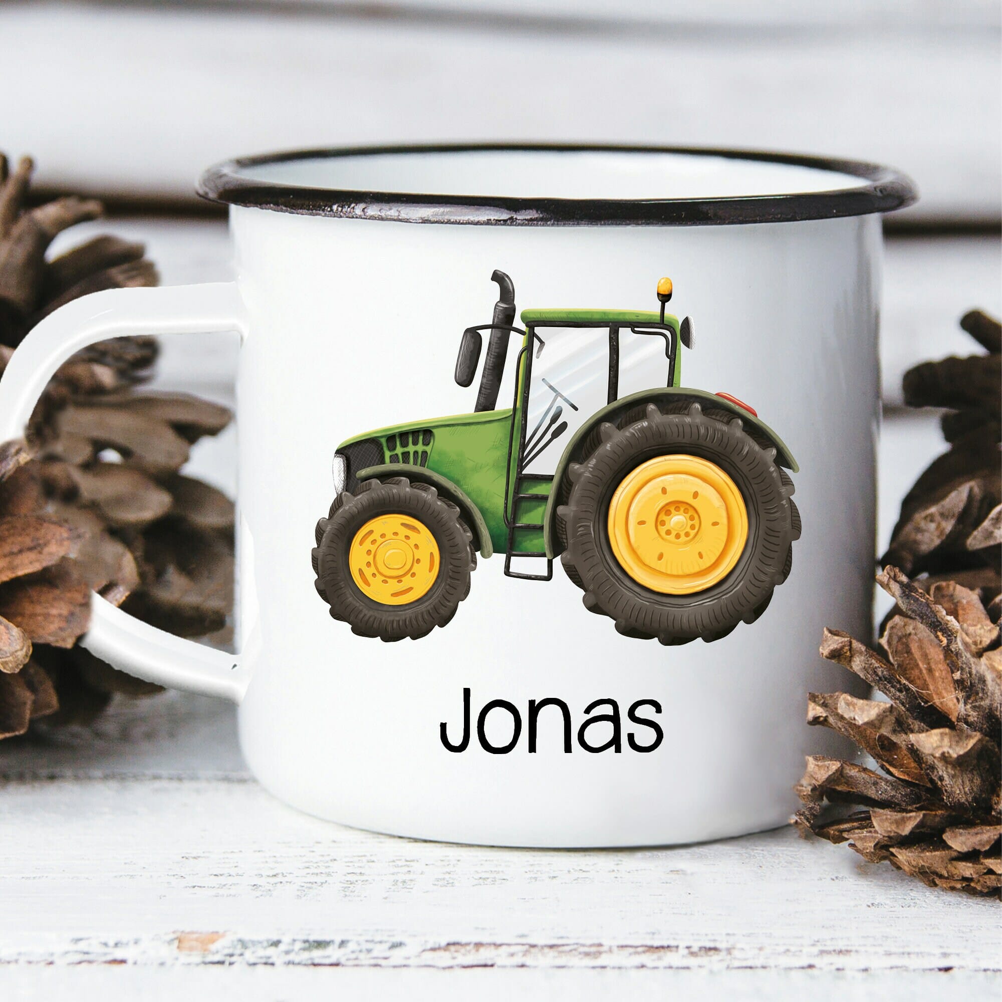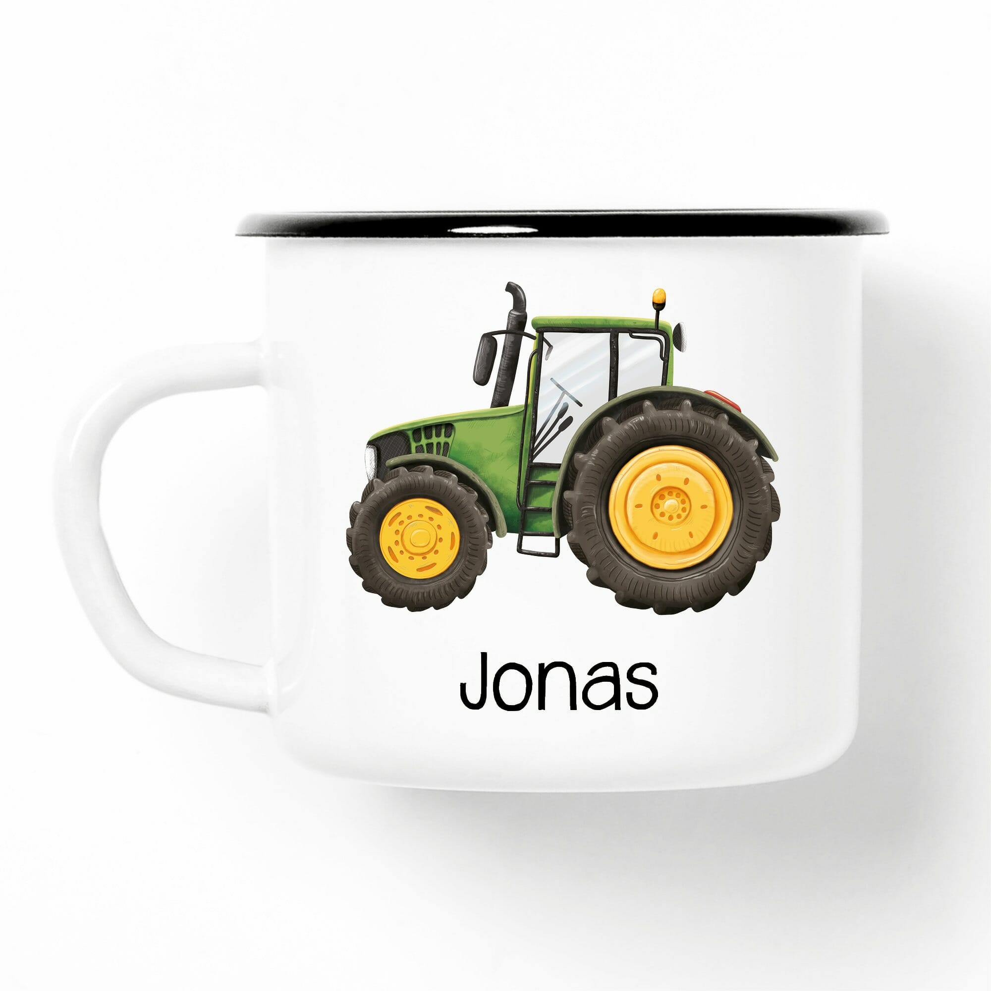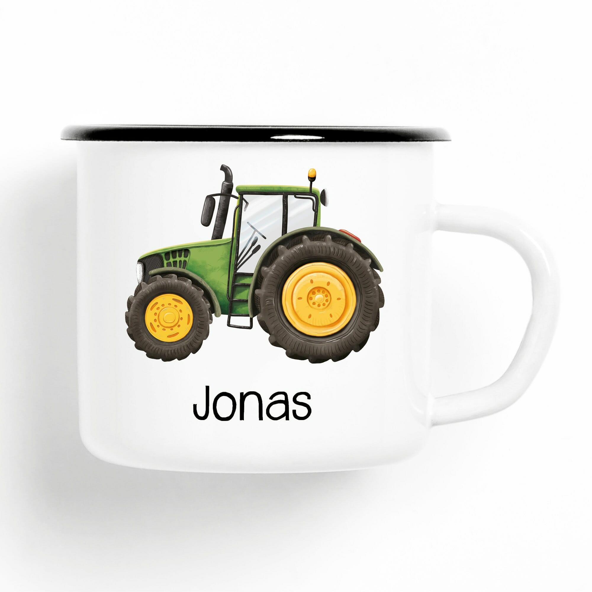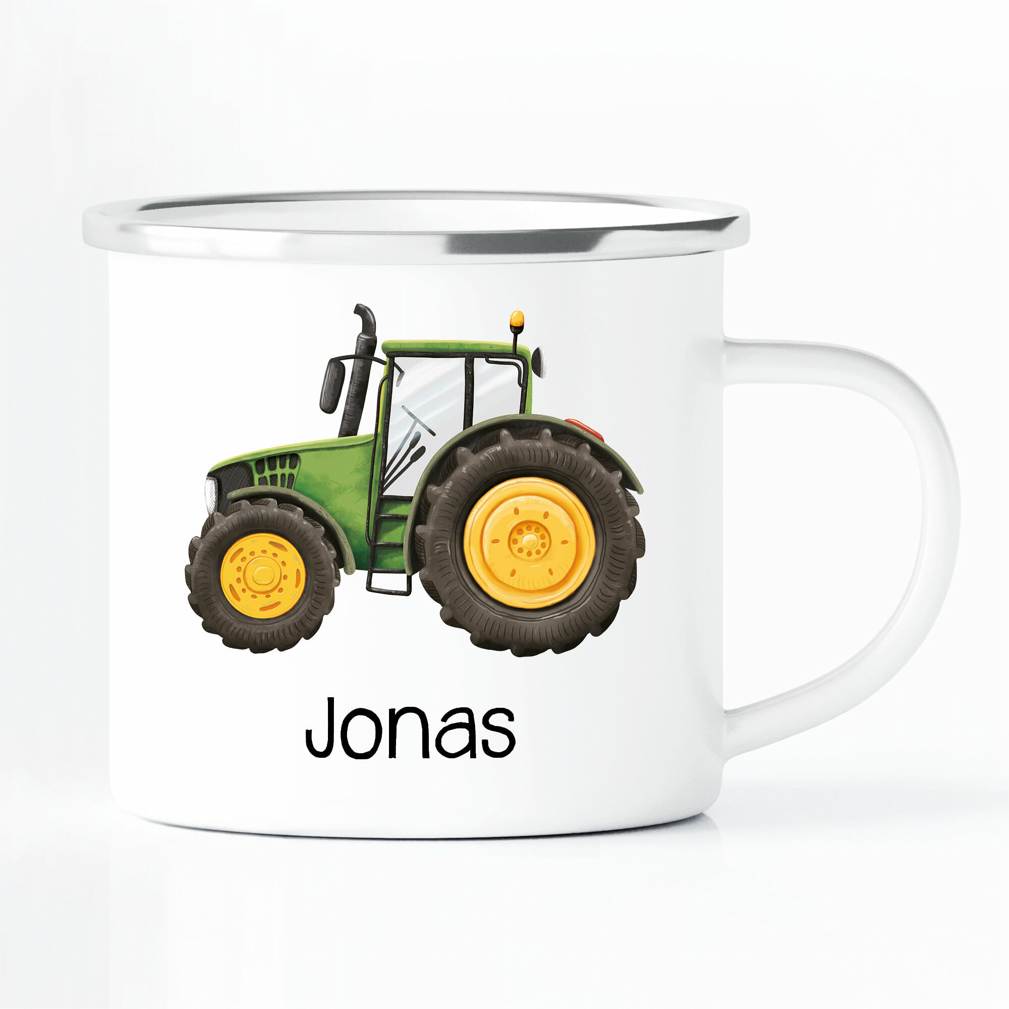 Campingbecher Emaille mit einem grünen Traktor Trecker personalisiert mit Wunschname Geschenk Junge