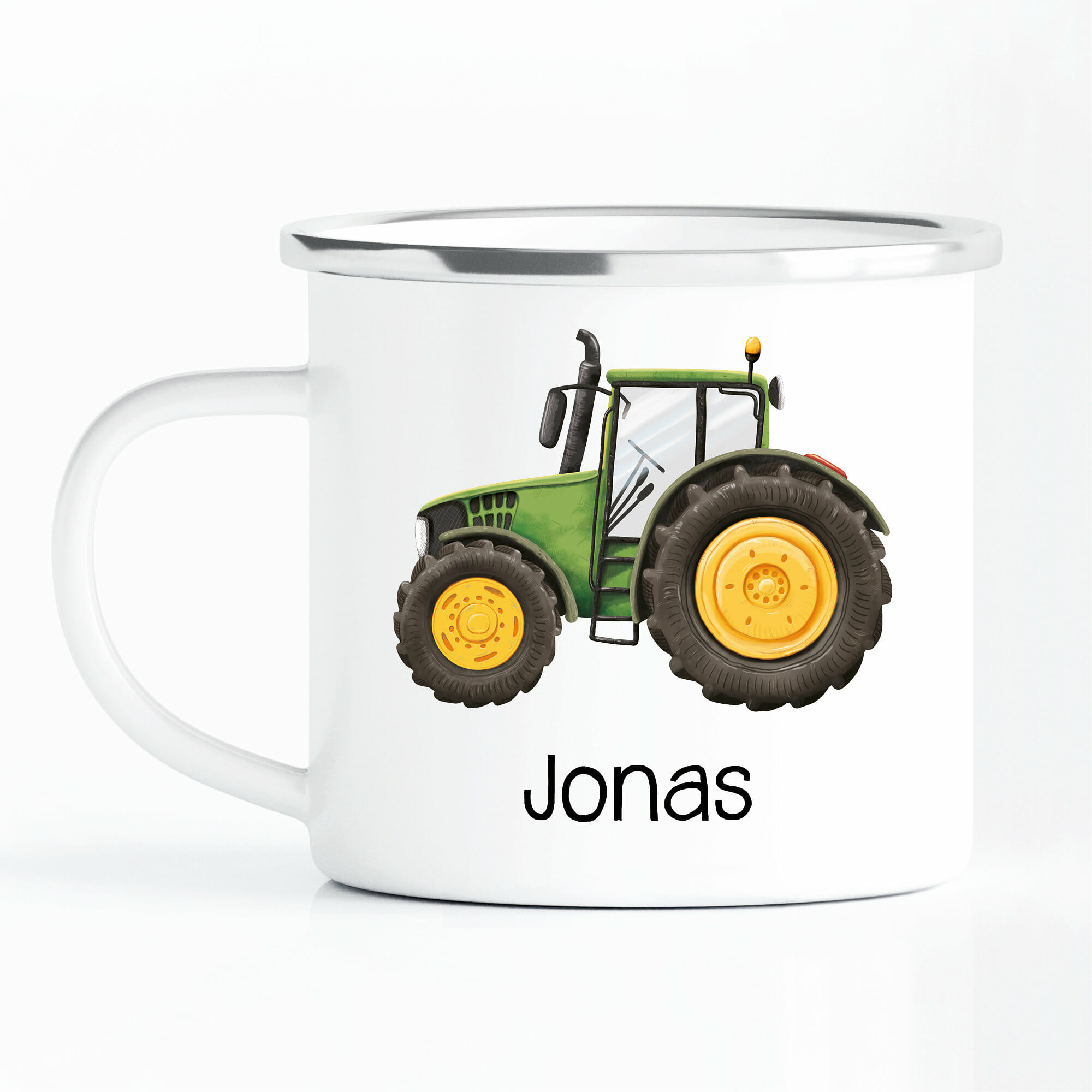 Campingbecher Emaille mit einem grünen Traktor bzw. Trecker, personalisiert mit Wunschname, Geschenk Junge