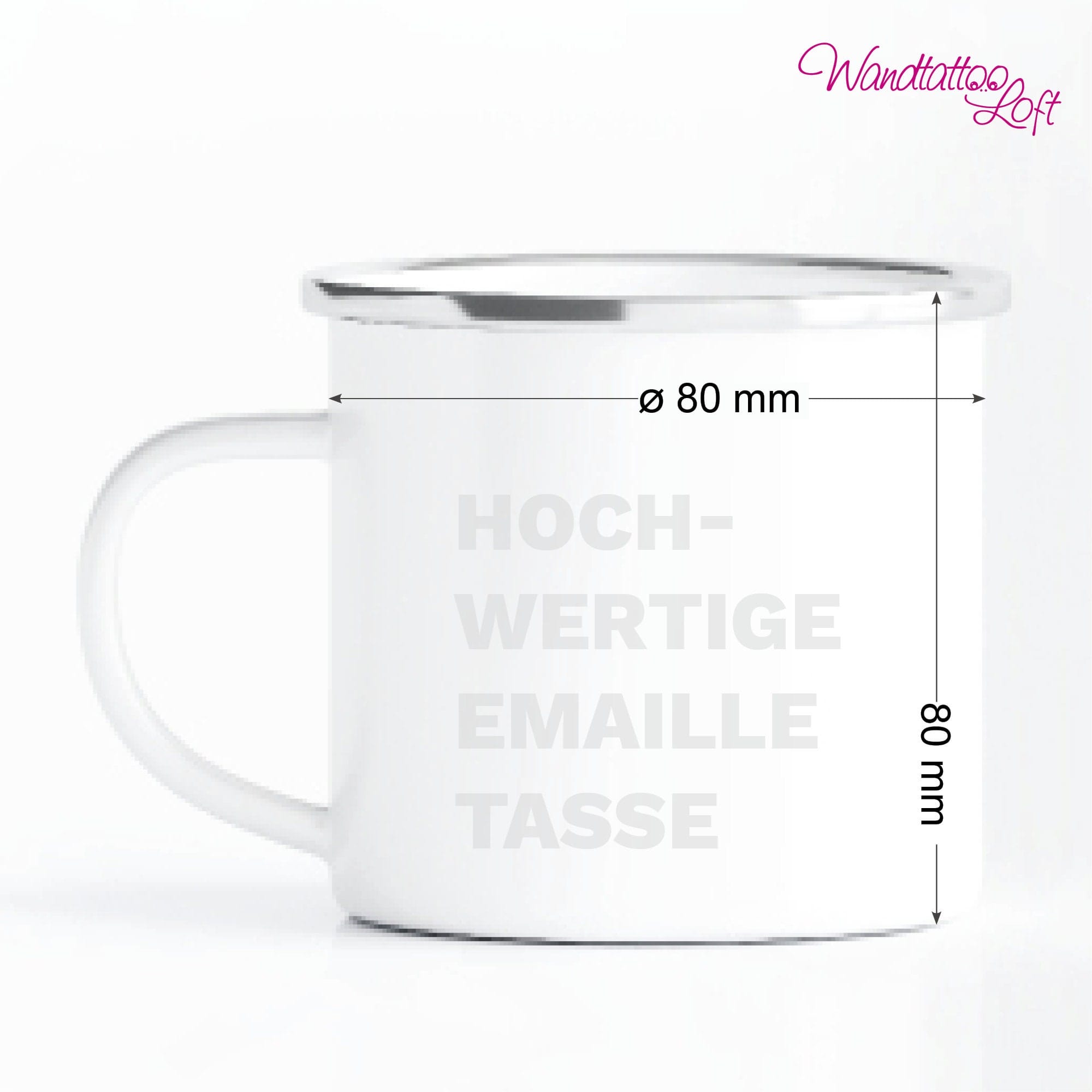 Emailletasse weiß mit hochwertigem Aufdruck und schwarzem oder silbernem Edelstahlrand