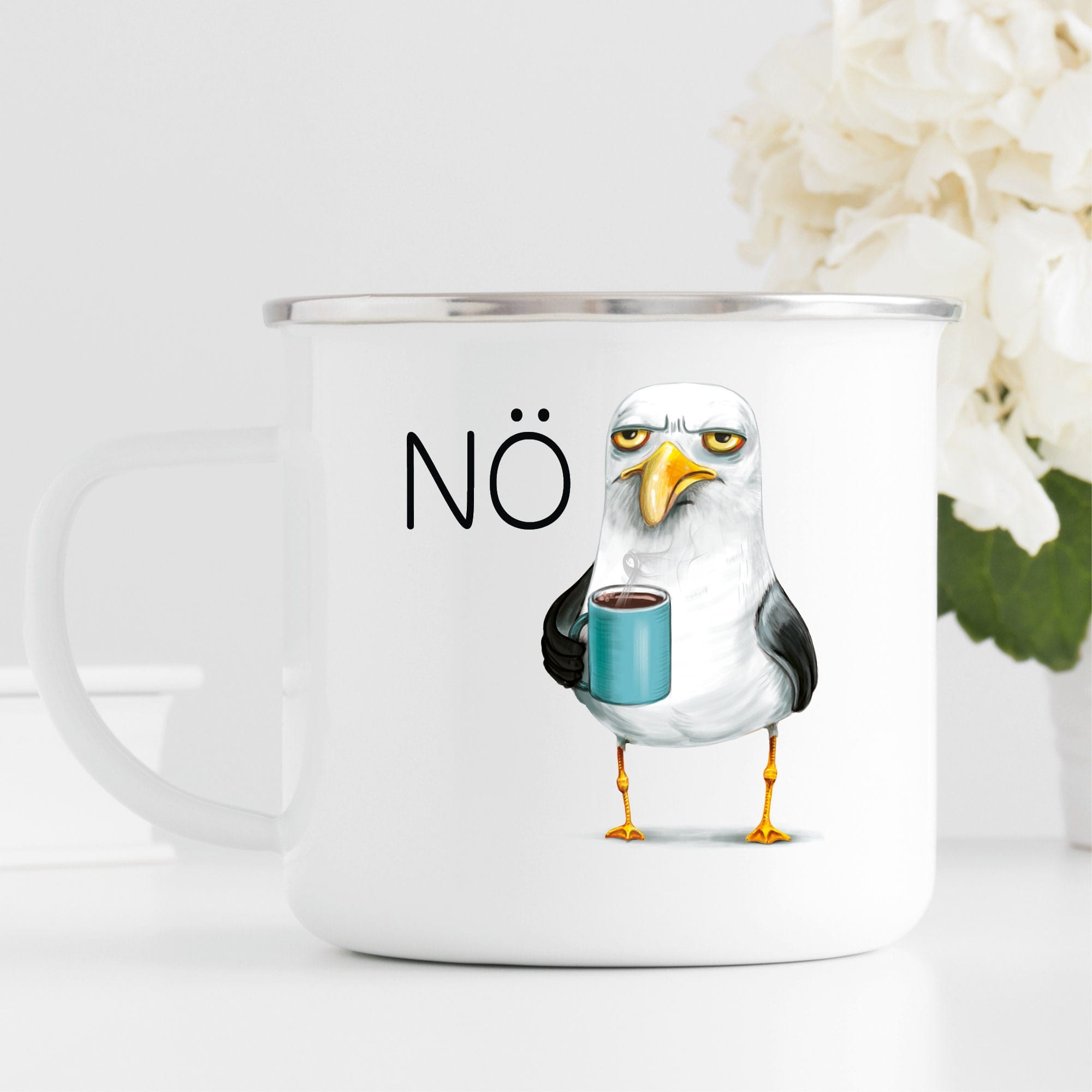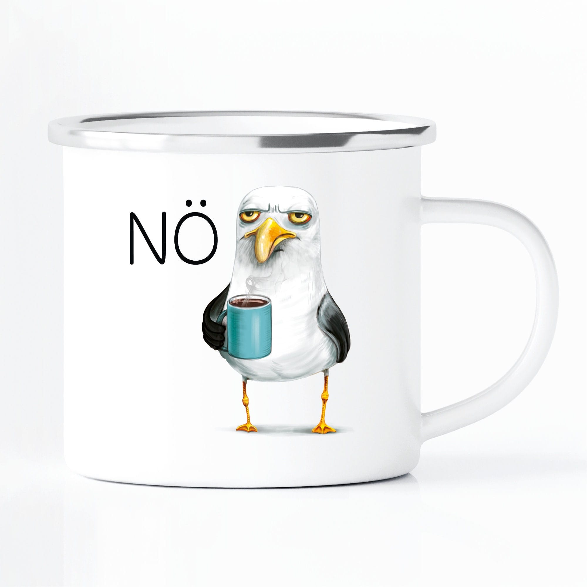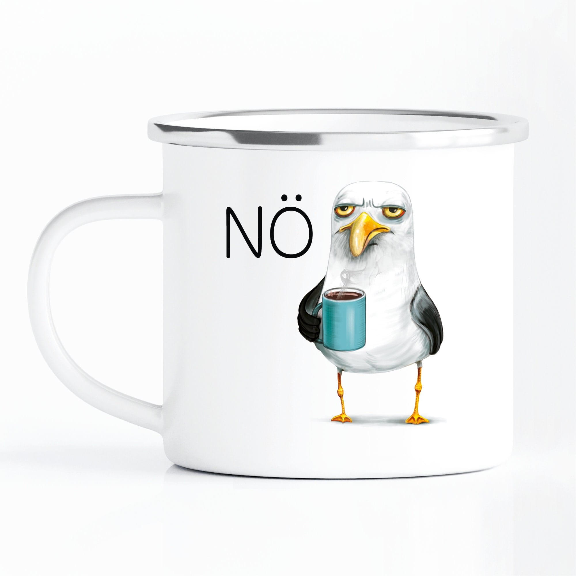 Campingbecher Emaille mit Möwe und Nö Geschenk Geburtstag Freundschaft grimmiger Vogel