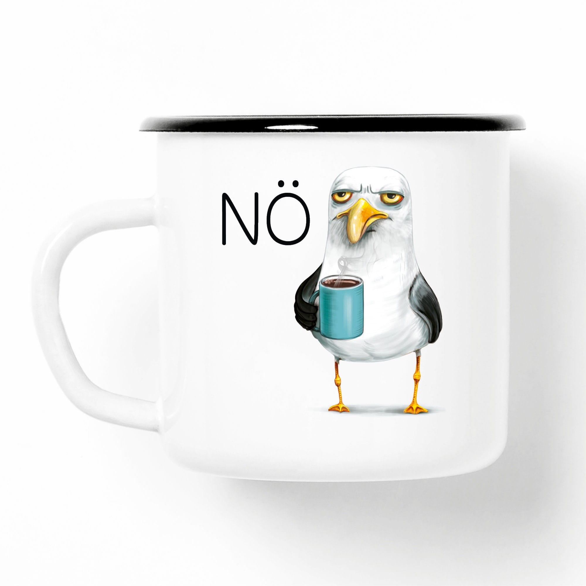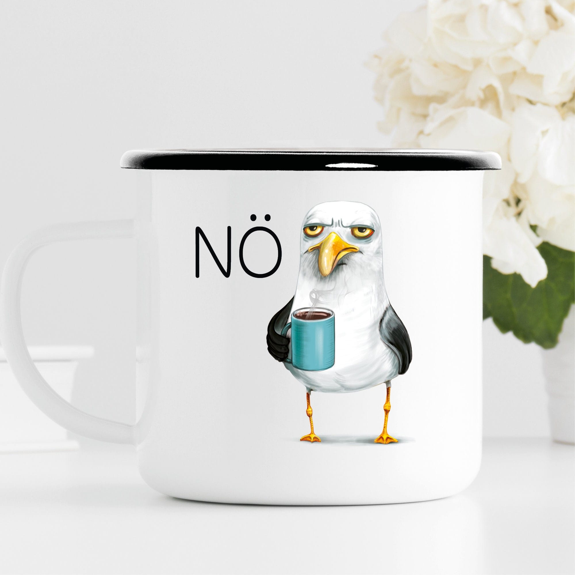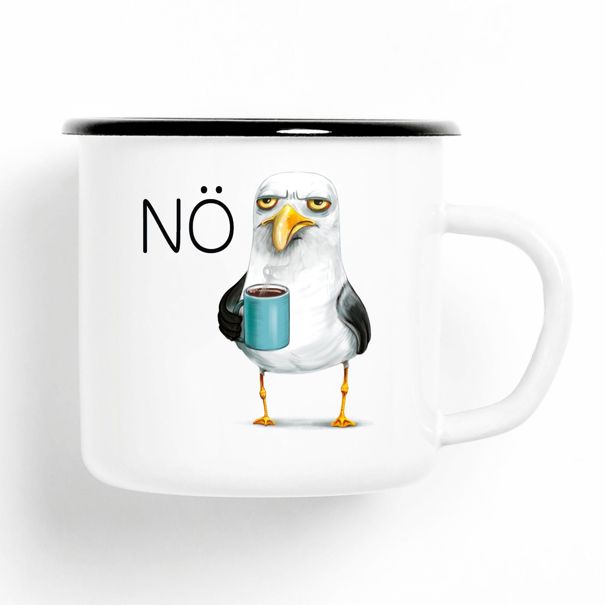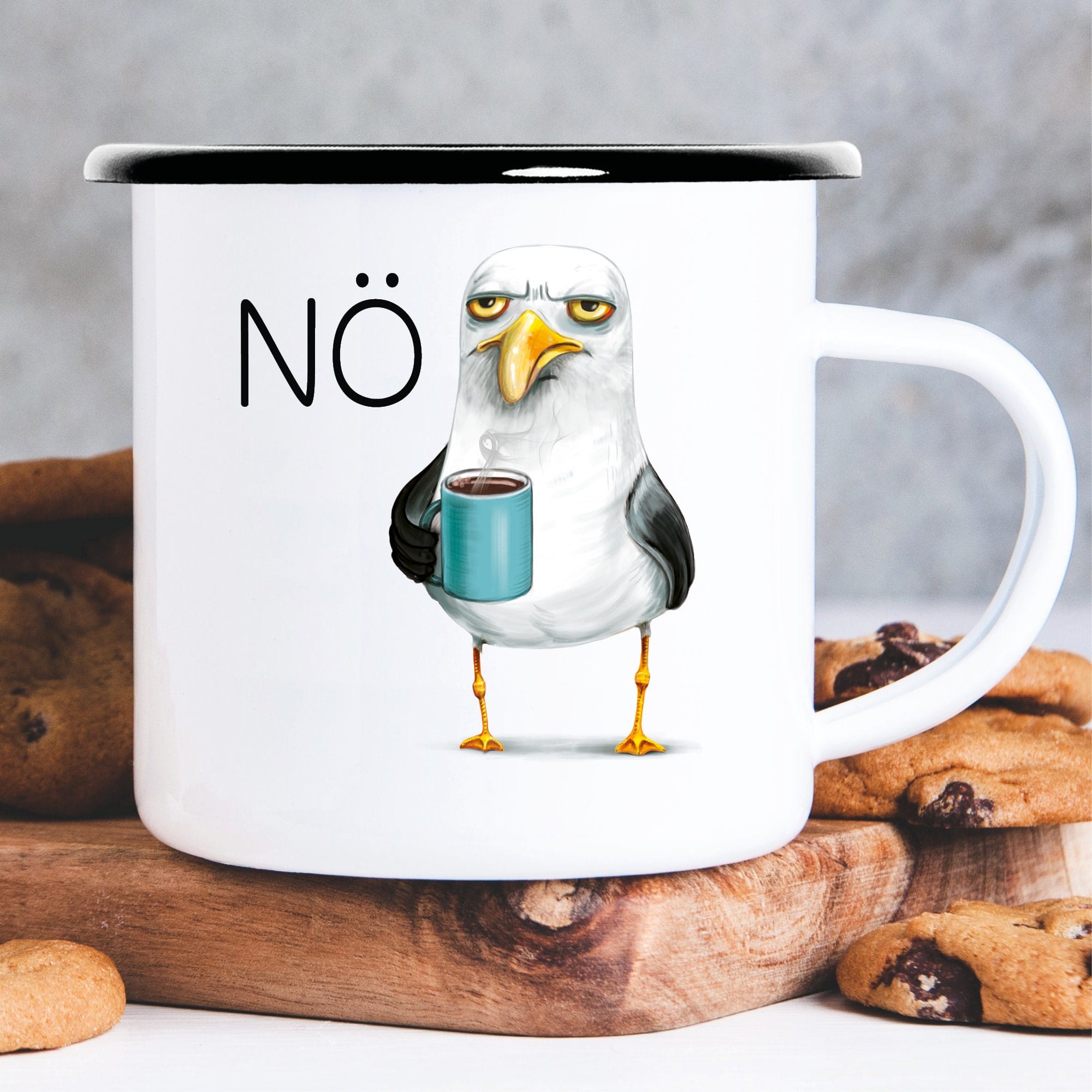 Campingbecher Emaille mit Möwe und Nö Geschenk Geburtstag Freundschaft grimmiger Vogel