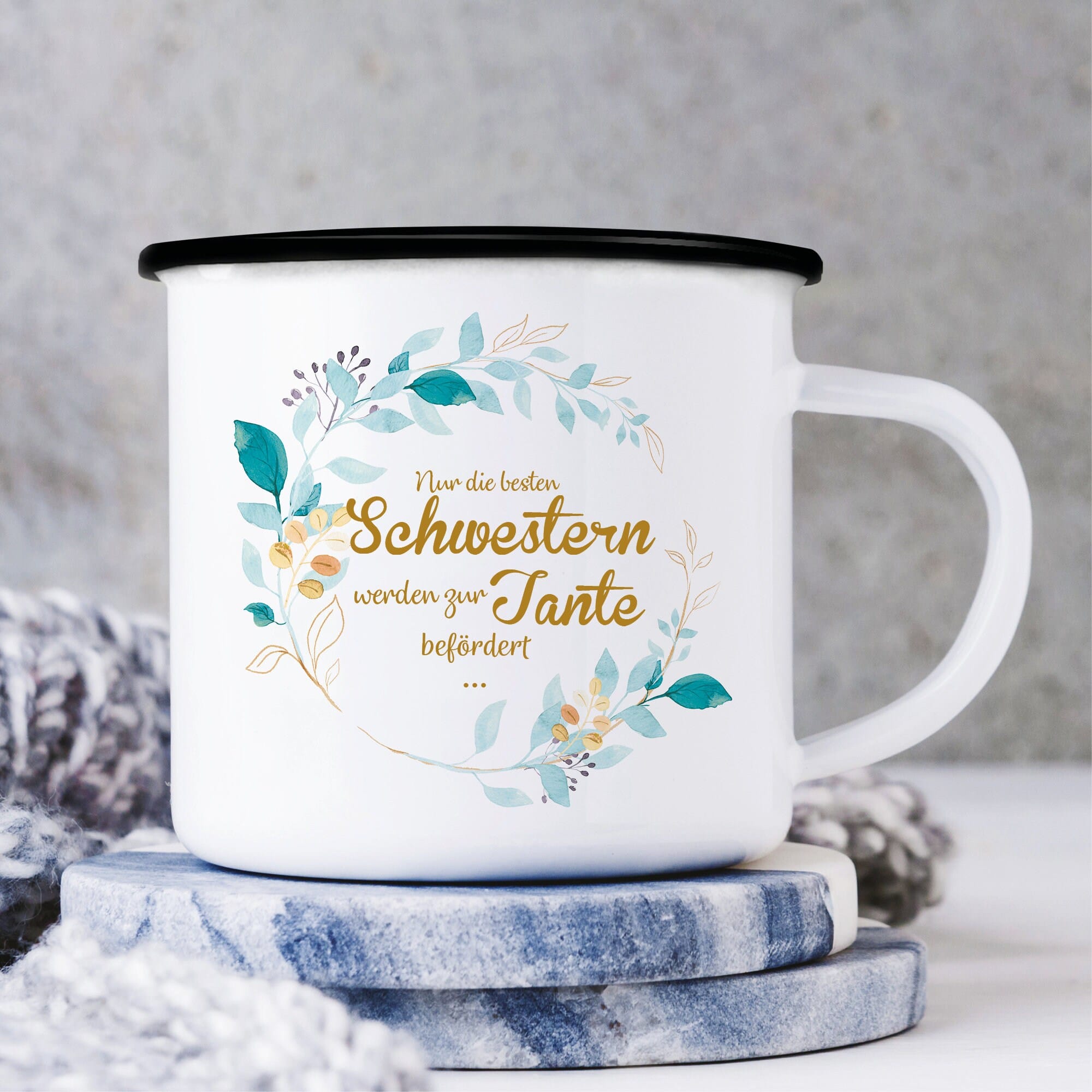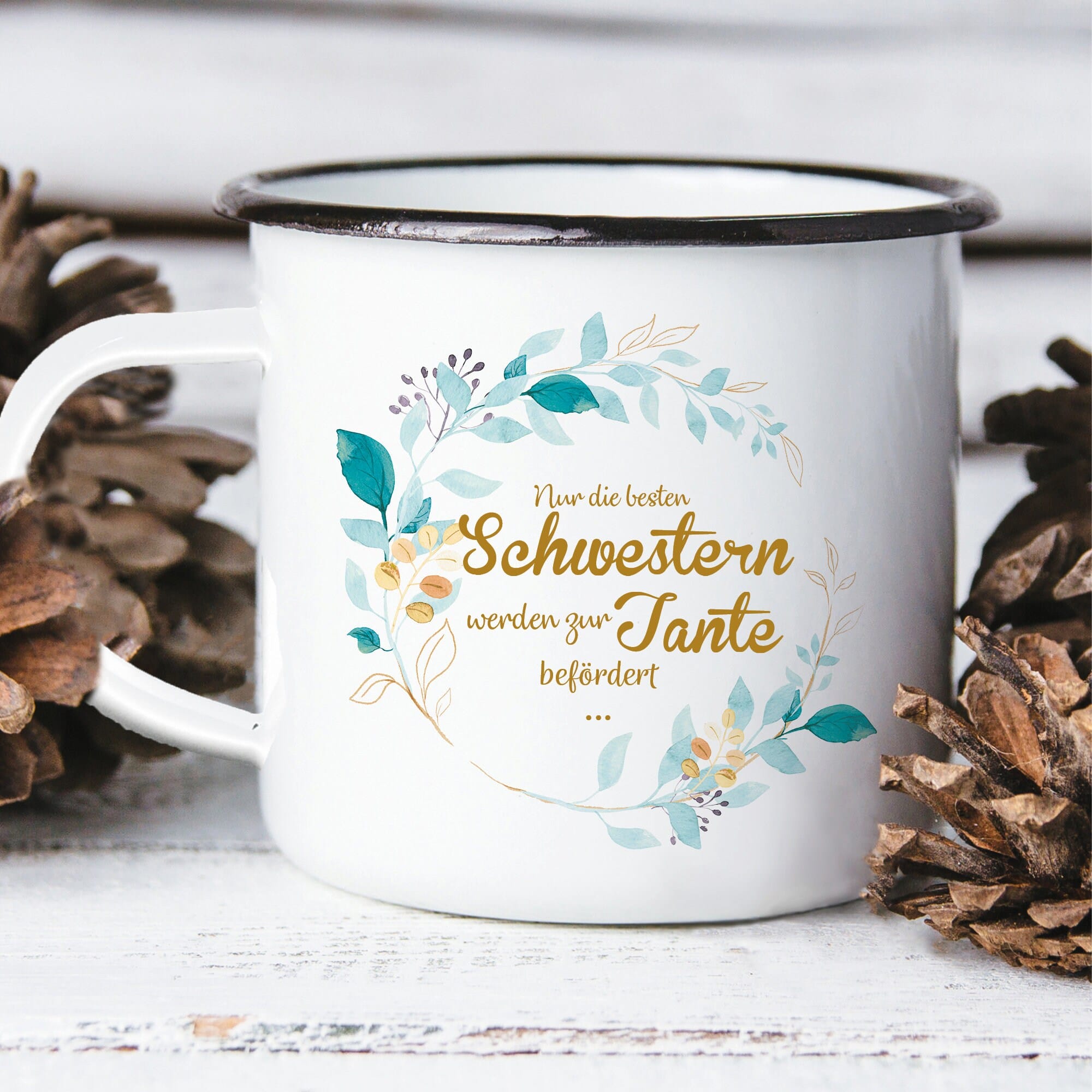 Campingbecher Emaille “Nur die besten Schwestern werden zur Tante befördert…” Geschenk Schwester Tante grüner Blätterkranz, Geschenk zu Weihnachten