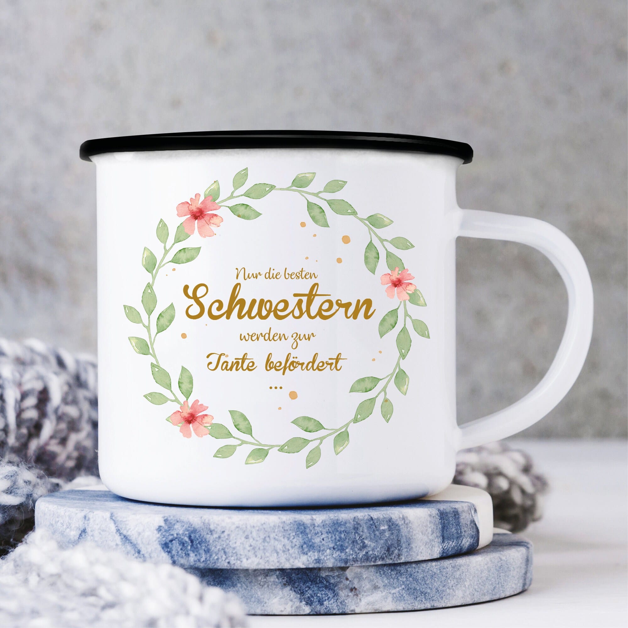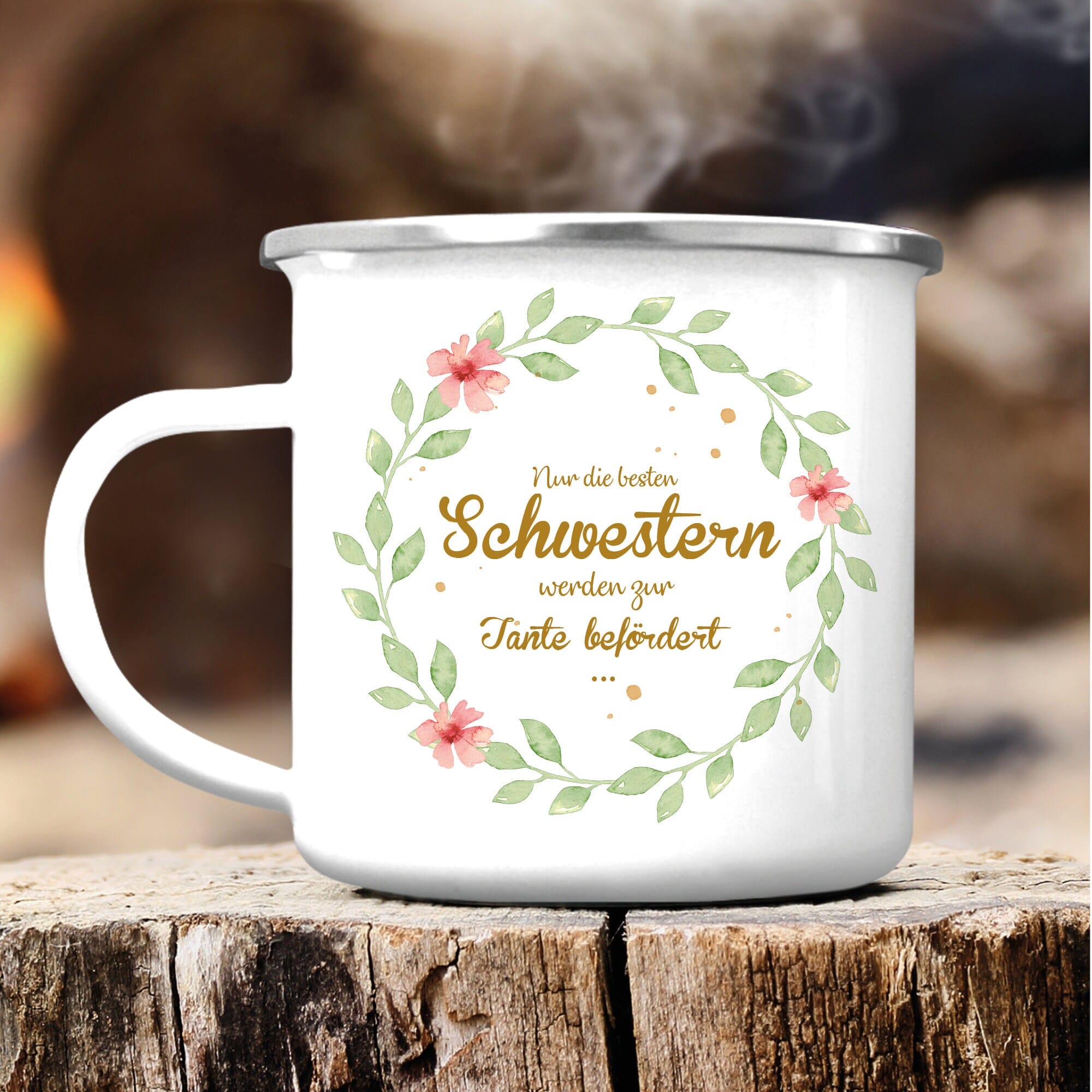 Campingbecher Emaille “Nur die besten Schwestern werden zur Tante befördert…” Geschenk Schwester Tante Blätterkranz mit Blumen, Geschenk zu Weihnachten