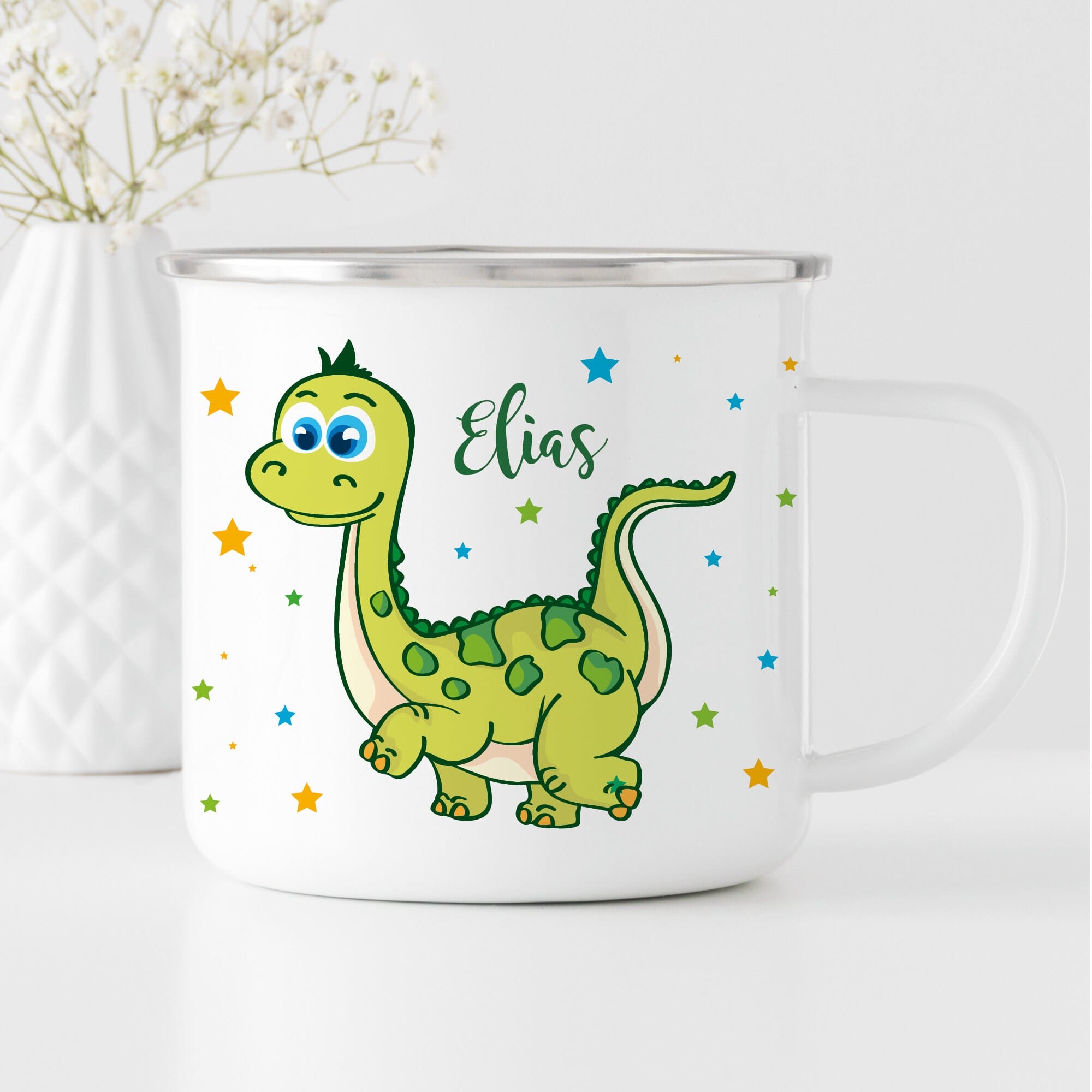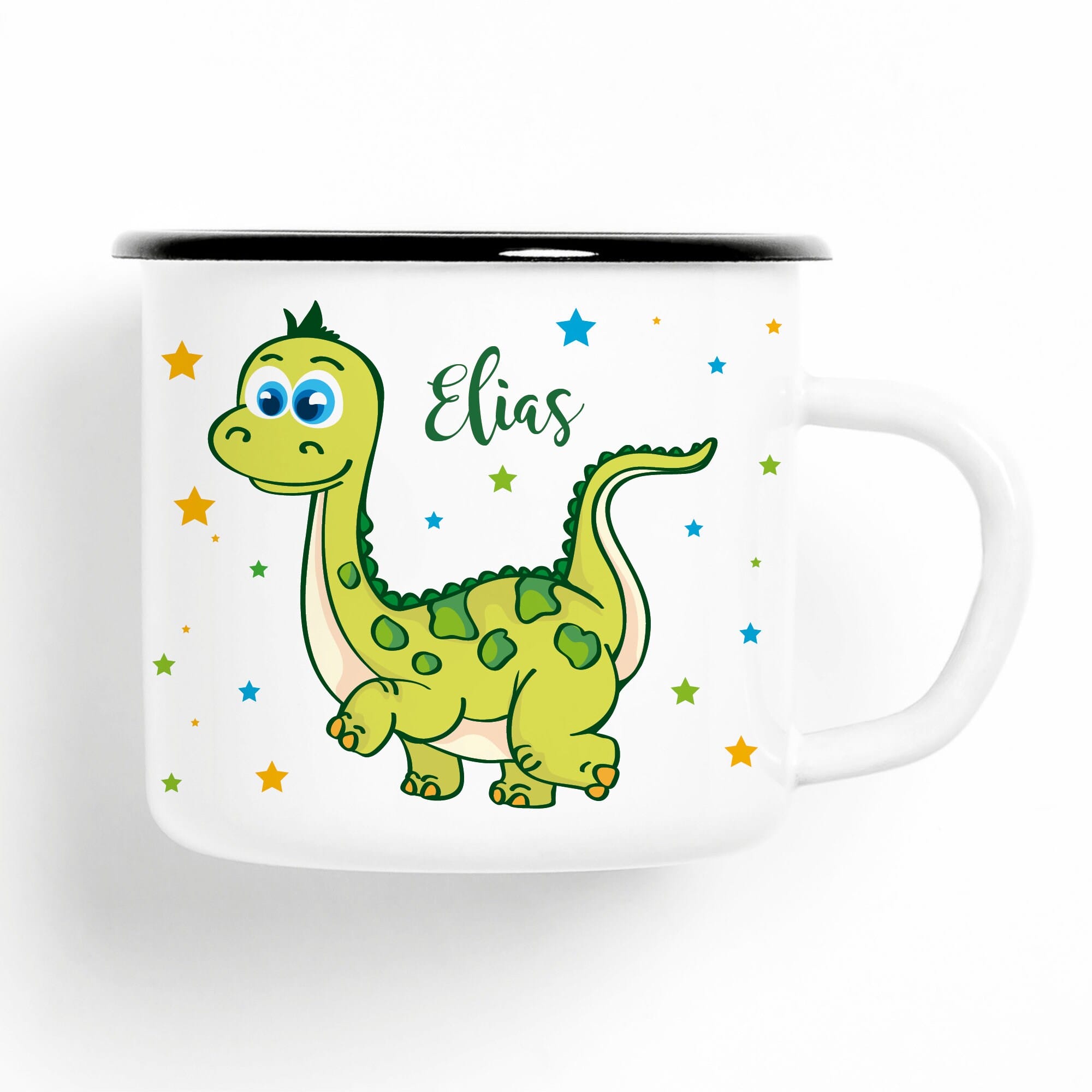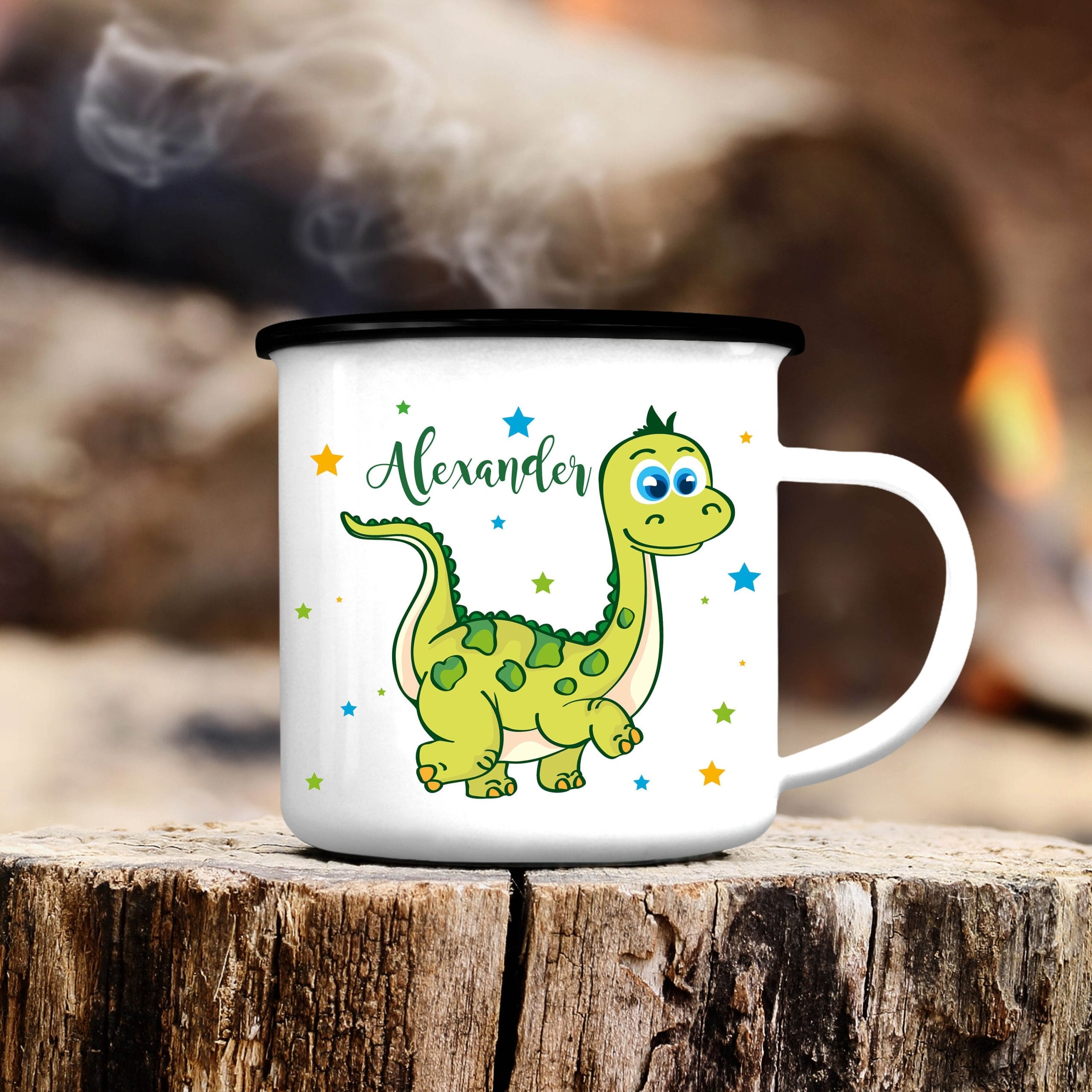 Campingbecher Emaille süßer Dino personalisiert mit Wunschnamen, Geschenk zum Geburtstag