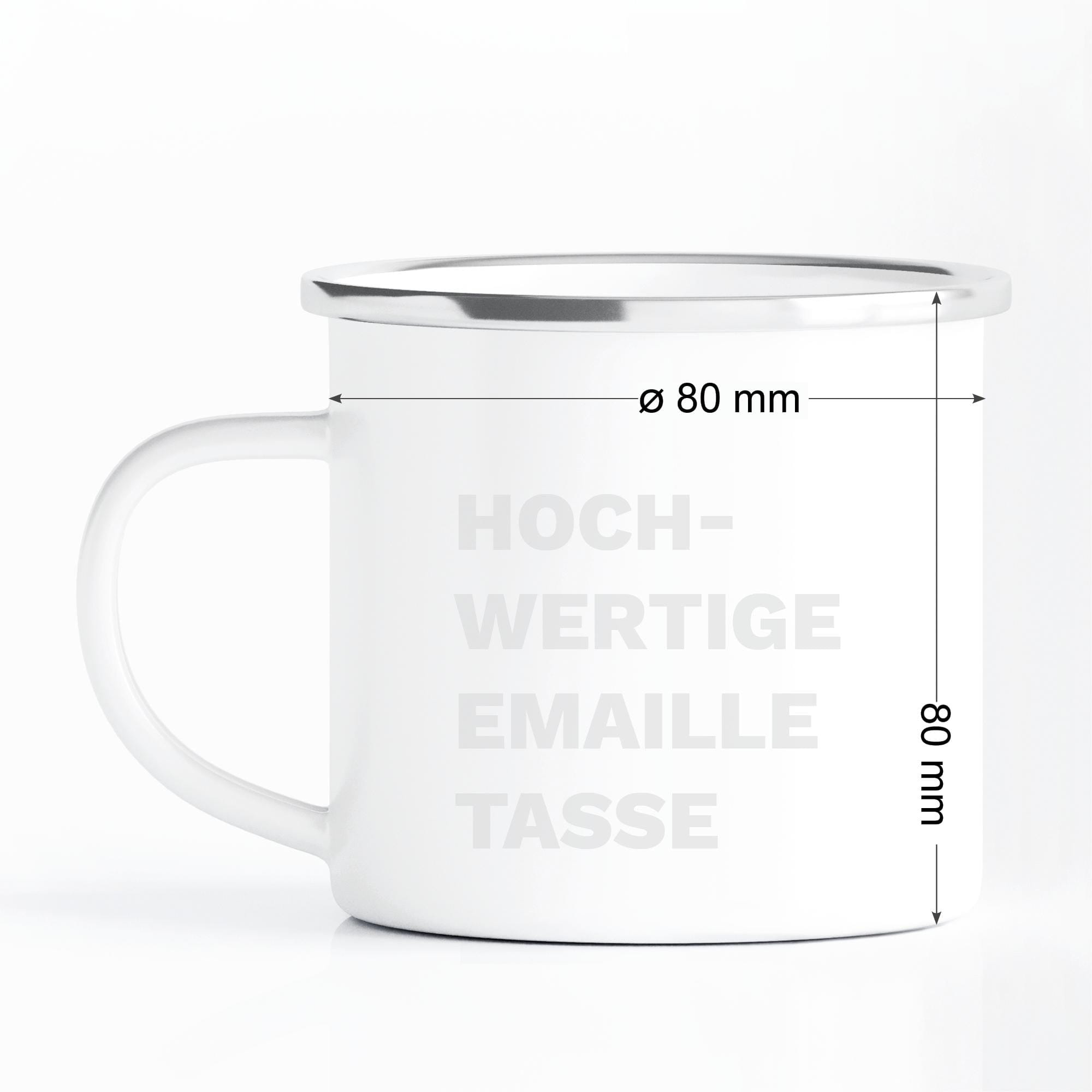 Emailletasse weiß mit hochwertigem Aufdruck und silbernem oder schwarzem Edelstahlrand