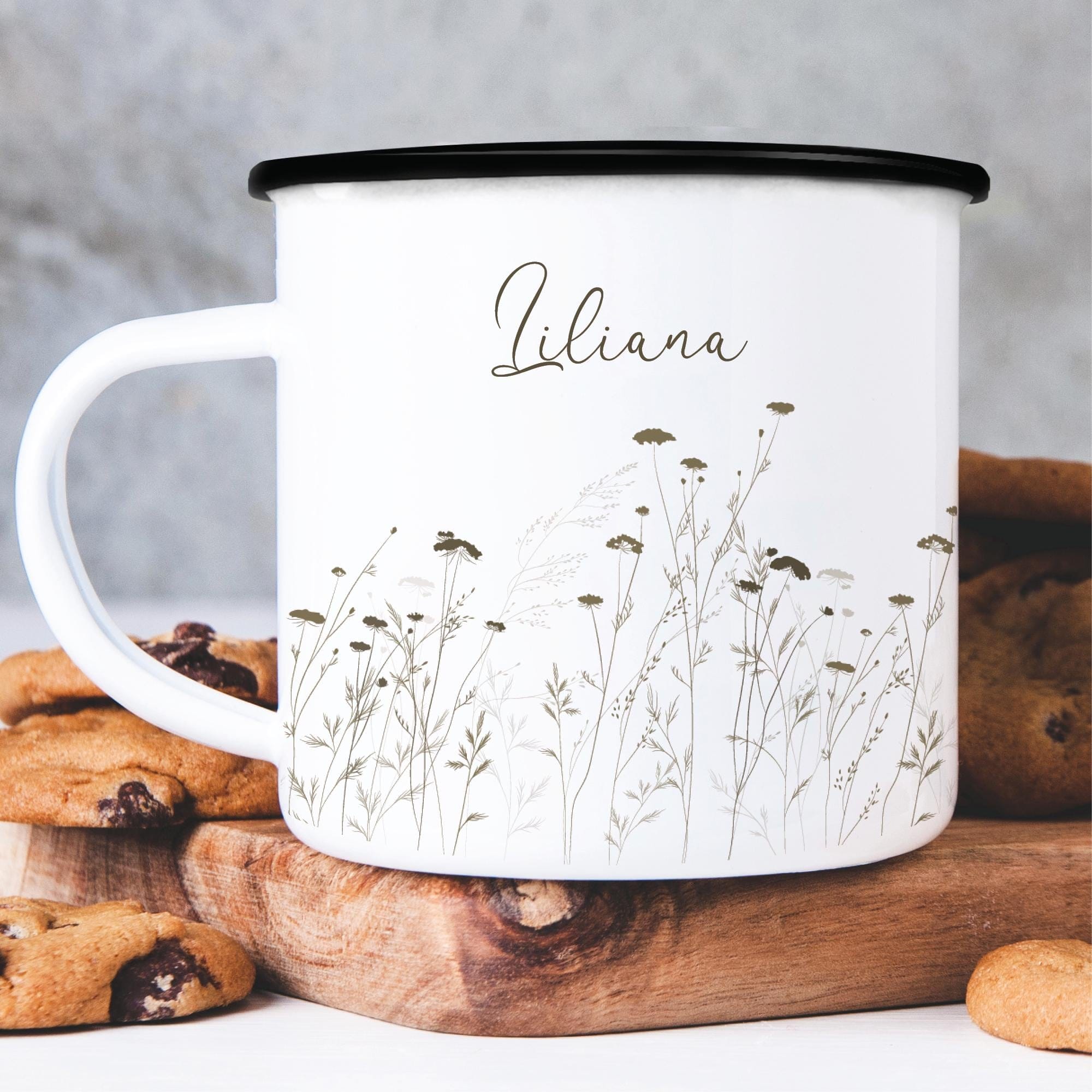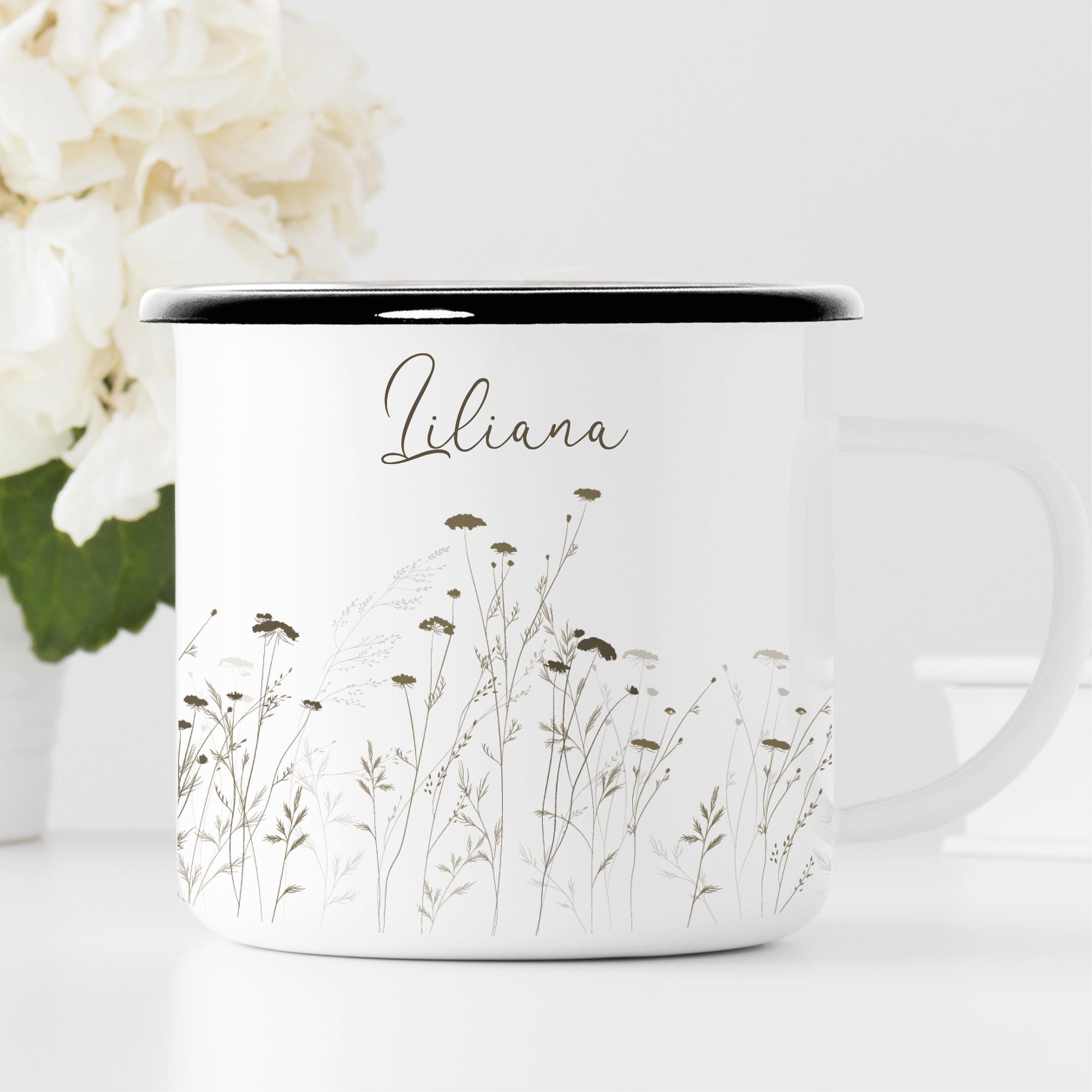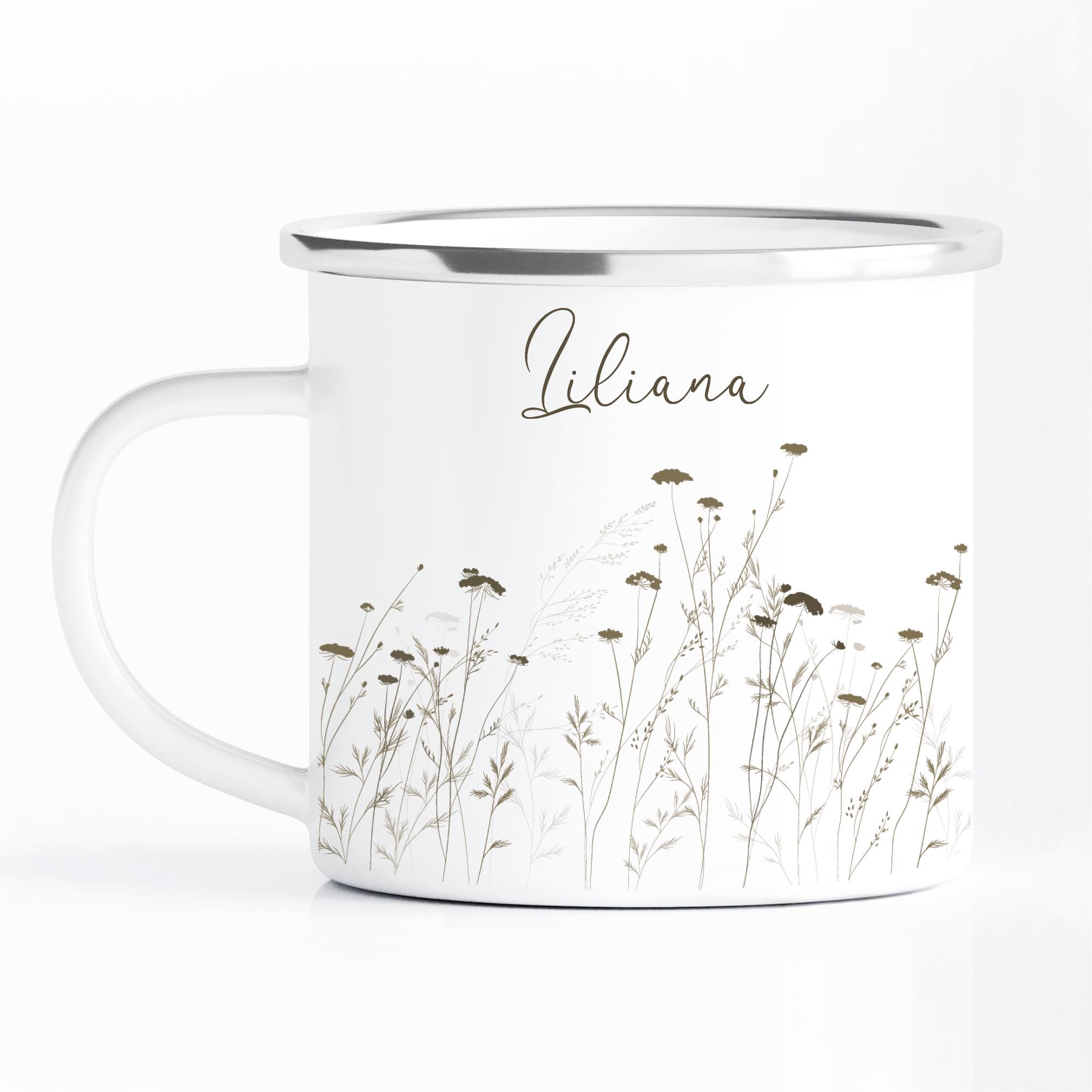 Campingbecher Emaille Wildgräsern und dem Wunschnamen Natur Naturliebhaber Camper Tasse Wildgras schlicht