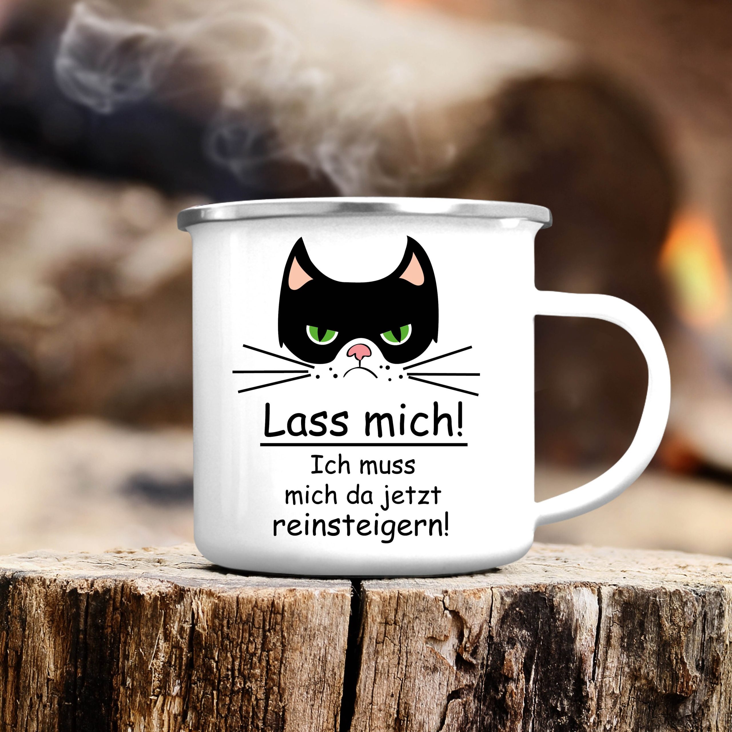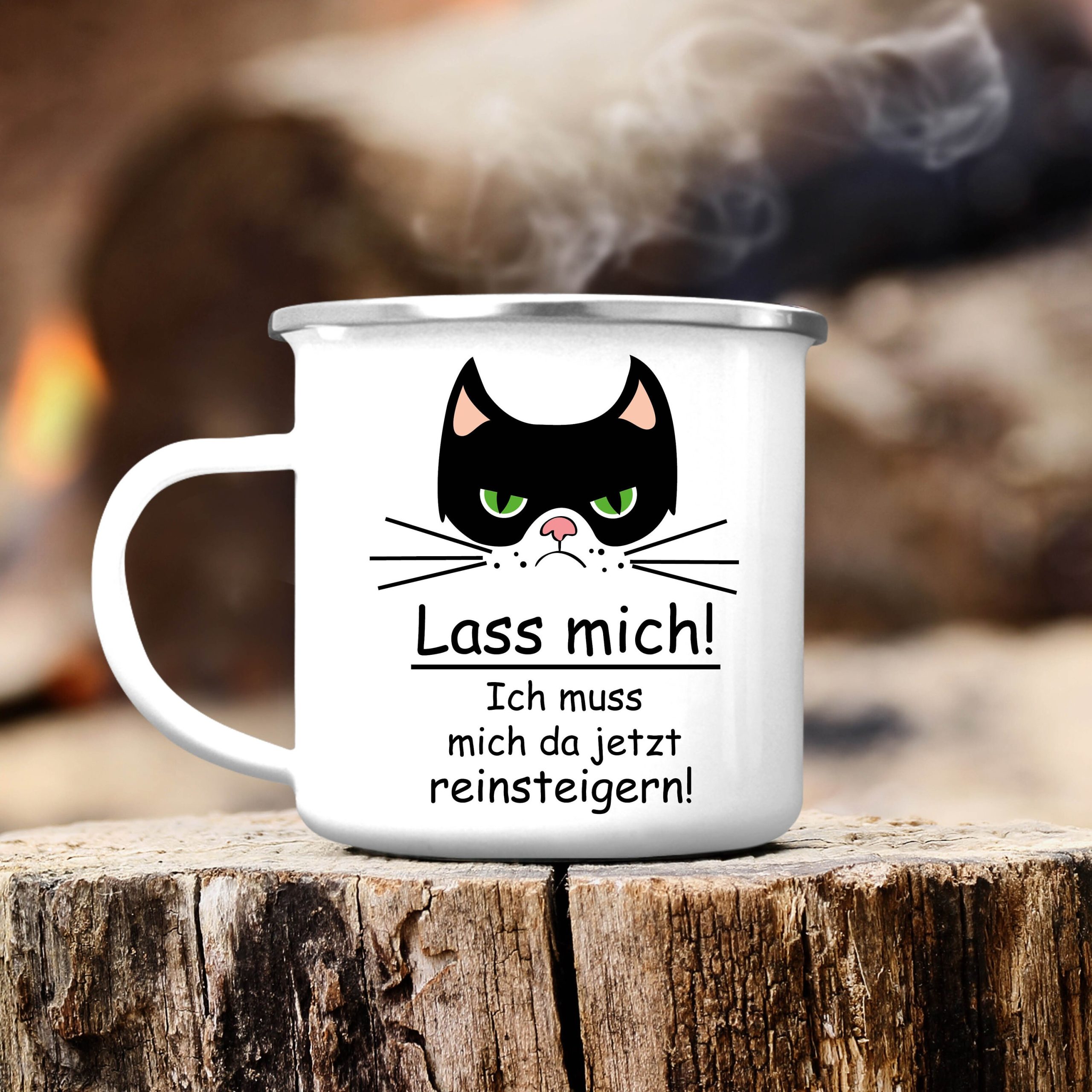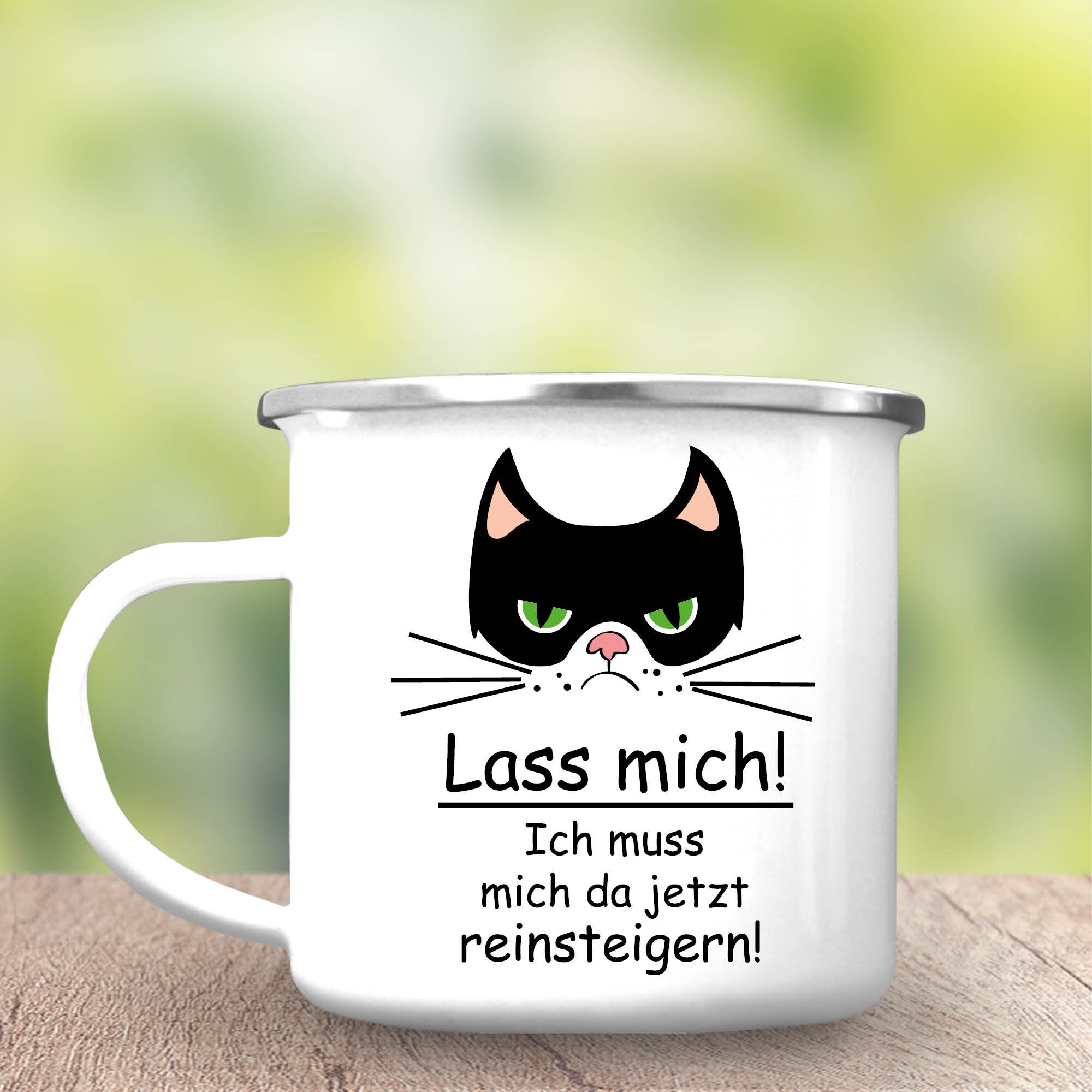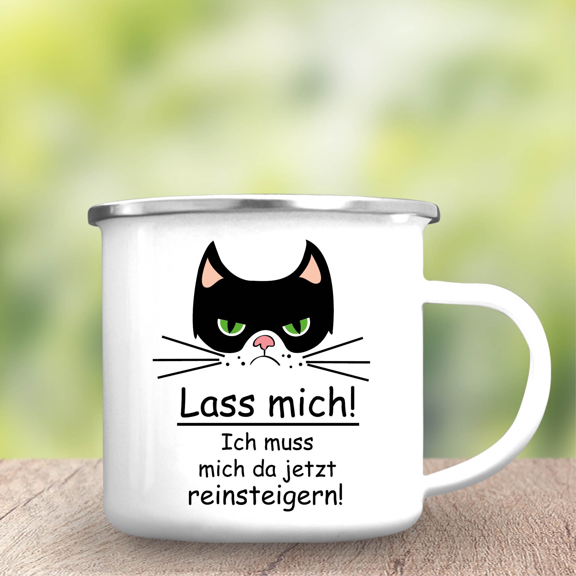 Campingbecher Emaille Katze “Lass mich! Ich muss mich da jetzt reinsteigern.”, Outdoorgeschirr, Geschenk Geburtstag