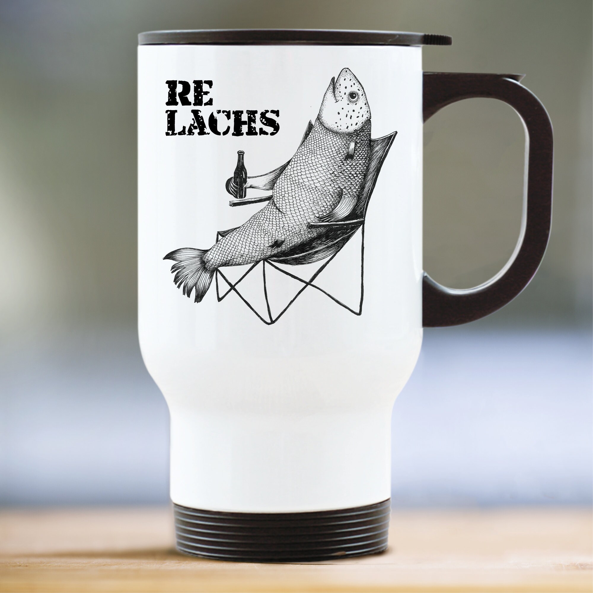 Thermobecher bedruckt mit einem Lachs im Angelstuhl mit einer Flasche Bier und der Aufschrift Relachs.