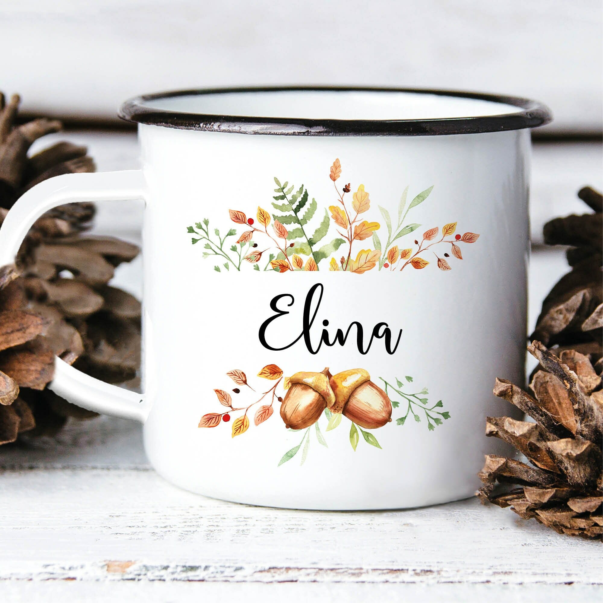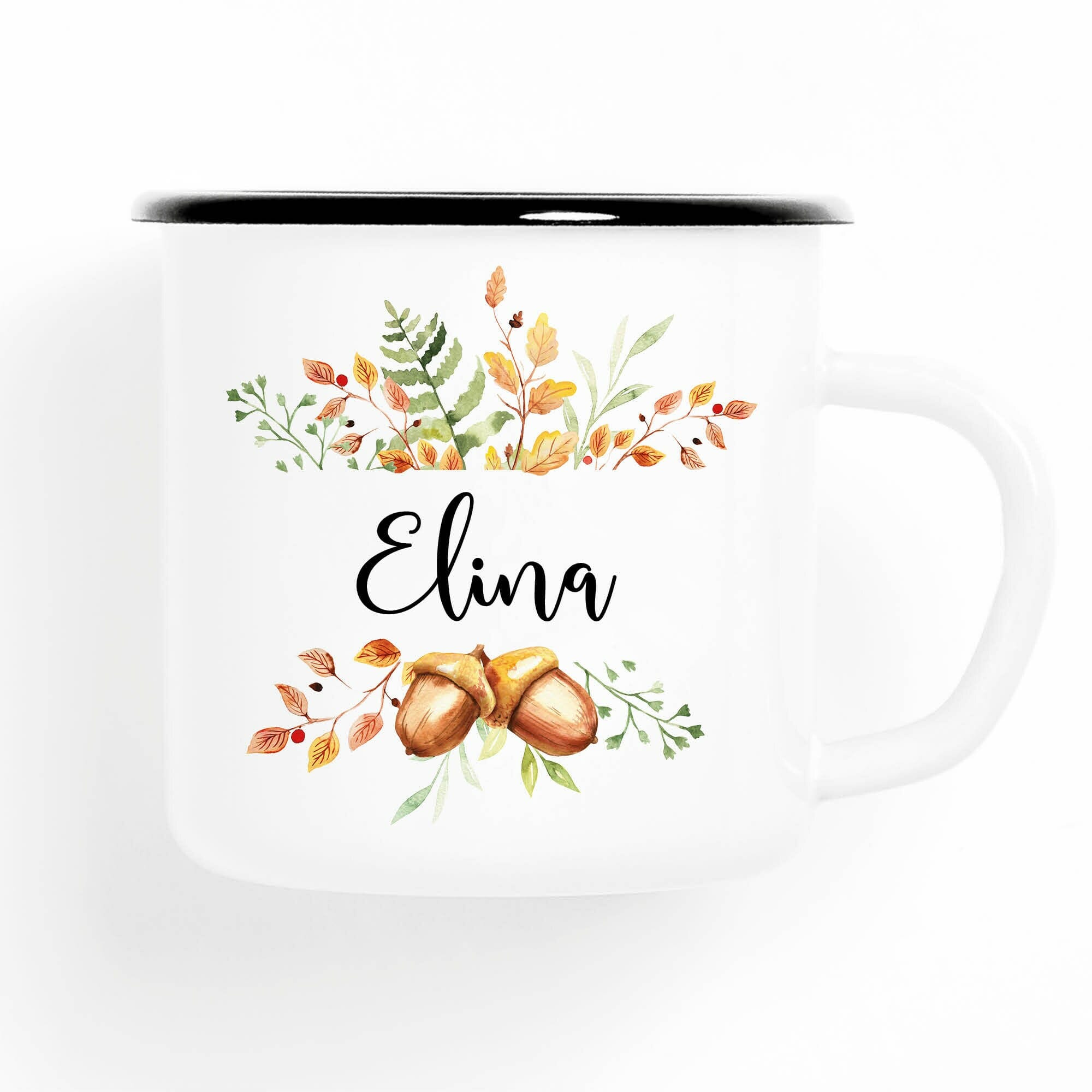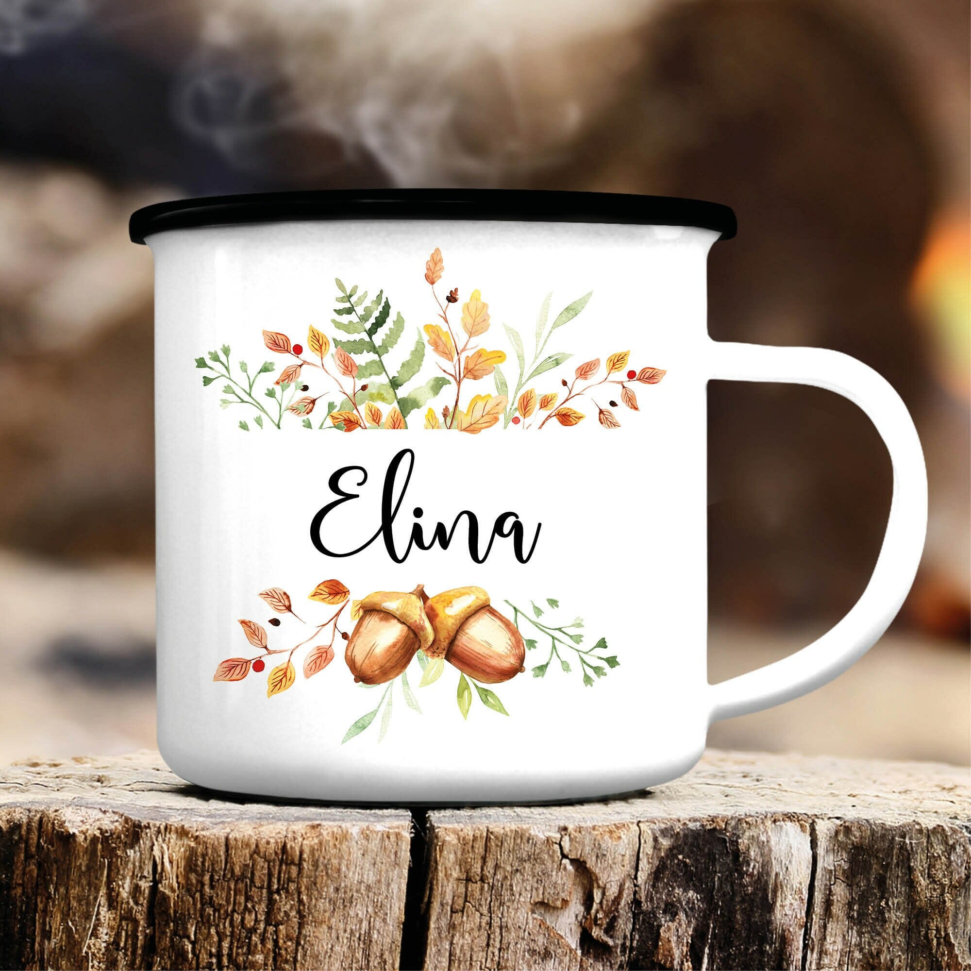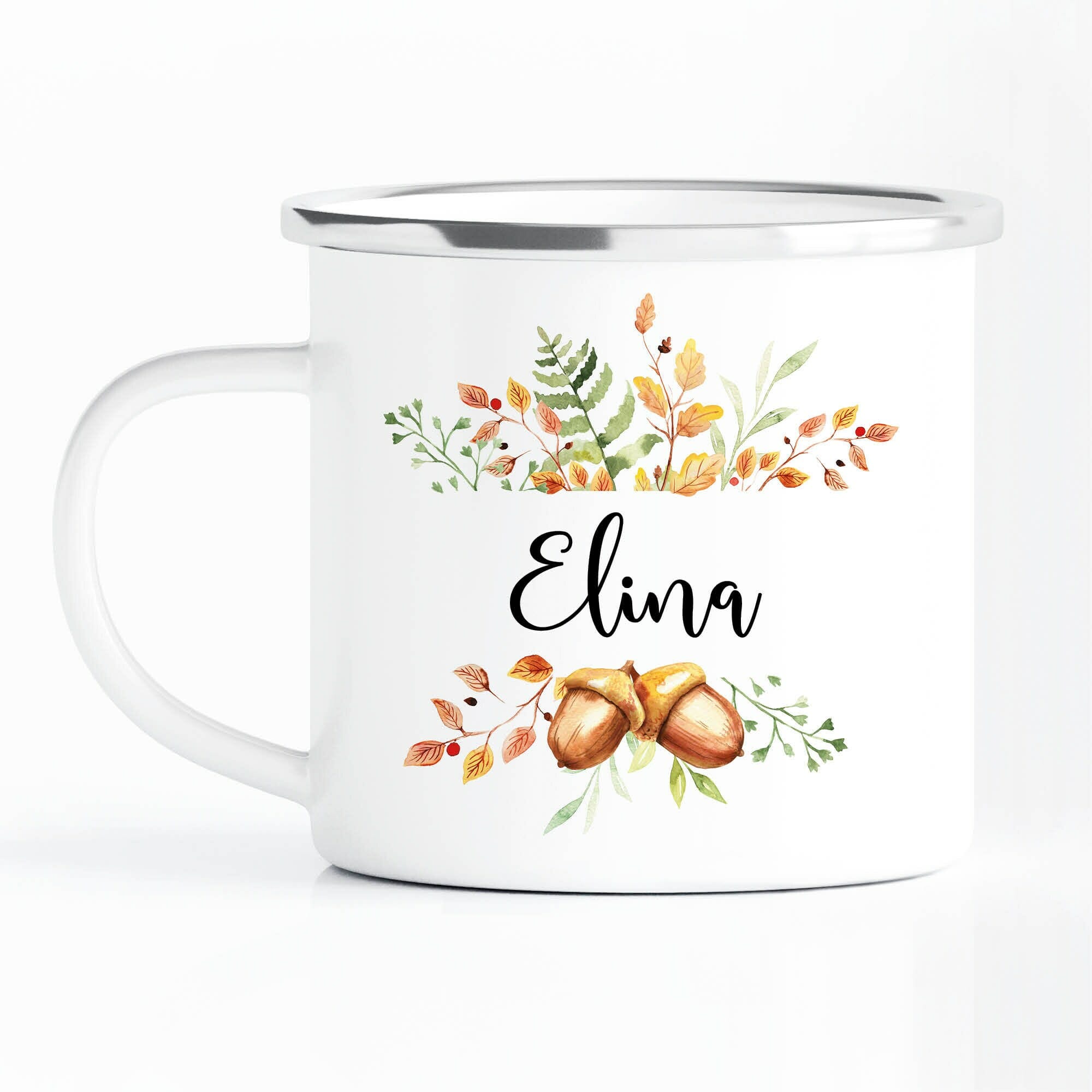 Emaille Becher Herbstblätter und Eicheln Herbst Geschenk personalisiert mit Wunschname