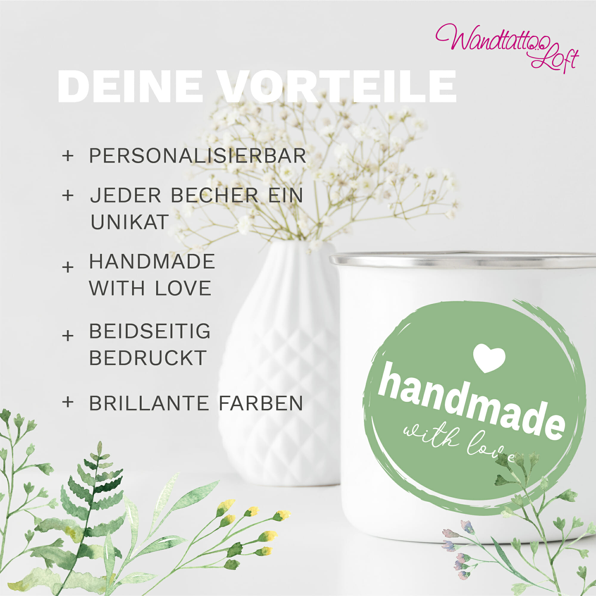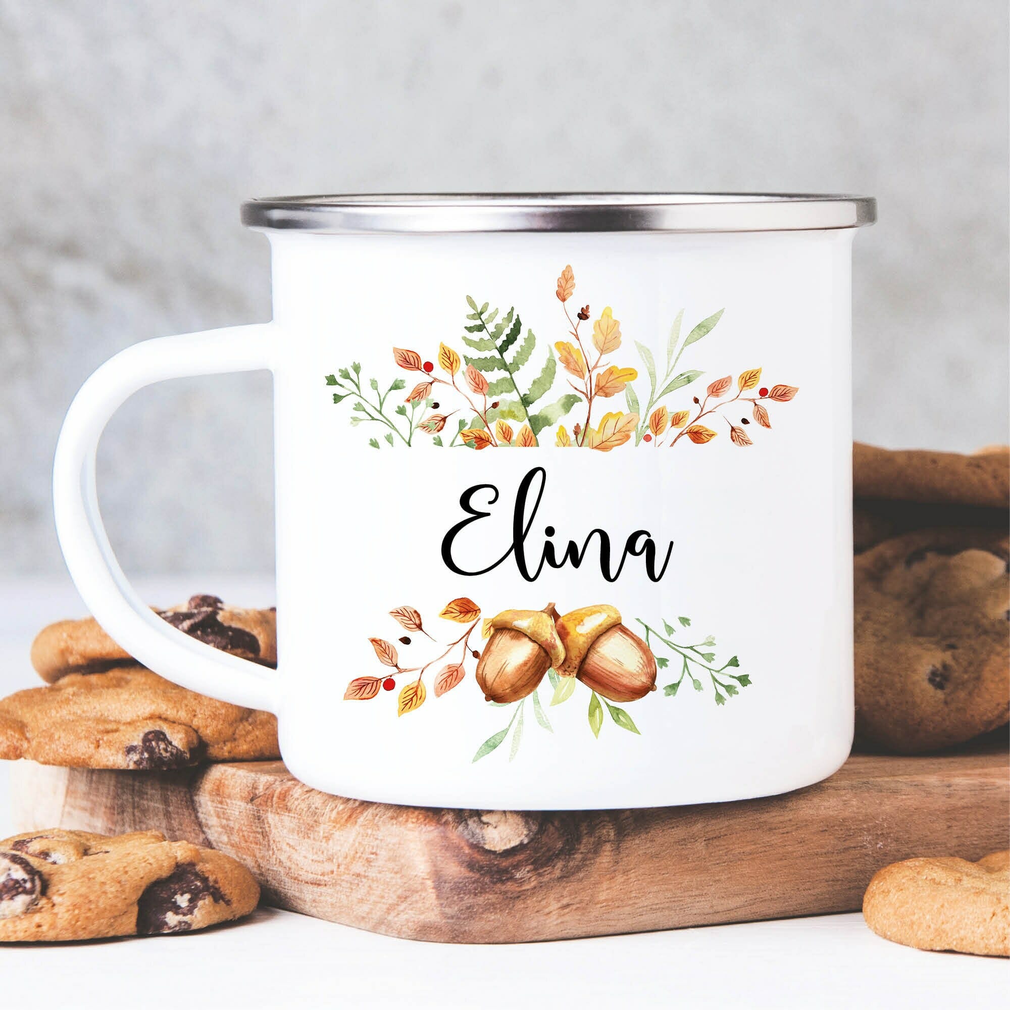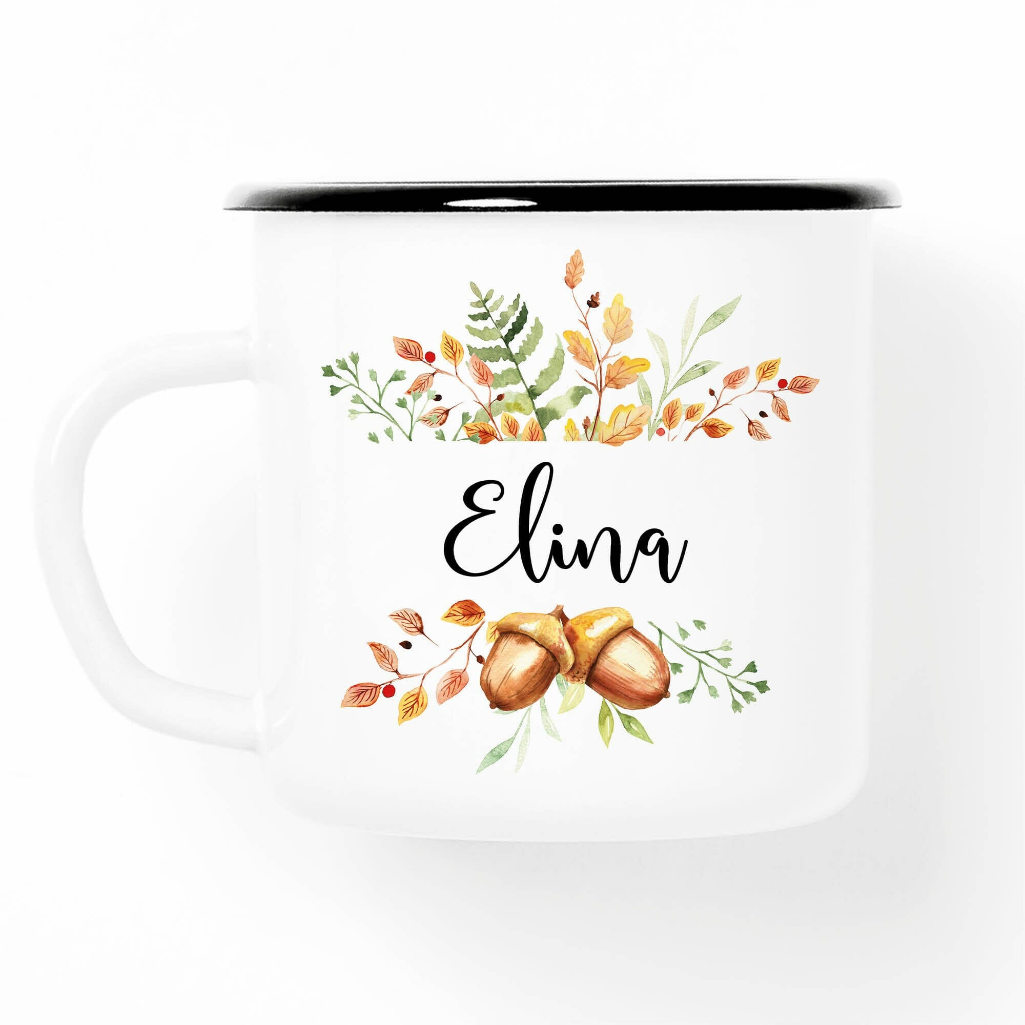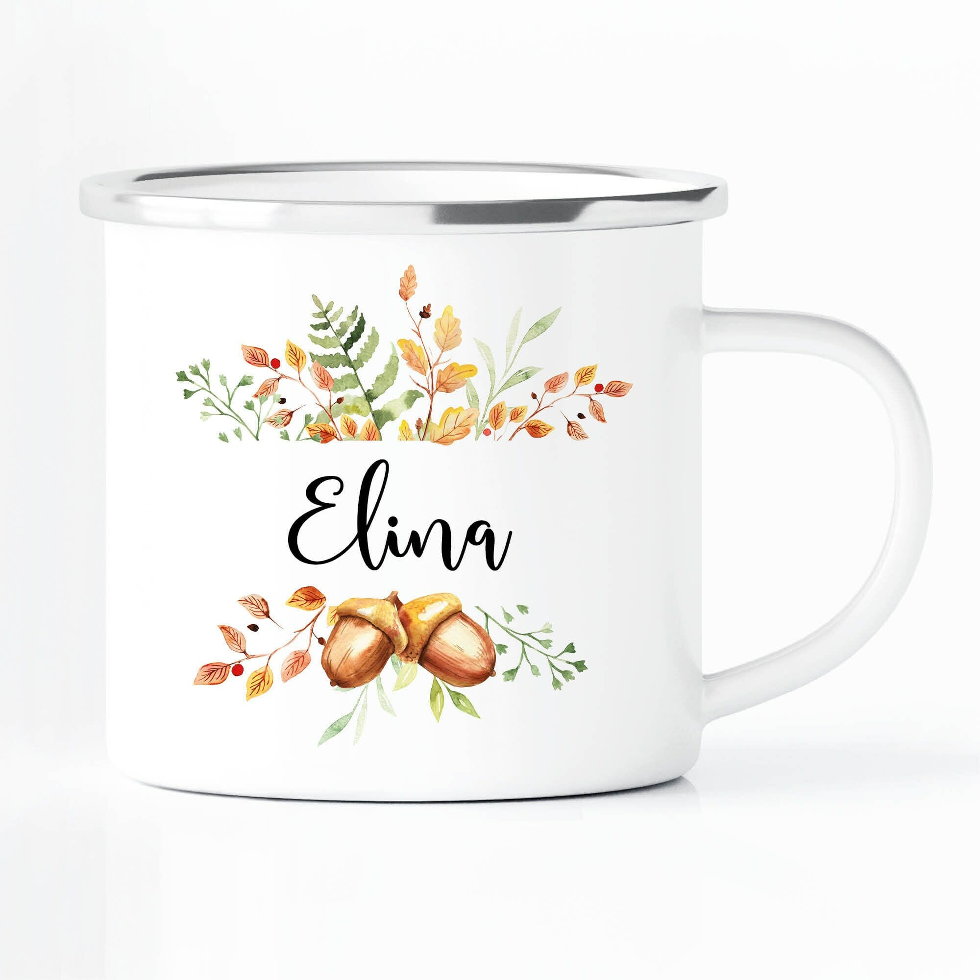 Emaille Becher Herbstblätter und Eicheln Herbst Geschenk personalisiert mit Wunschname