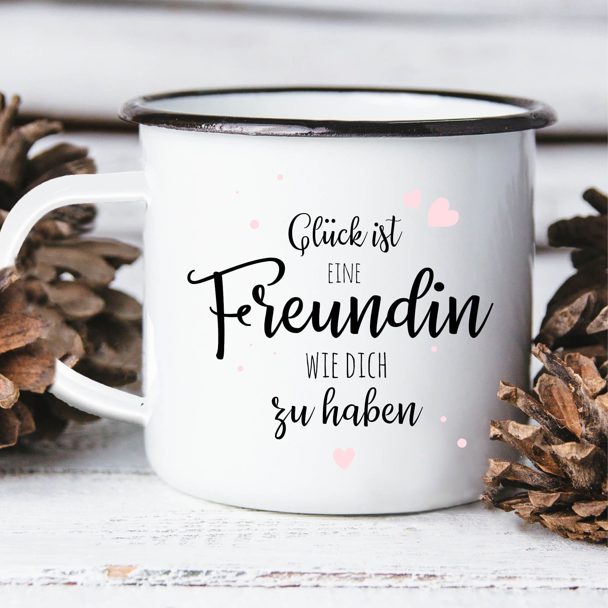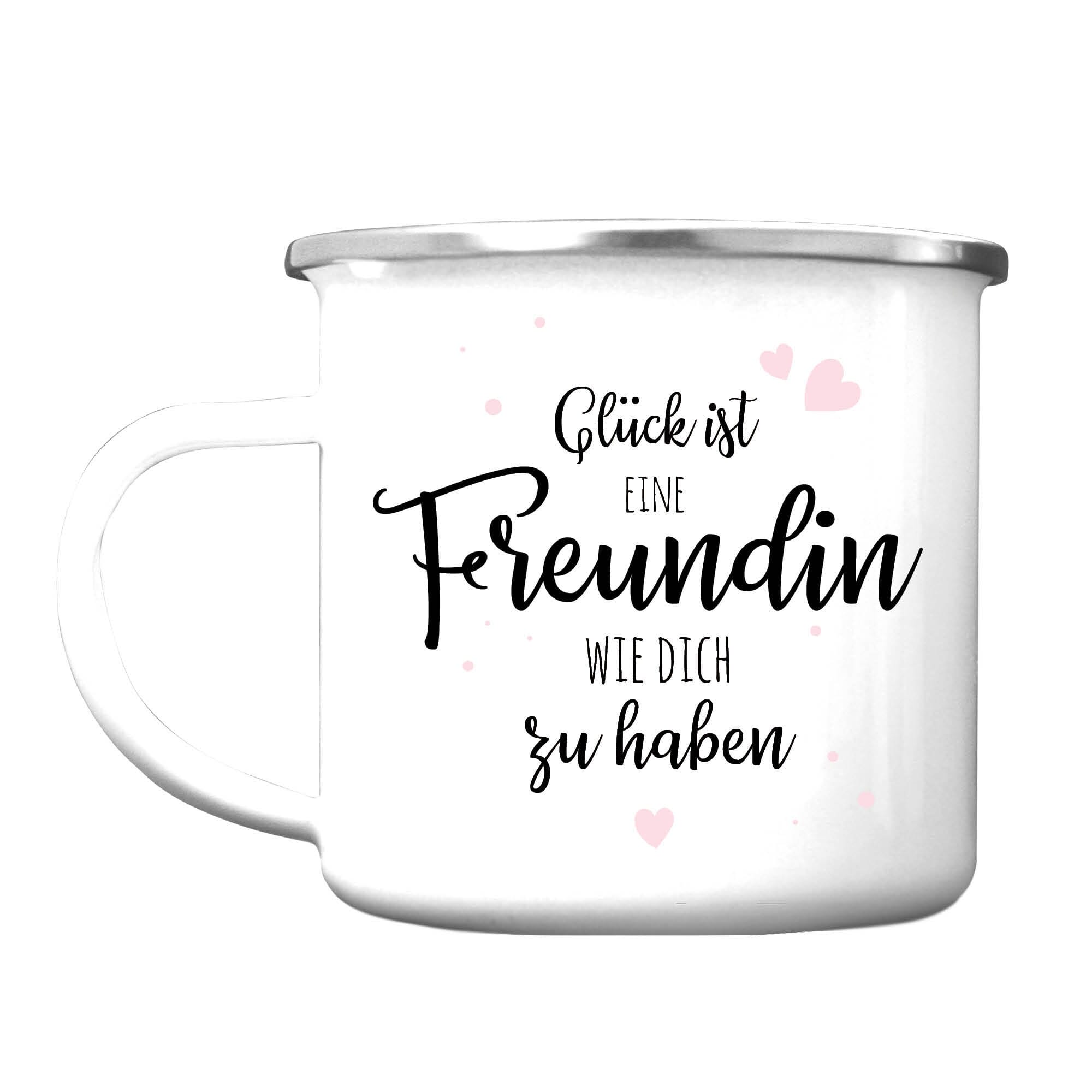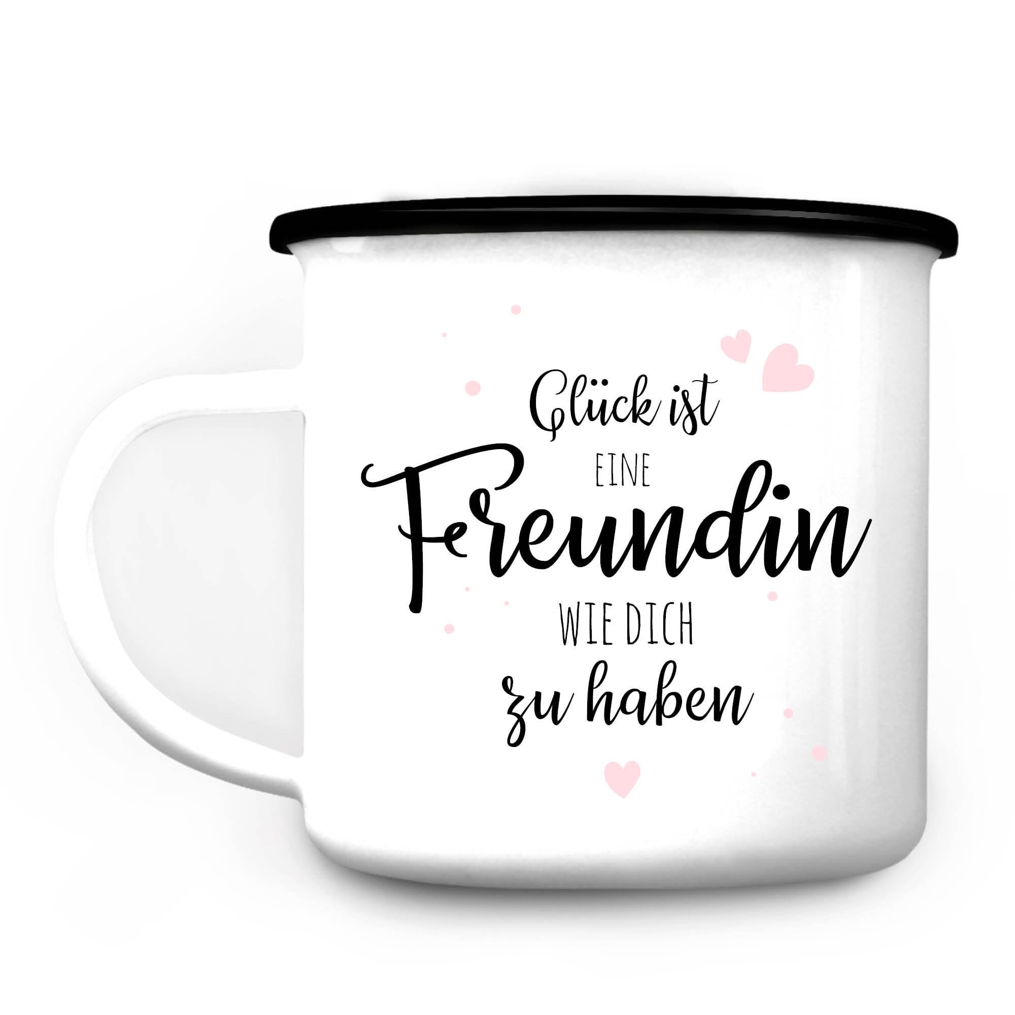 Dieser Emaille Campingbecher ist ein tolles Geschenk für die beste Freundin. Auf der Rückseite steht “Glück ist eine Freundin wie dich zu haben”