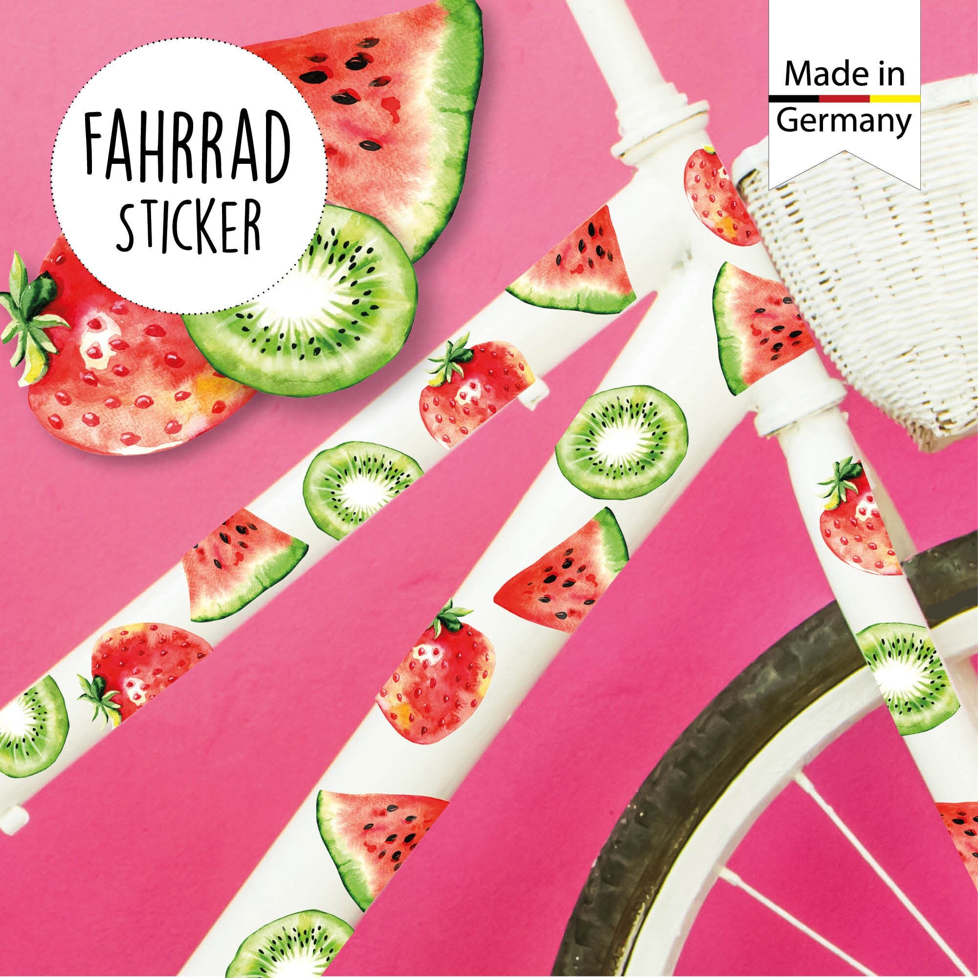 Dein Fahrrad sieht langweilig und normal aus? Deinem Fahrrad fehlt das gewisse Extra? Dann schnapp` Dir unser Fahrradaufkleber-Set und verschönere Dein Bike mit diesen farbenfrohen Stickern in unterschiedlichen Ausführungen. Hier bekommst Du Kiwi-, Erdbeer- und Melonensticker in einem praktischen Set.