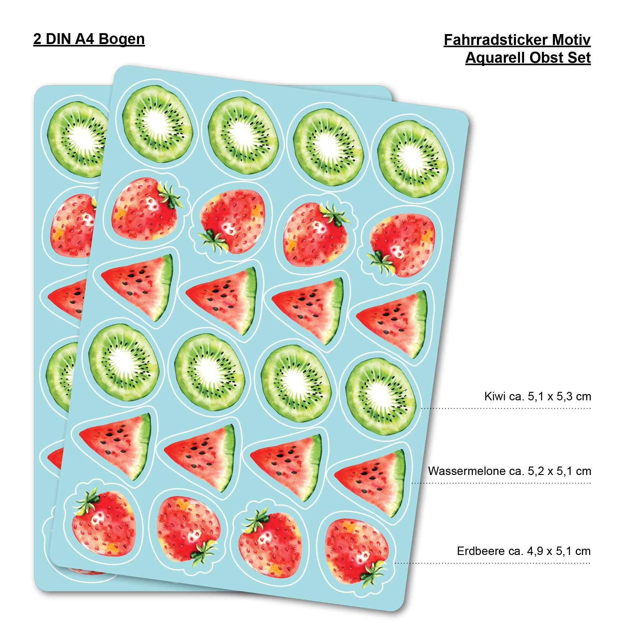 Dieses Angebot besteht aus zwei A4 Bögen mit insgesamt 48 Aufkleber (je 16 verschiedene Früchte) in kräftigen Farben.