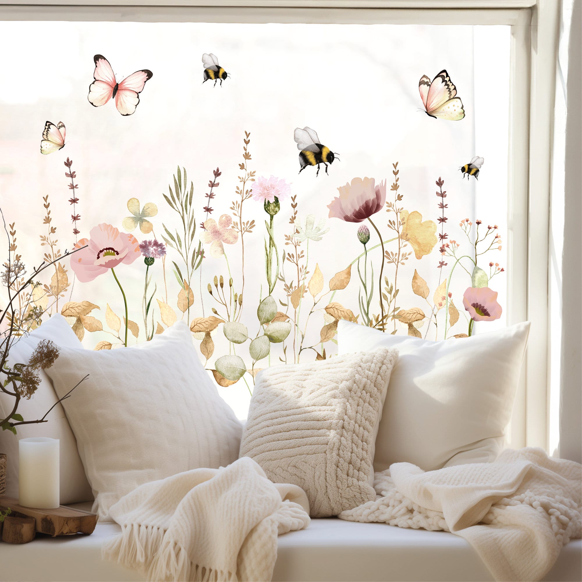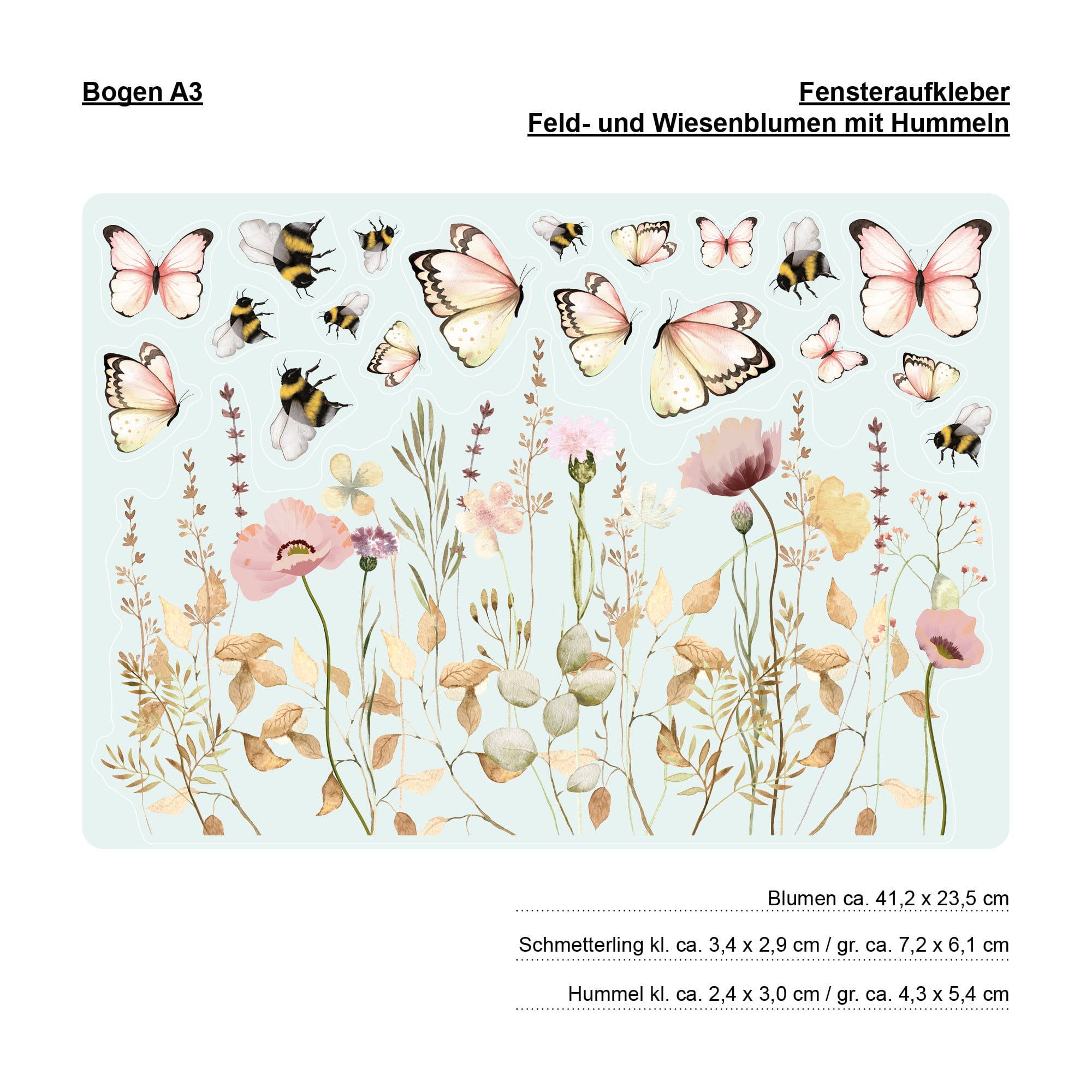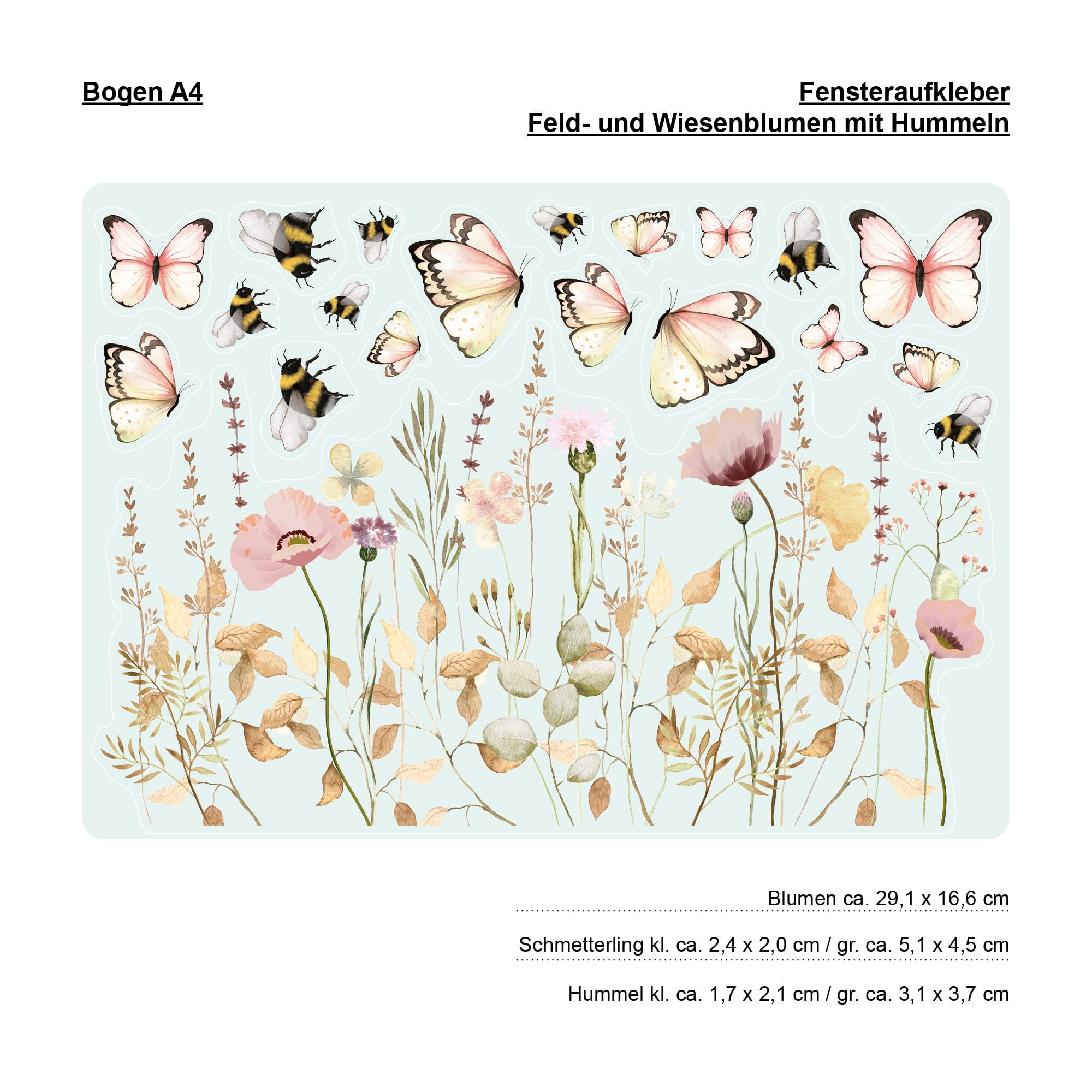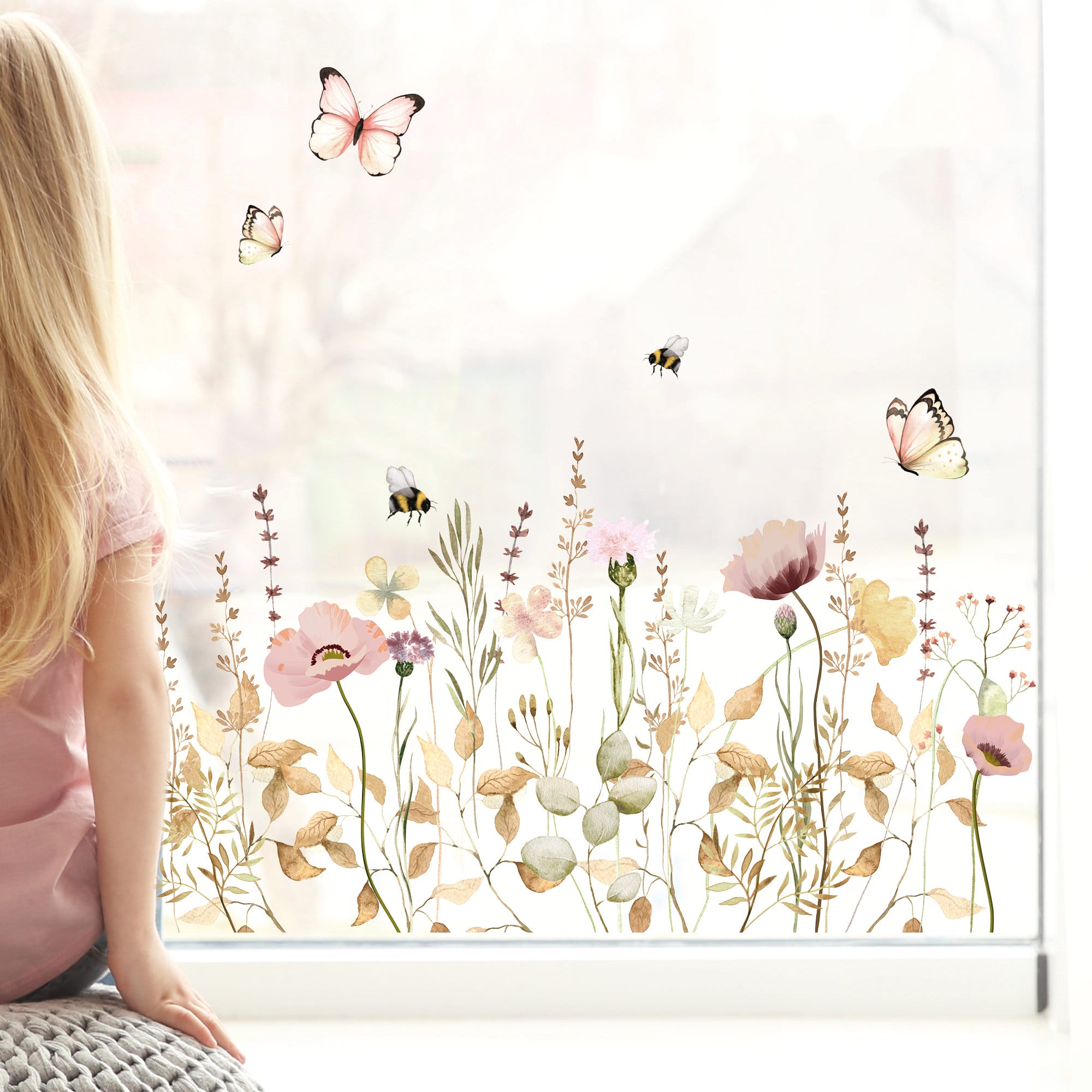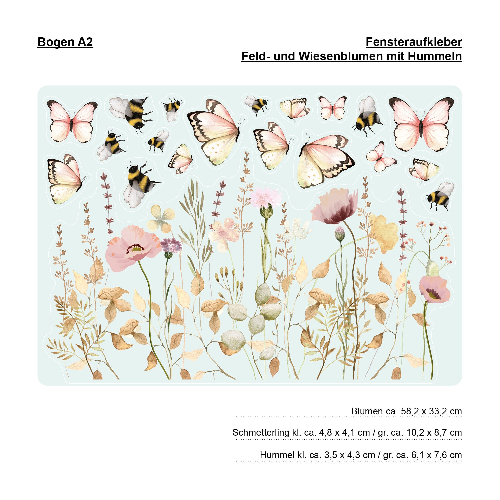Fensterbild Feld- und Wiesenblumen wiederverwendbar pastell Blumenwiese mit Schmetterlingen Hummeln Fensterdekoration