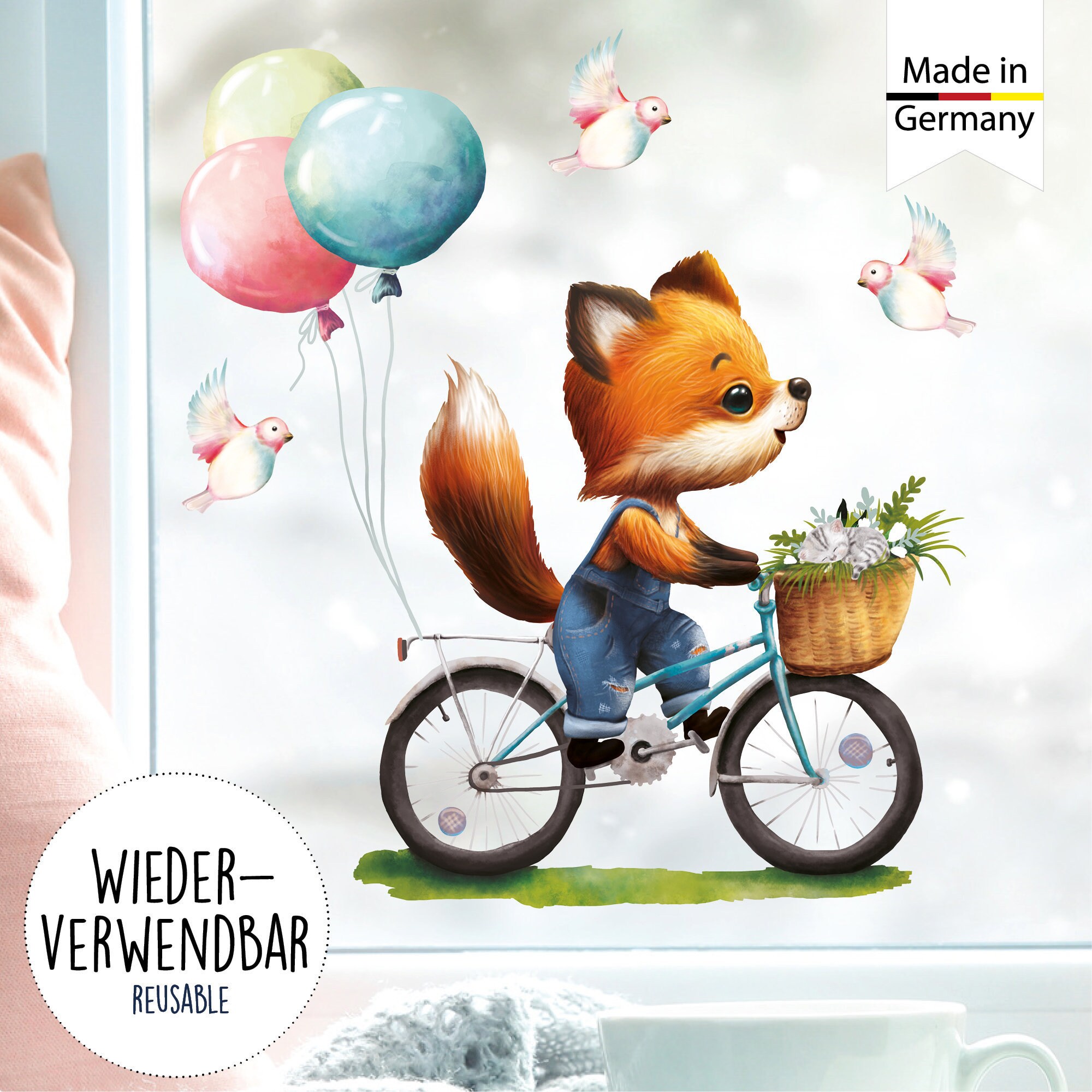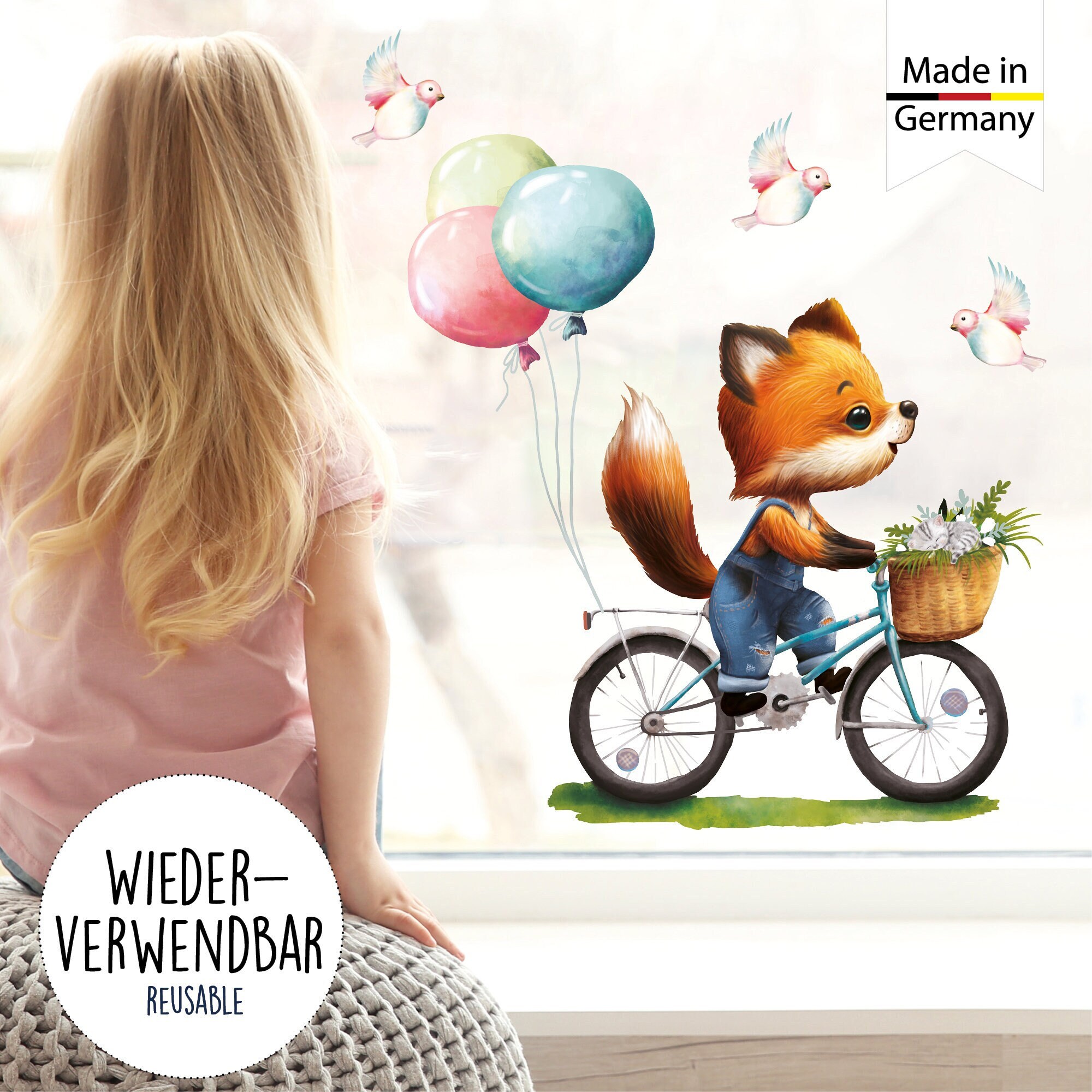 Wiederverwendbarer Fensteraufkleber Fensterbild Frühling Fuchs mit Ballons und Vögeln Fensterdeko Kinderzimmer Kind
