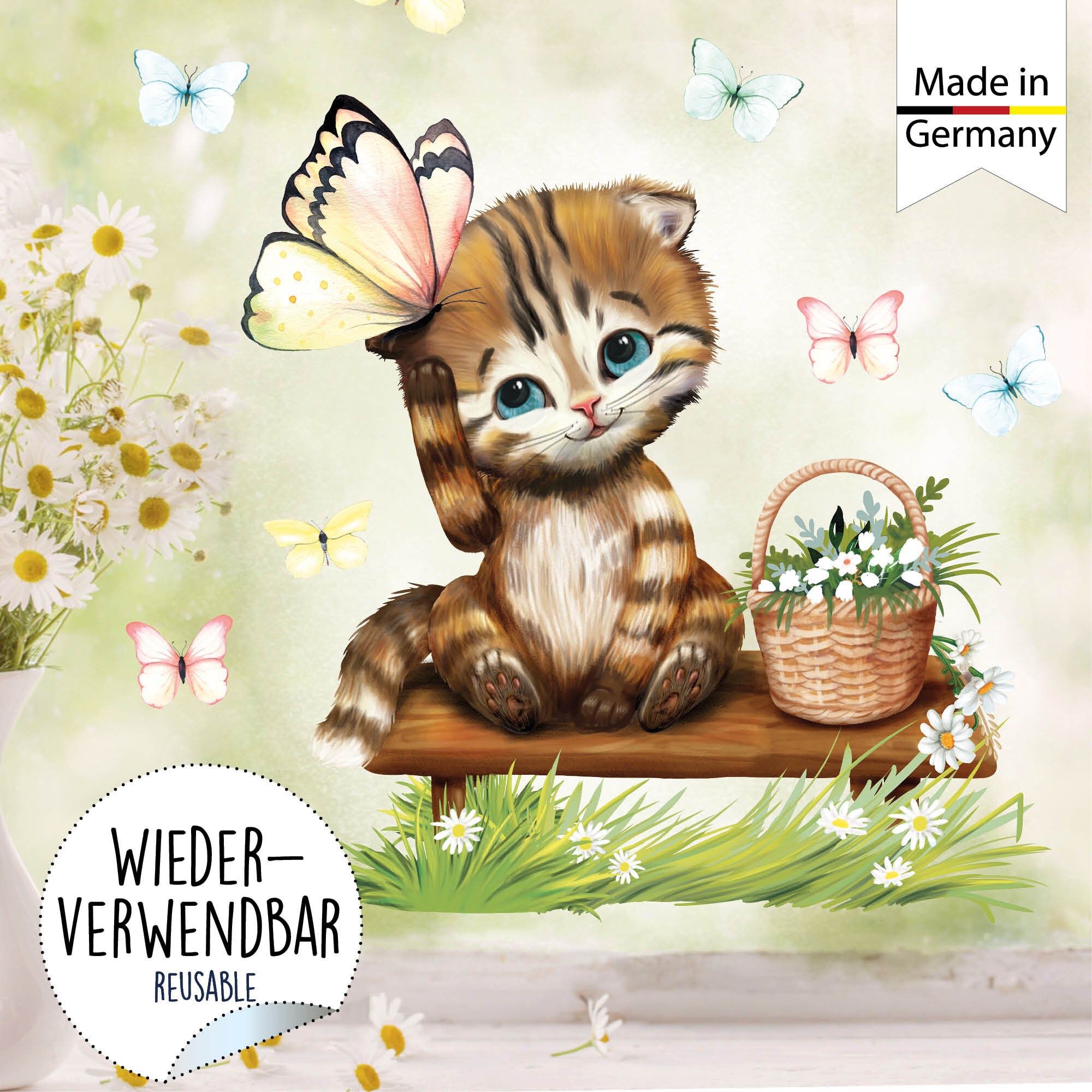 Fensterbild Frühling Katze Kätzchen mit Schmetterlingen Fensterdeko Kinderzimmer Kind, Frühlingsdeko, Osterdeko