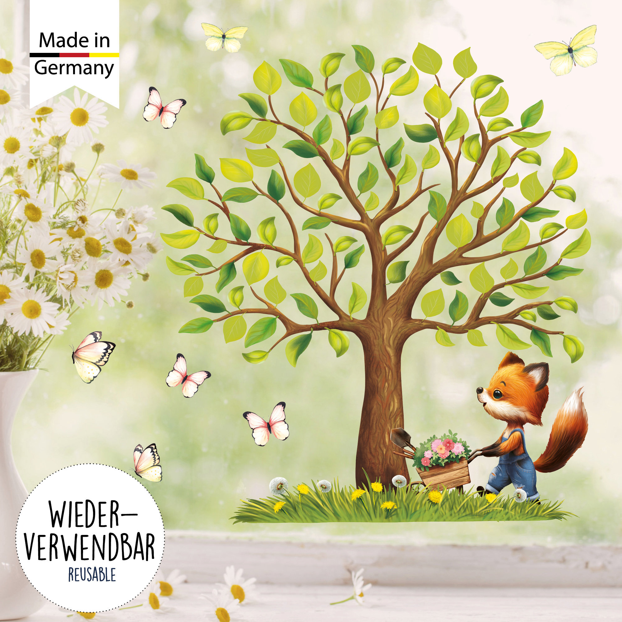 Wiederverwendbarer Fensteraufkleber Fensterbild Frühling Ostern Baum mit Fuchs und Schmetterlingen Fensterdeko Kinderzimmer Kind
