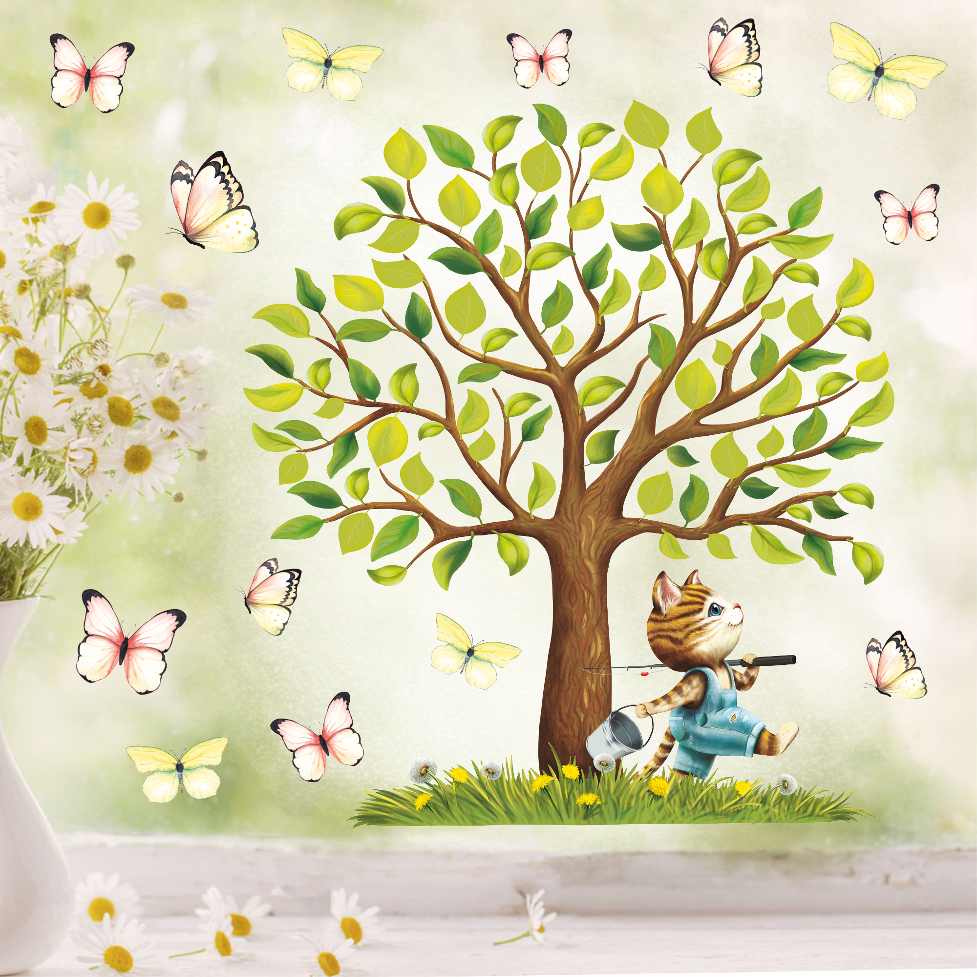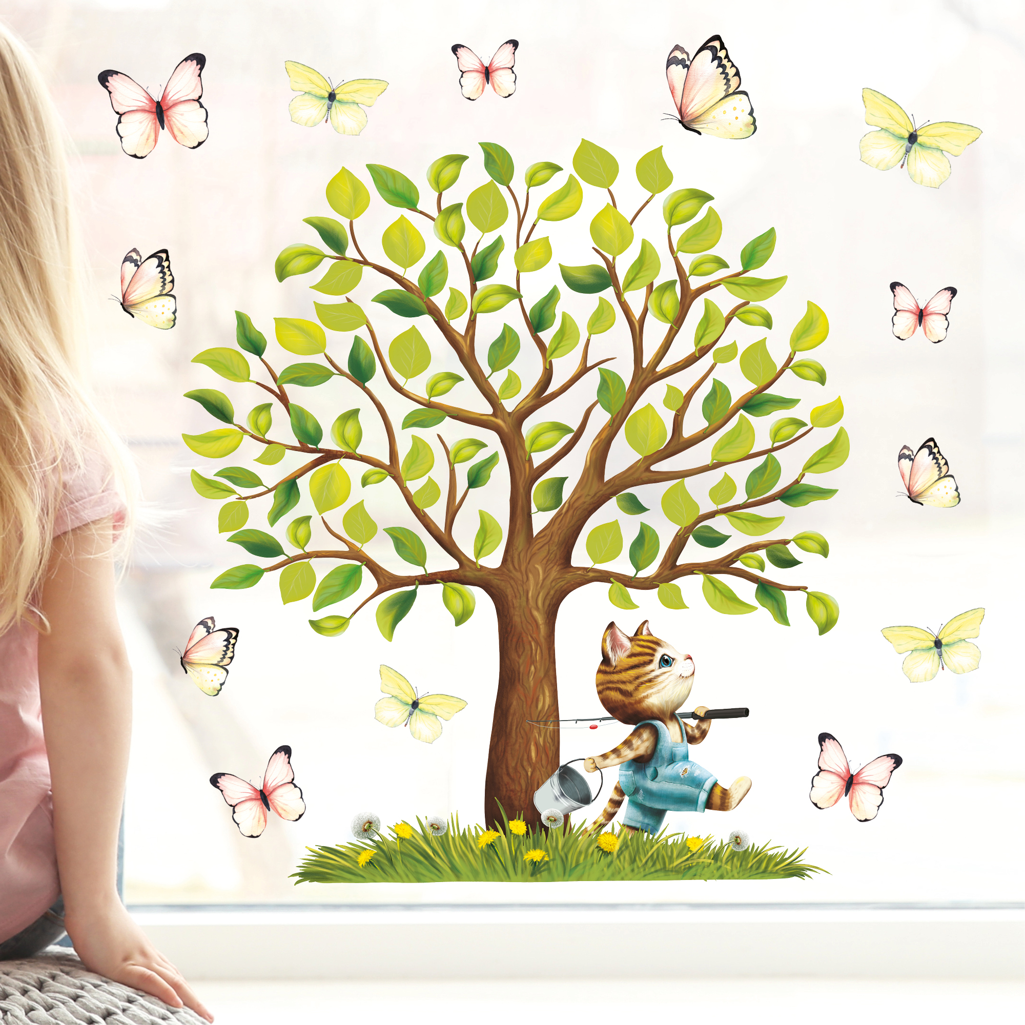 Fensterbild Frühling Ostern Baum Katze Schmetterlinge Fensterdeko Kinderzimmer Kind, Frühlingdeko, Osterdeko