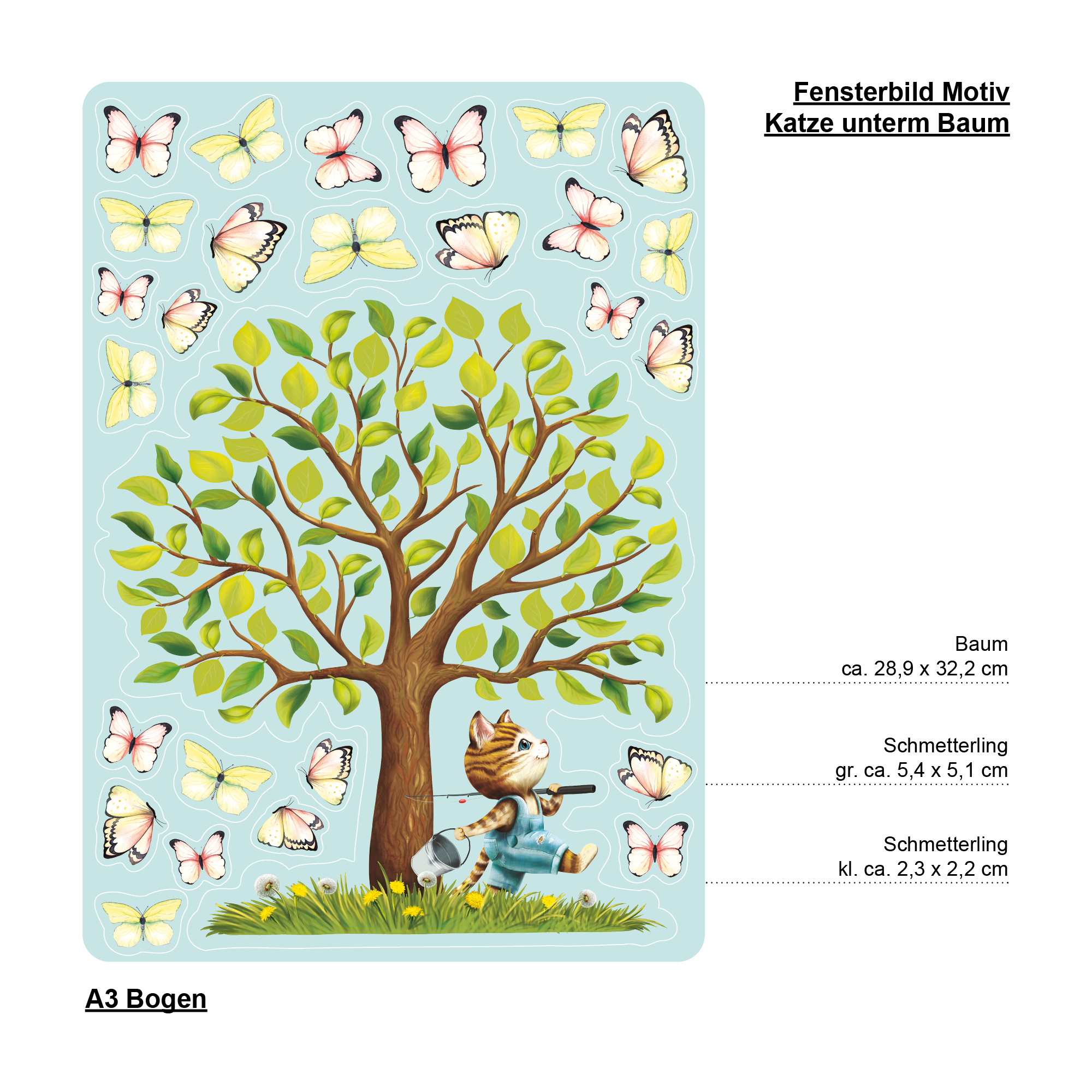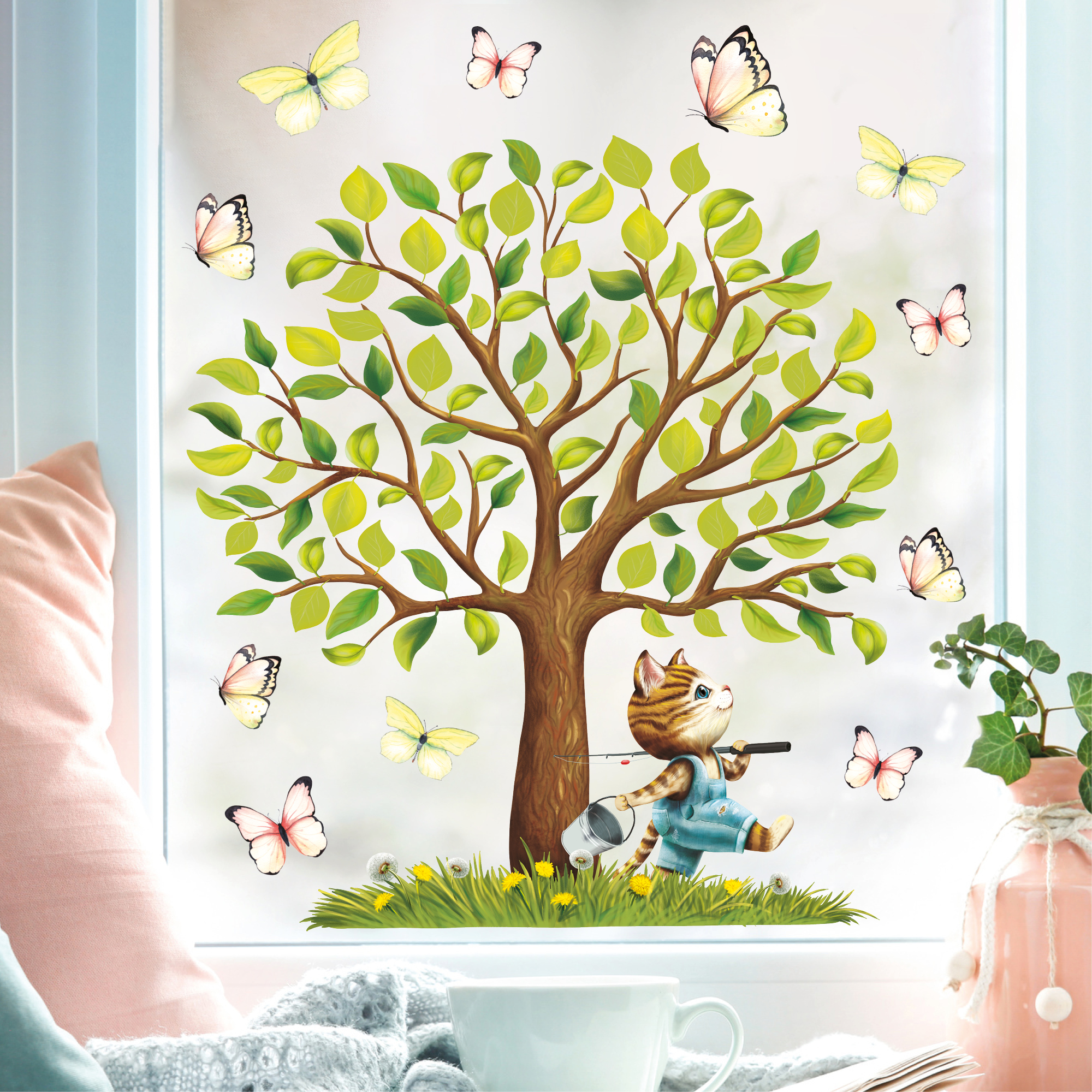 Fensterbild Frühling Ostern Baum Katze Schmetterlinge Fensterdeko Kinderzimmer Kind Frühlingdeko Osterdeko