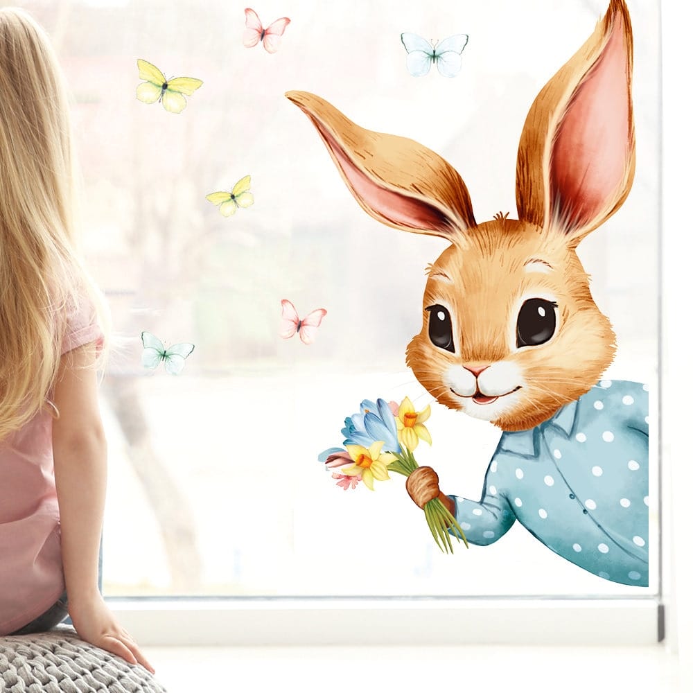 Auf dem Bild ist das Produkt: Fensterbild Frühling Ostern Osterhase hineinschauend Schmetterlingen Blumenstrauß Wiederverwendbar Fensterdeko Kinderzimmer Kind Frühlingsdeko zum Preis von €13.9 abgebildet.