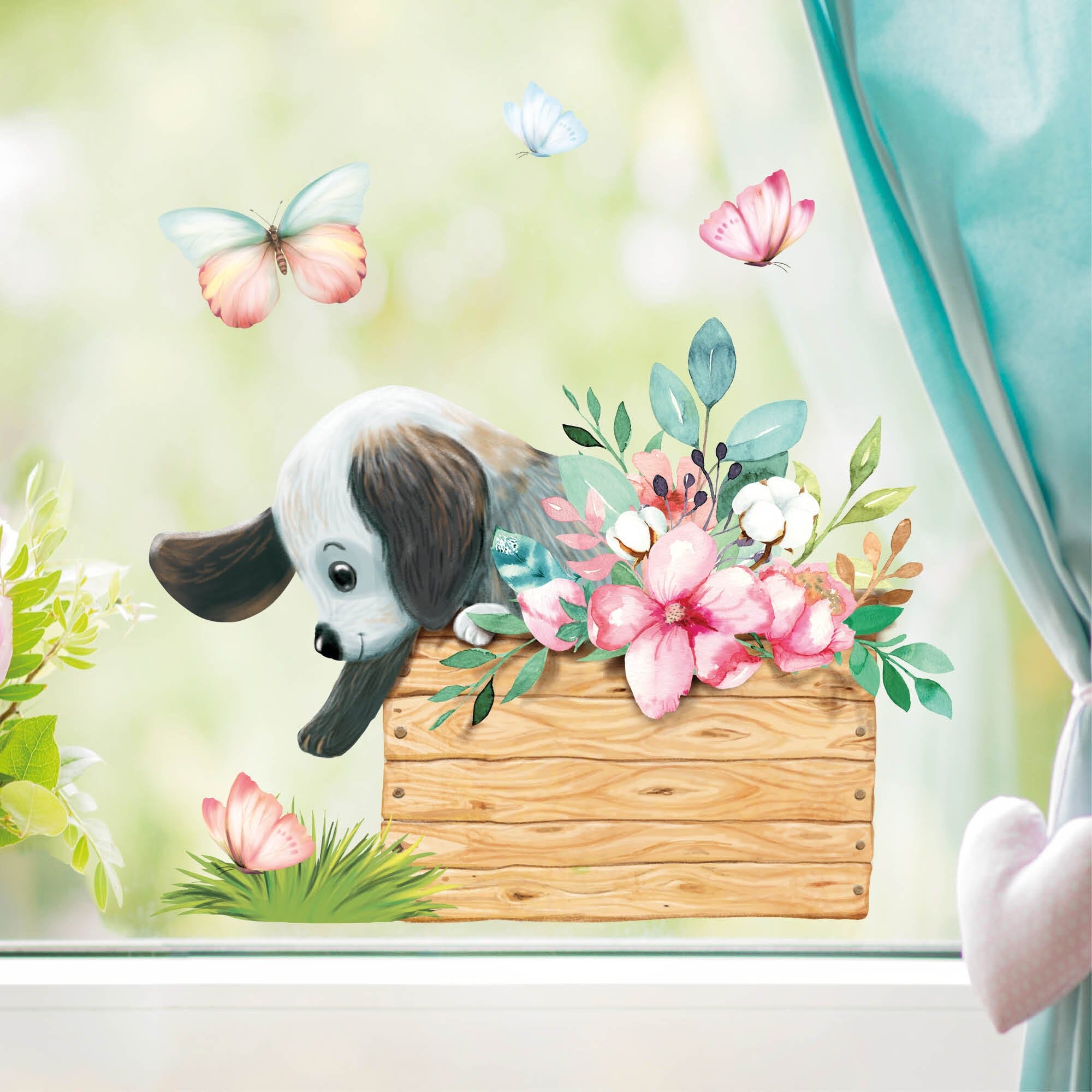 Fensterbild Frühling Ostern Welpe Hund in Kiste mit Blumen Schmetterlingen Fensterdeko Kinderzimmer Kind, Osterdeko, Frühlingsdeko