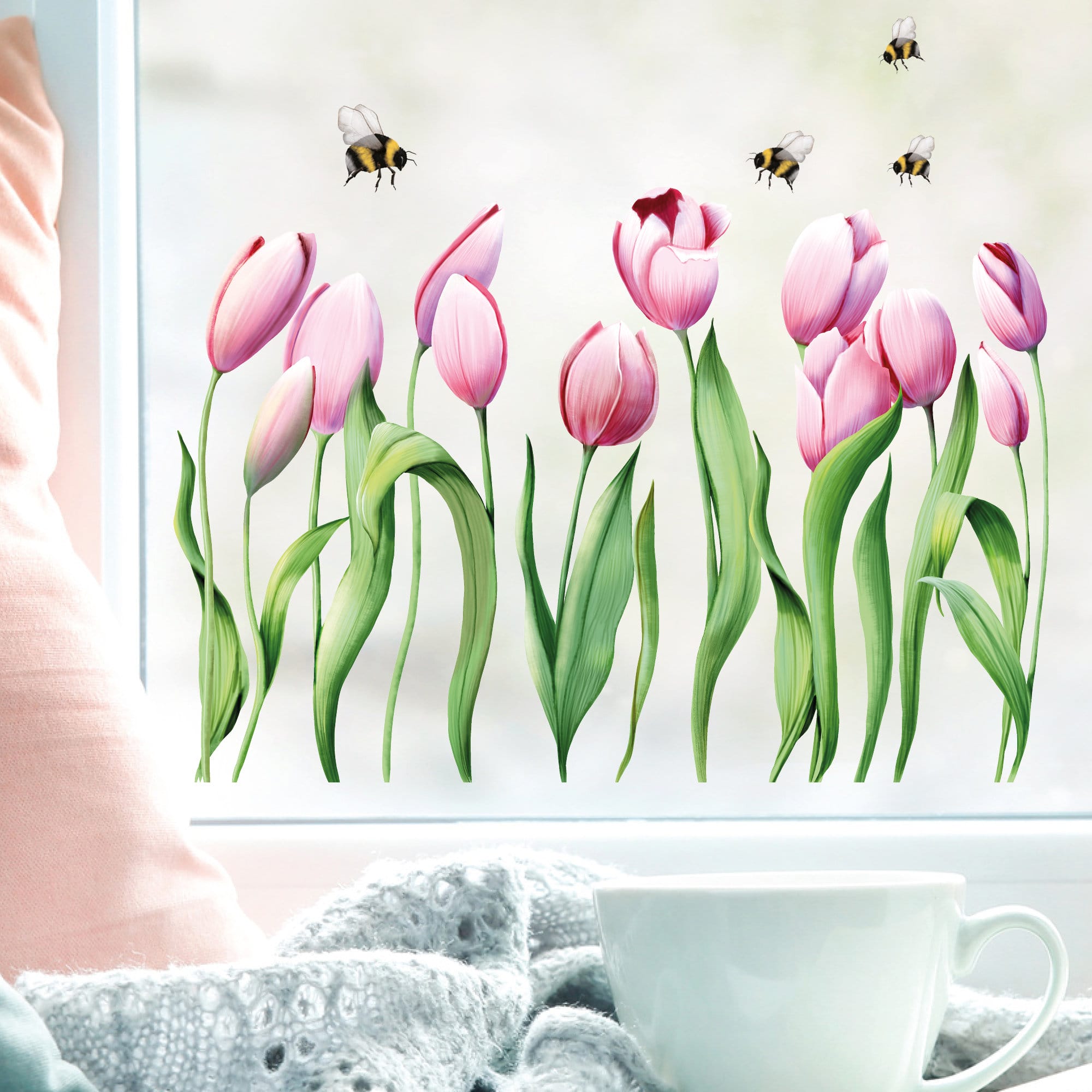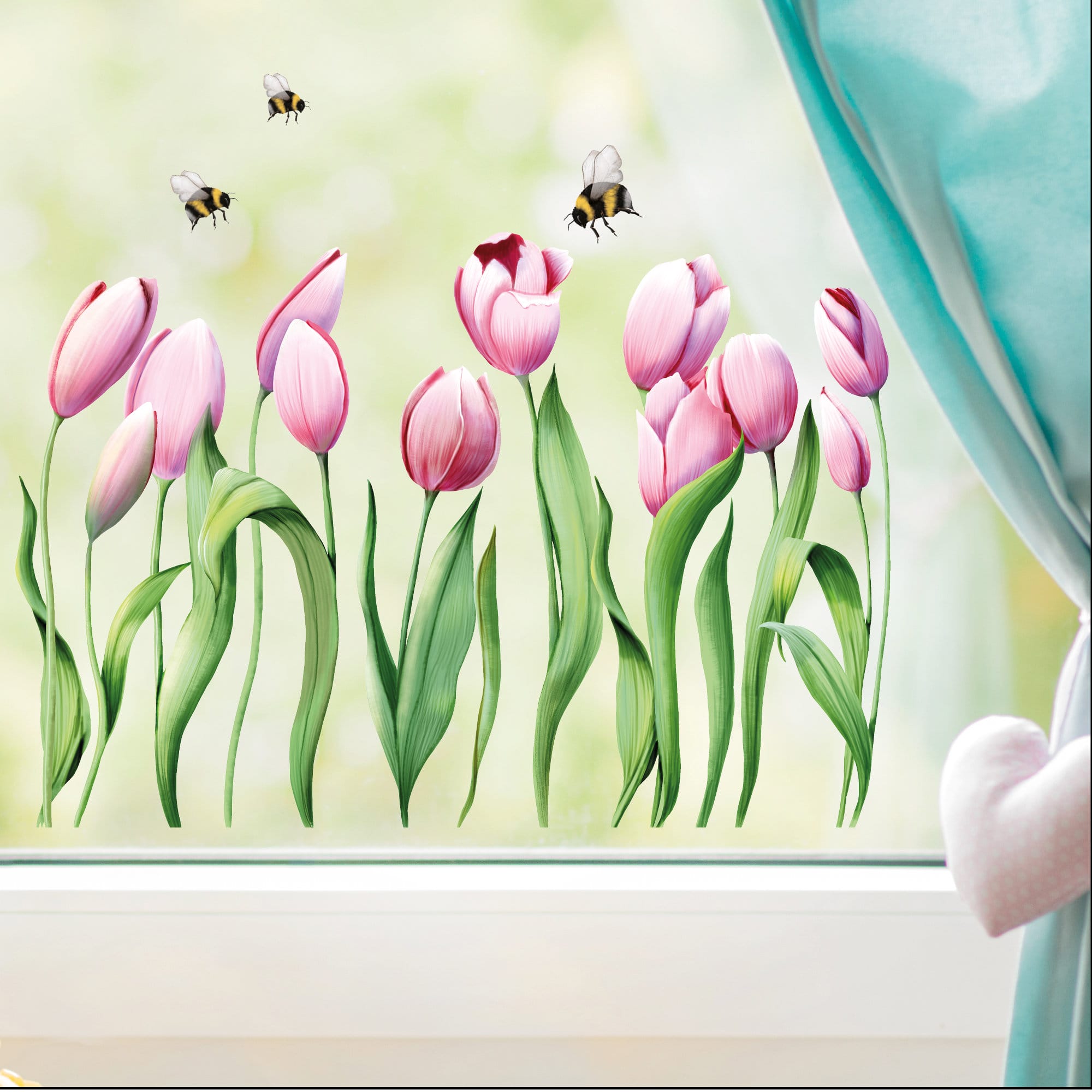 Wiederverwendbarer Fensteraufkleber Fensterbild Frühling Ostern Tulpen und Bienen Blumenwiese, Fensterdeko