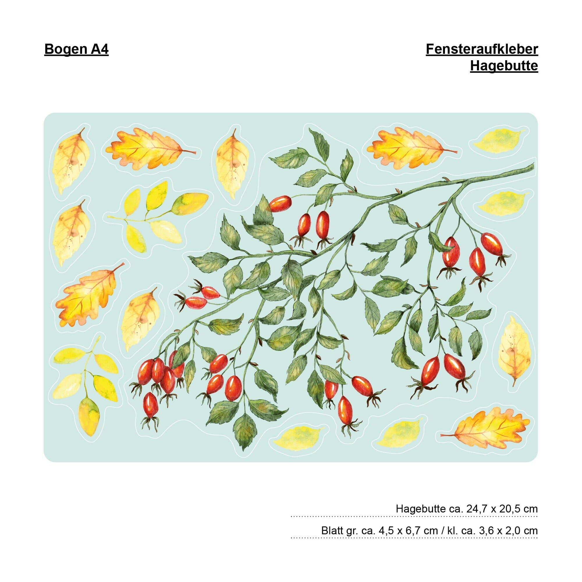 Dieses wiederverwendbare Aufkleber-Set sorgt mit einem Hagebuttenzweig und Herbstblätter für ein traumhaftes Fensterbild. Mit diesem Aufkleber kannst Du Deine Herbstdeko komplett machen. Ob für Kinderzimmer, Wohnzimmer, Schlafzimmer, Küche oder Hauseingang ….die Fensteraufkleber aus wiederverwendbarer PVC Folie sind statisch haftend (ohne Kleber), lassen sich problemlos auf jeder Fensterscheibe anbringen und rückstandsfrei entfernen. Der zu beklebende Untergrund muss sauber, trocken, staub- und fettfrei sein. Sie können jederzeit wieder benutzt werden!