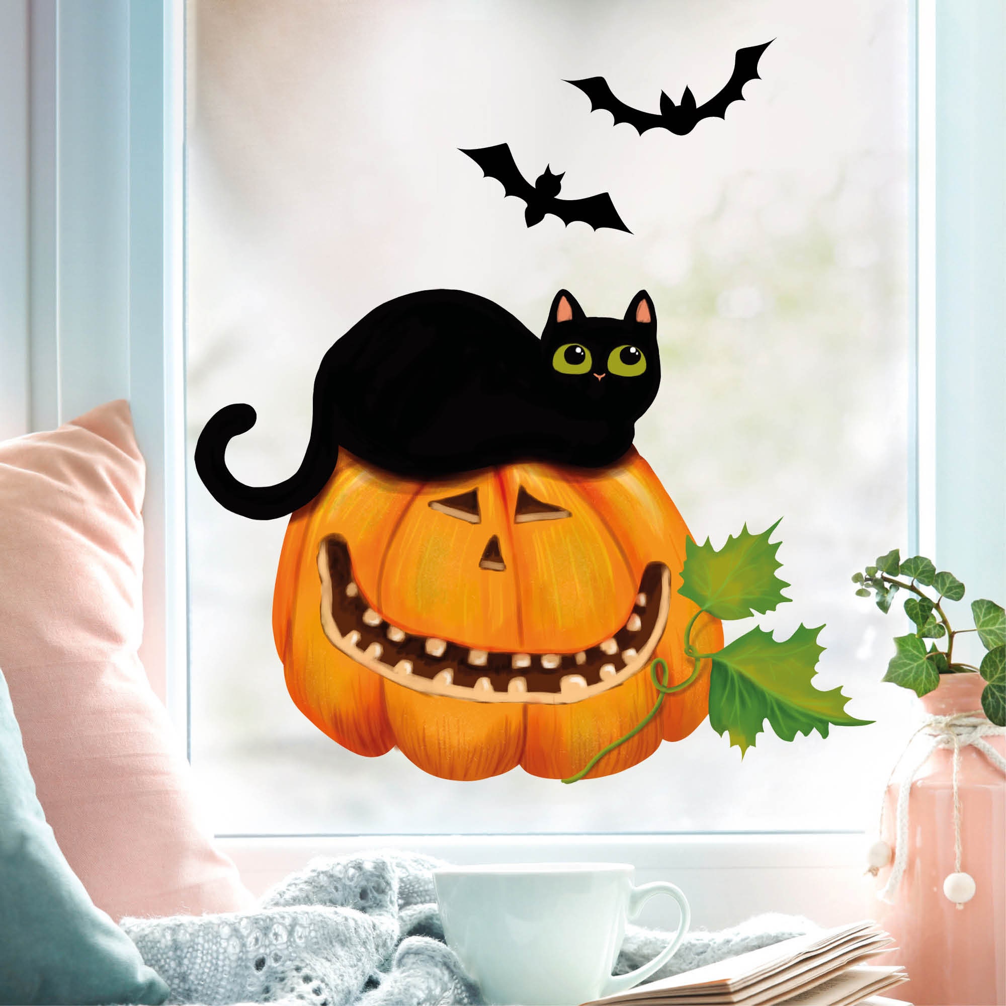Fensterbild Halloween Katze Kürbis Fledermäuse Fensterdeko Kinderzimmer Kind Fensterfolie Fensterdekoration