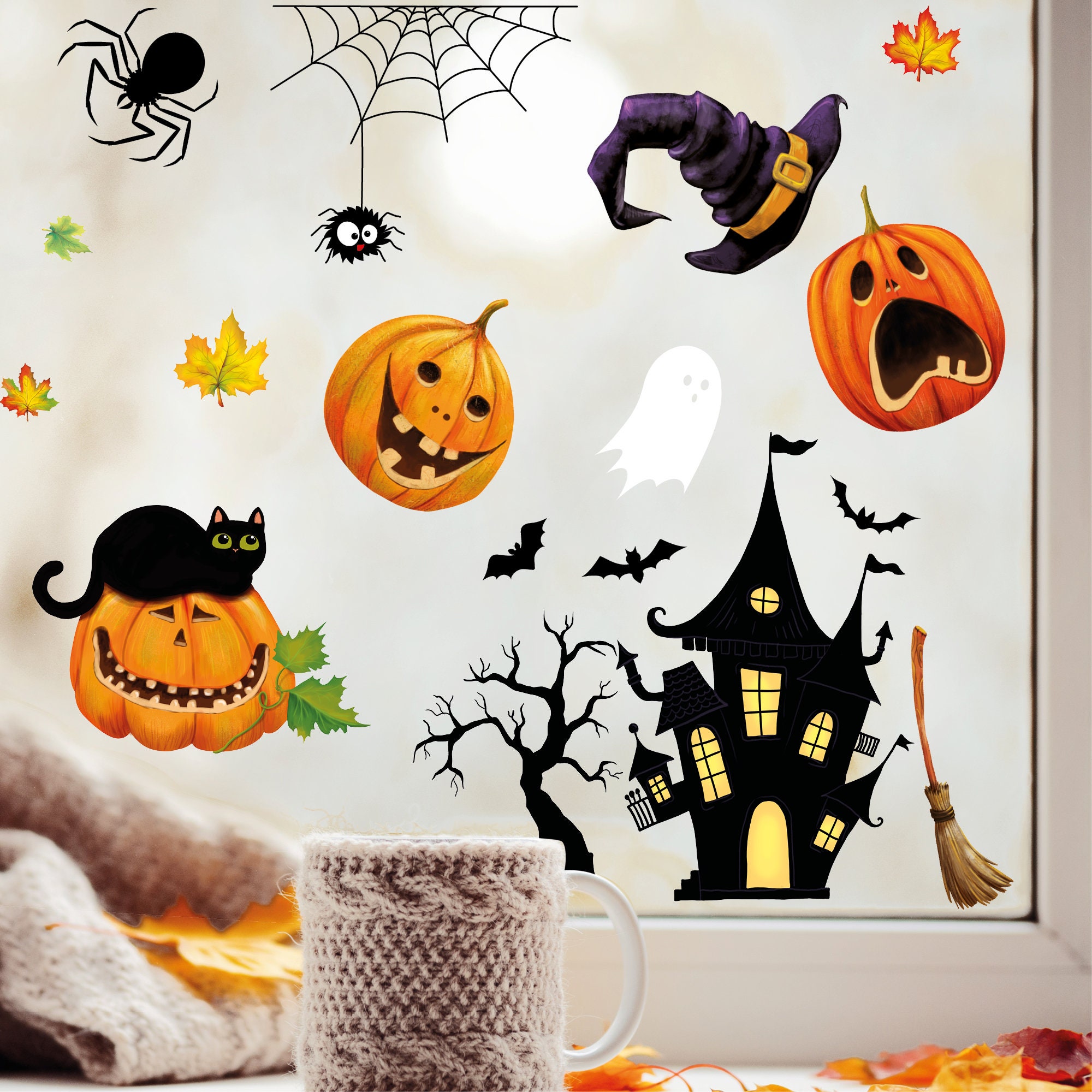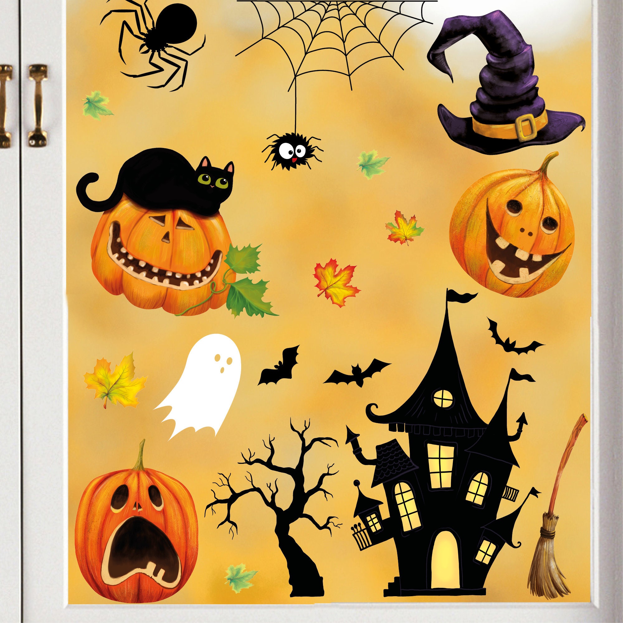 Fensterbild Halloween Katze Kürbisse Spinnennetz Fledermäuse Gruselhaus Fensterdeko Kinderzimmer Kind Fensterfolie Fensterdekoration