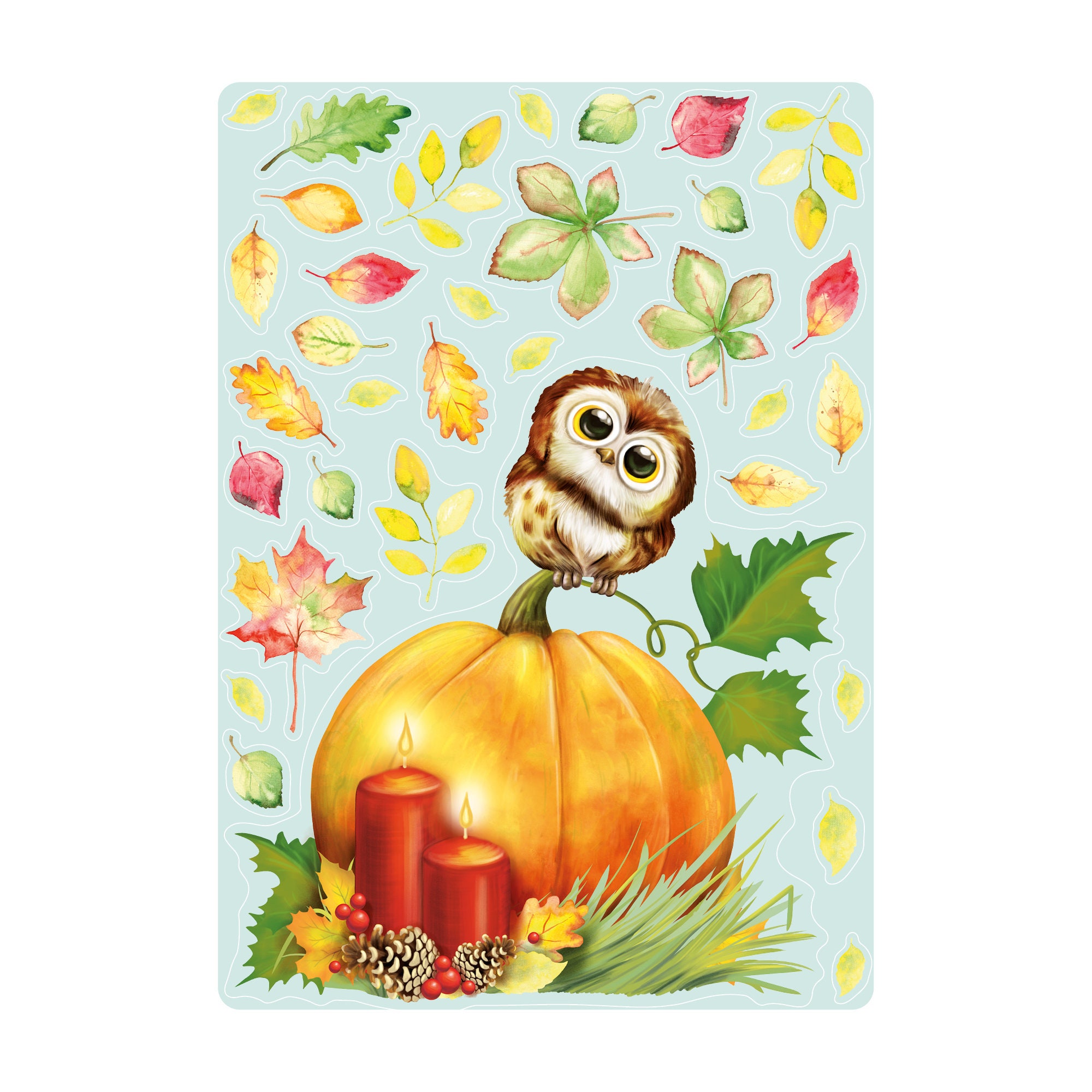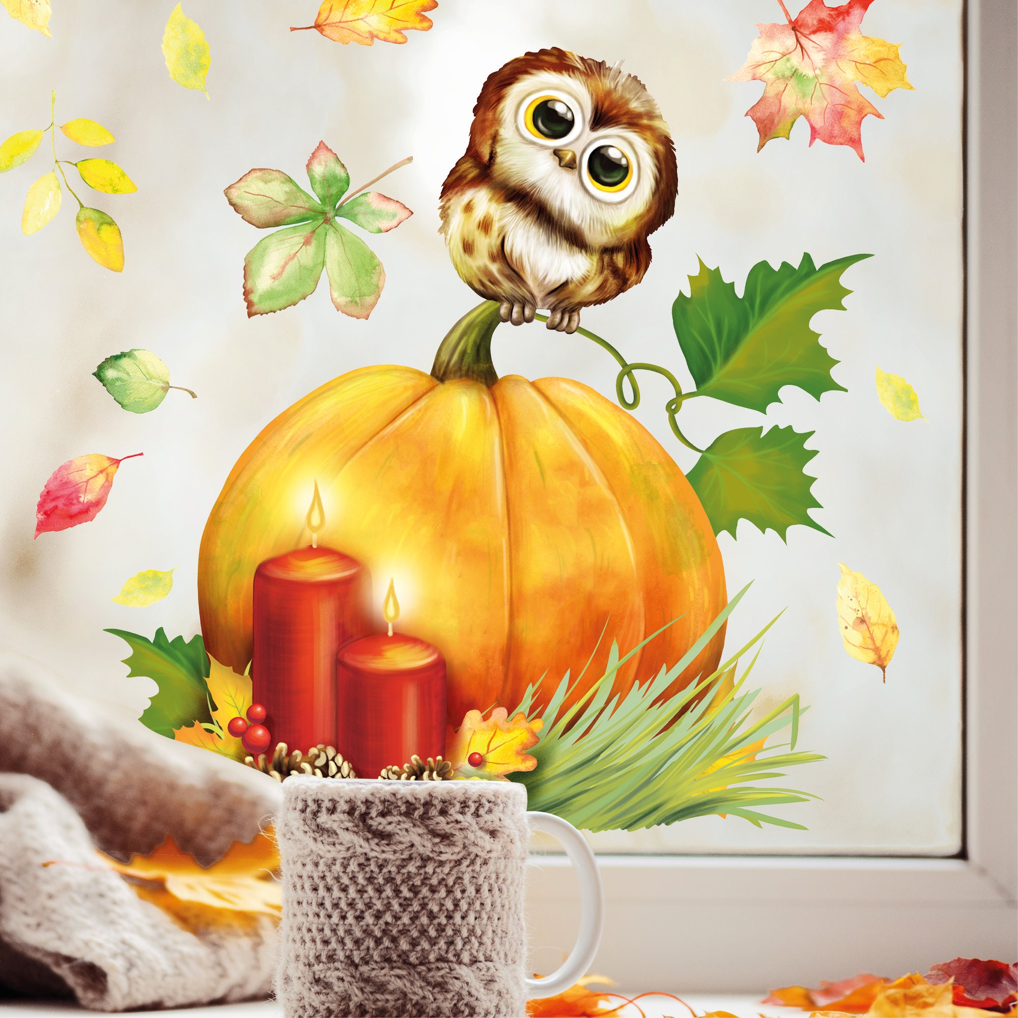 Fensterbild Herbst Herbstfrüchte Herbstblätter Kürbis mit Eule Halloween bunt wiederverwendbare Fensteraufkleber Kinderzimmer Baby Kind