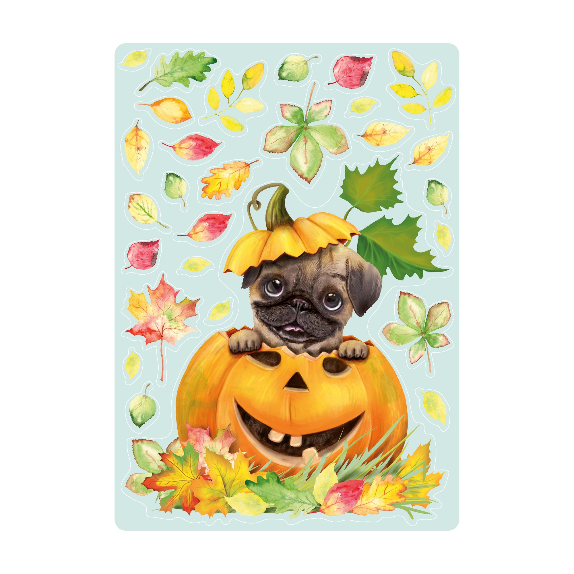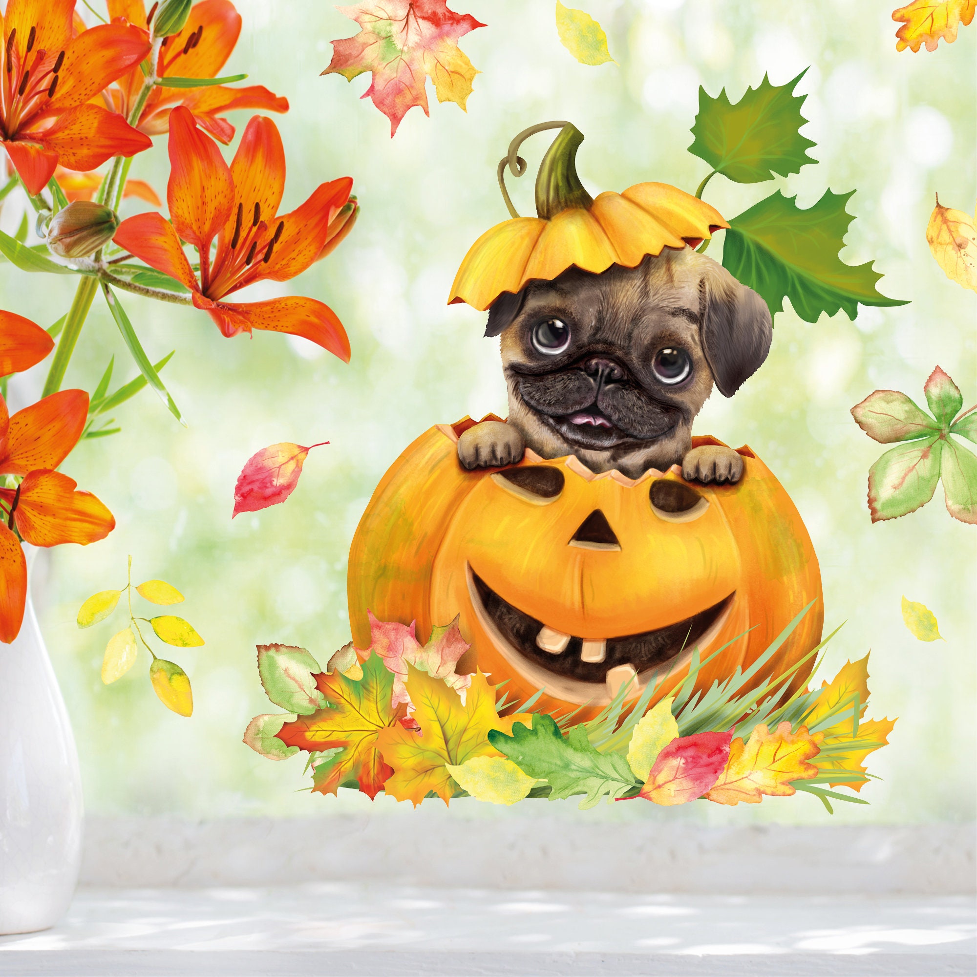 Fensterbild Herbst Herbstfrüchte Herbstblätter Kürbis mit Mops Hund Halloween bunt wiederverwendbare Fensteraufkleber Kinderzimmer Baby Kind