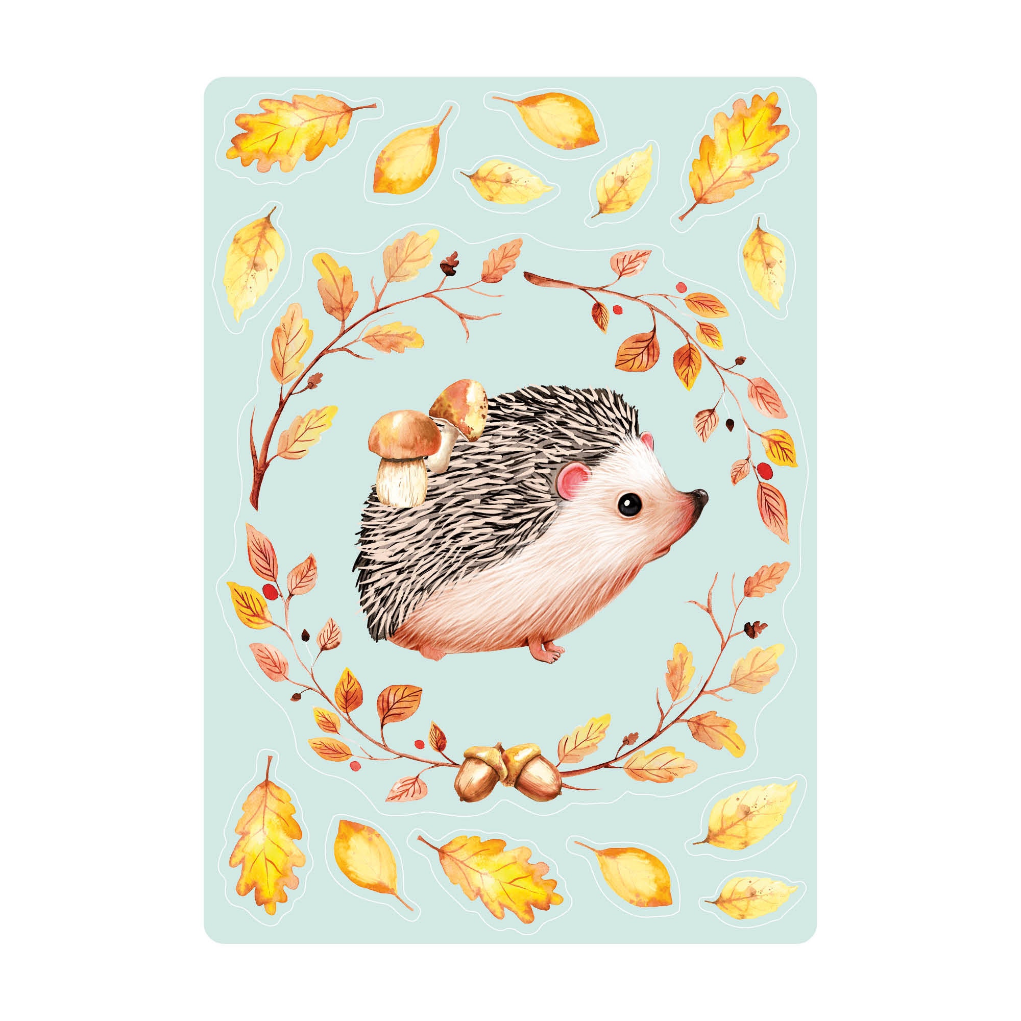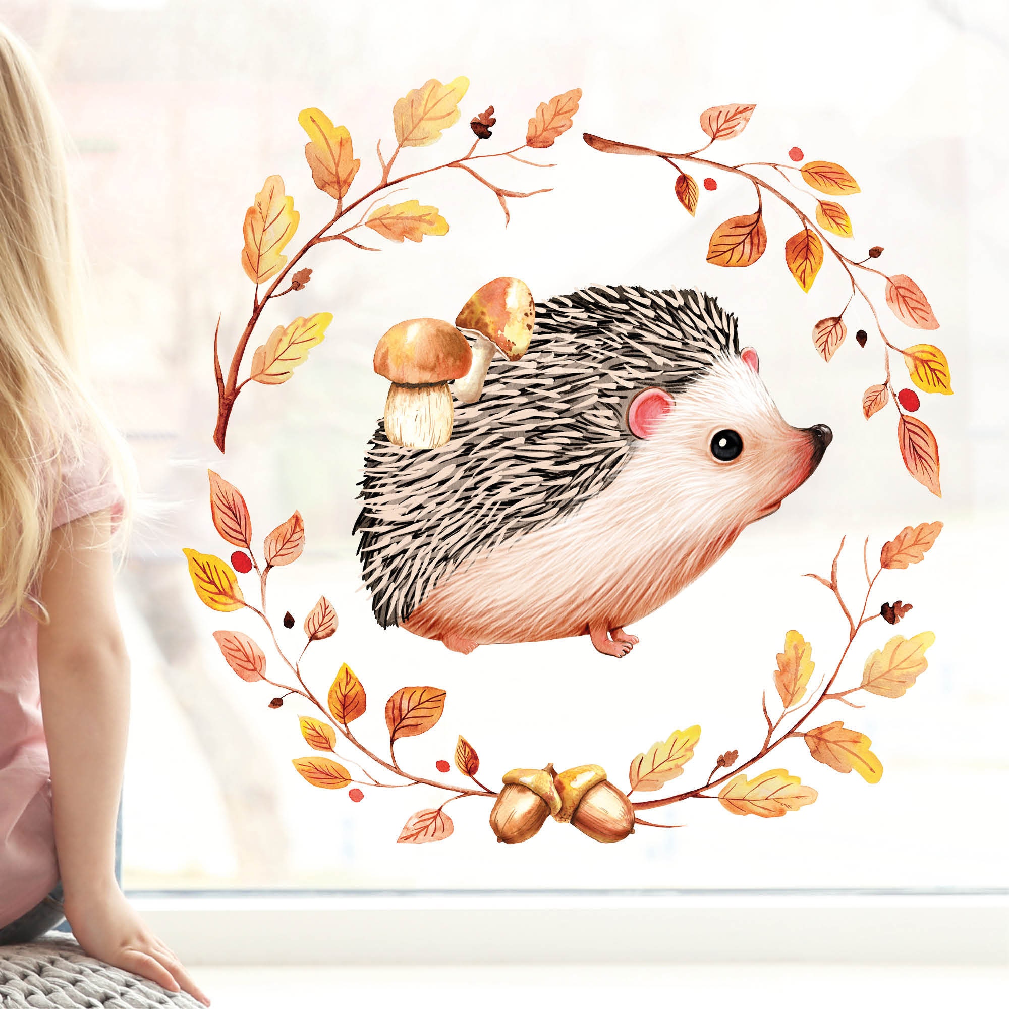 Fensterbild Herbst Igel mit Pilzen und Blätterkranz wiederverwendbare Fensteraufkleber Kinderzimmer