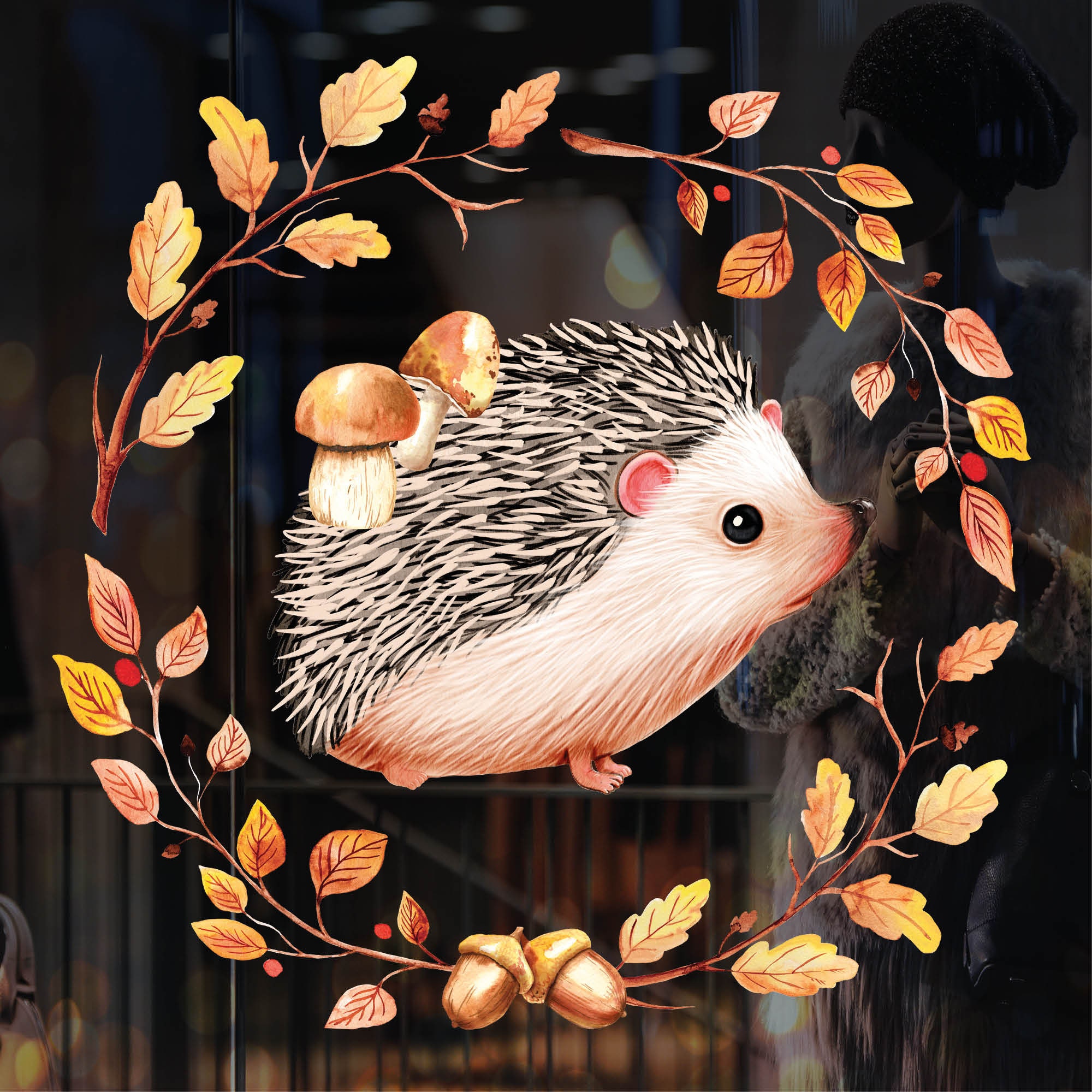 Fensterbild Herbst – Igel mit Pilzen und Blätterkranz – Wiederverwendbare Fensteraufkleber