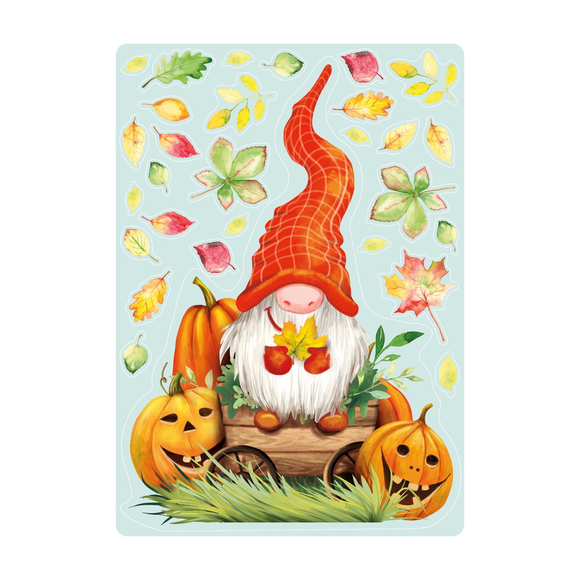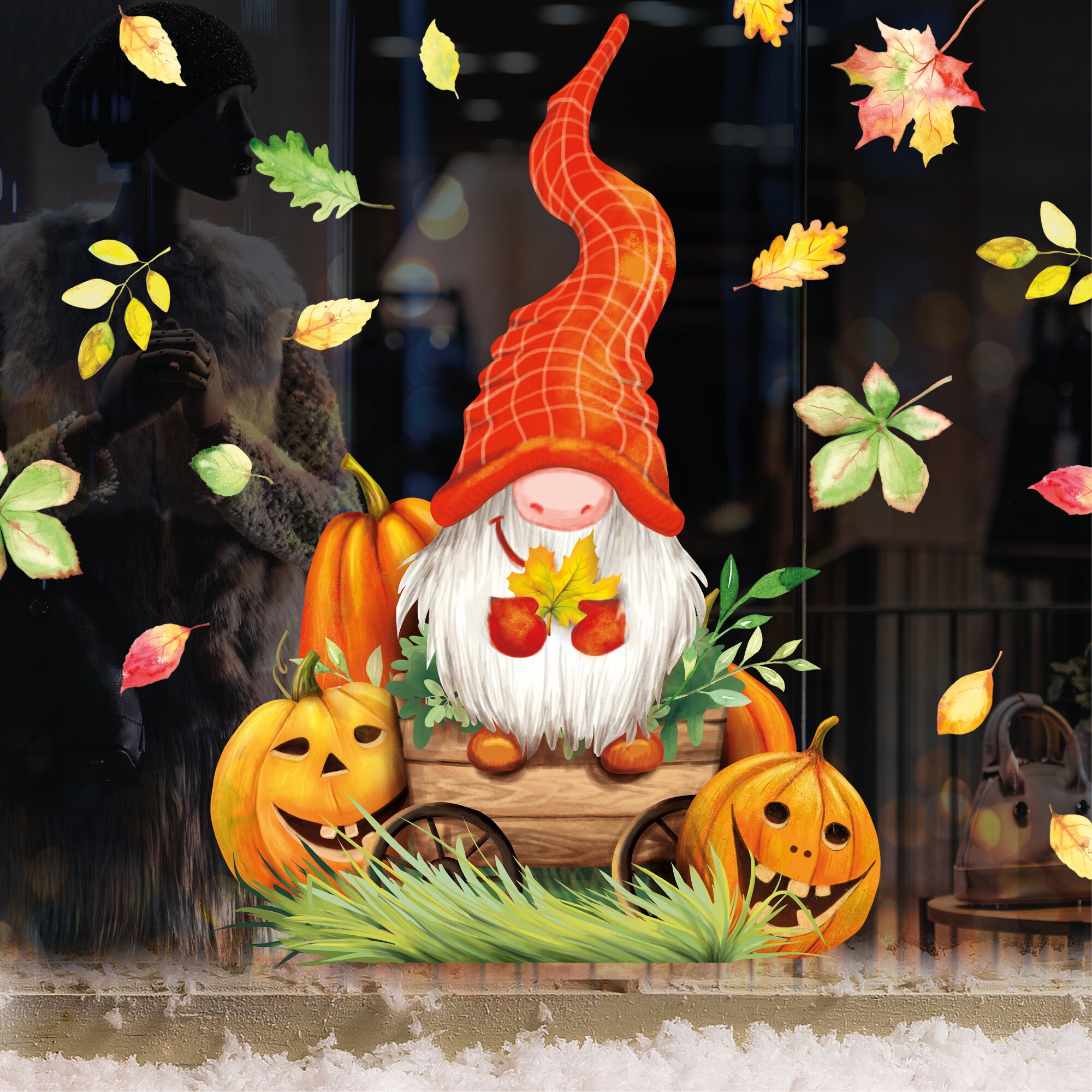 Fensterbild Herbst Zwerg mit Blättern und Kürbissen herbstlicher Fensteraufkleber Fensterdeko