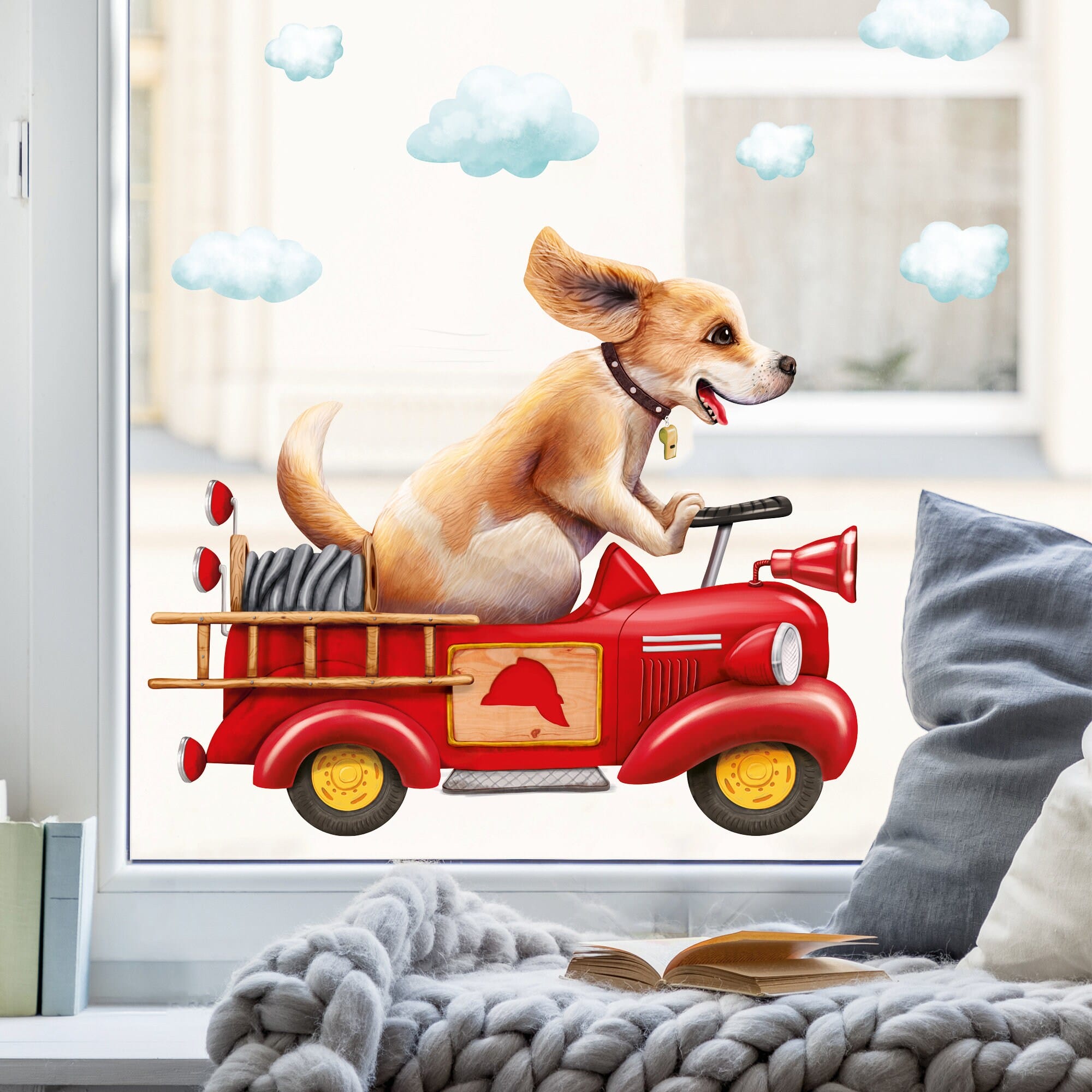 Fensterbild Hund im retro Feuerwehrauto mit Wolken, Fensterdeko Kinderzimmer Kind