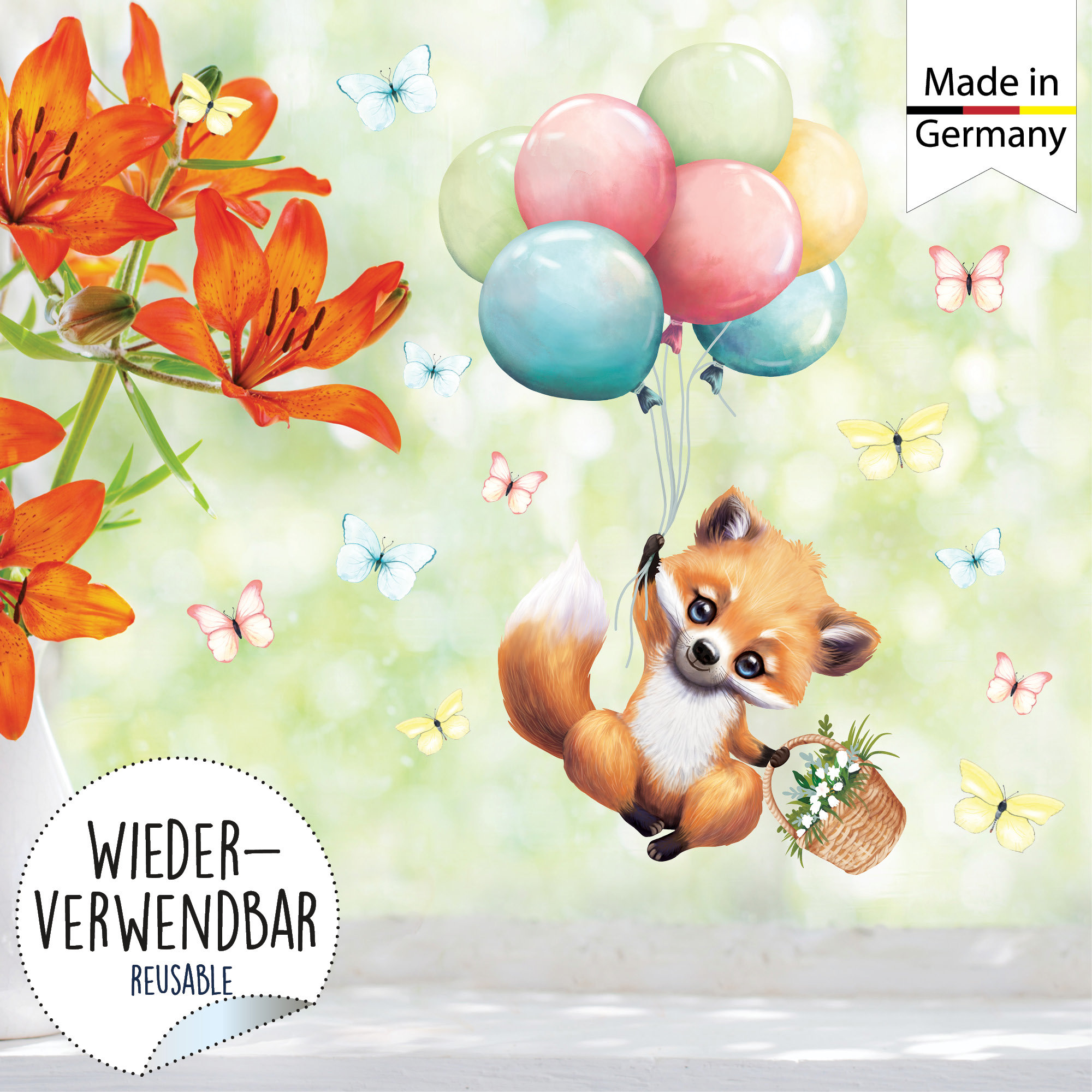 Fensterbild Kinderzimmer Frühling Ostern Fuchs Luftballons Schmetterlinge Fensterdeko Kind, Frühlingsdeko, Osterdeko