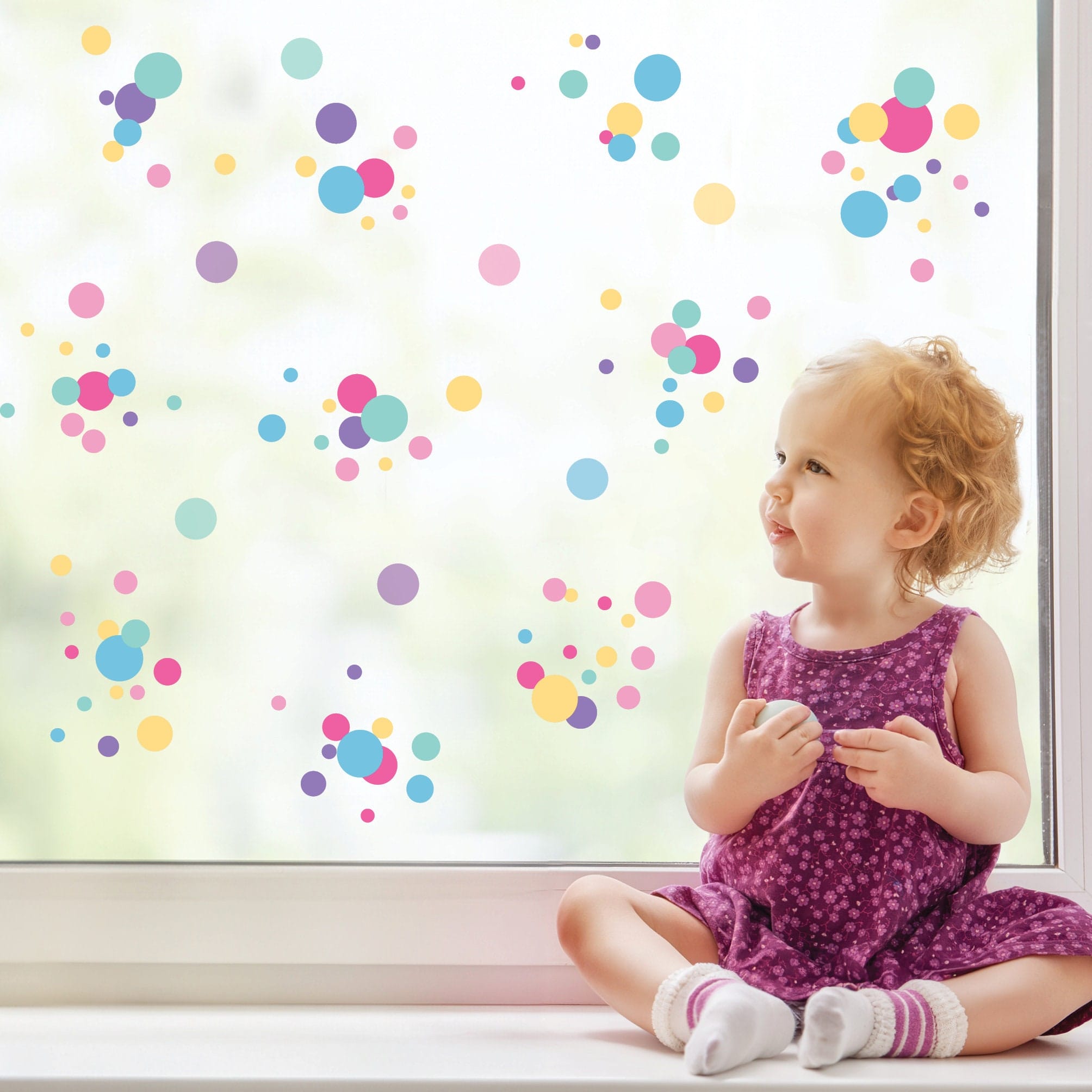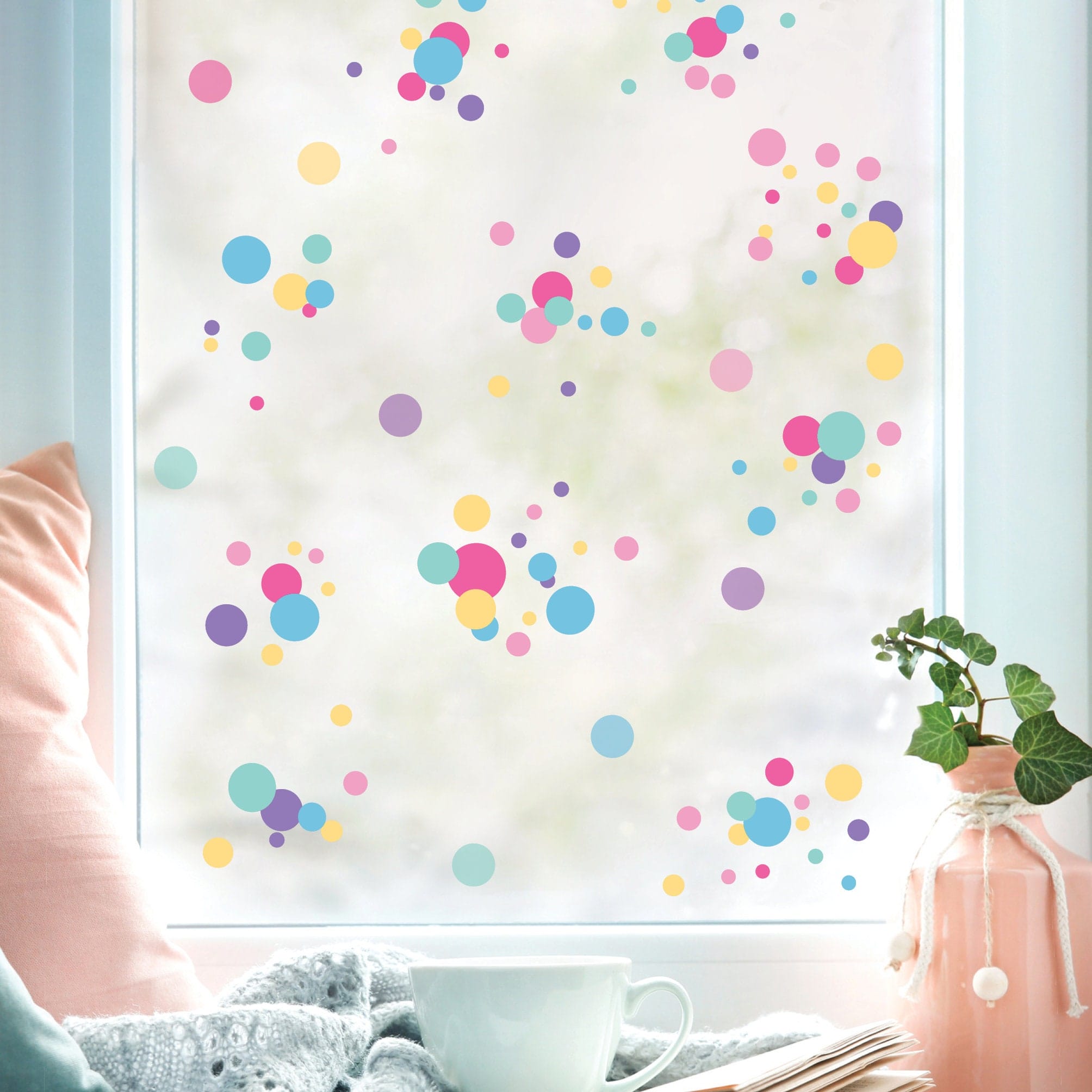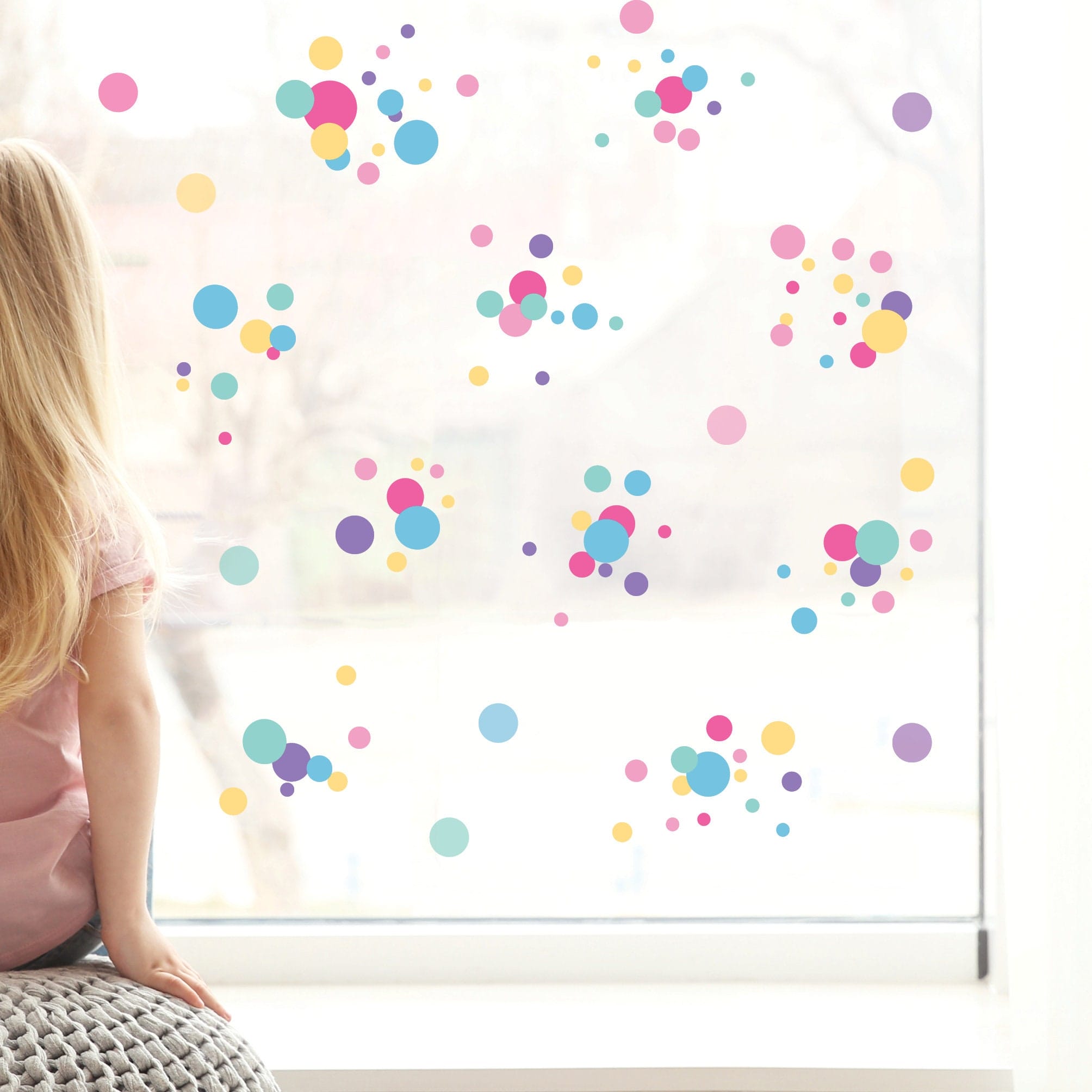 Auf dem Bild ist das Produkt: Fensterbild Konfetti Karneval Cluster wiederverwendbar Frühling bunte Punkte Fasching farbige Kreise, A3 zum Preis von €17.9 abgebildet.