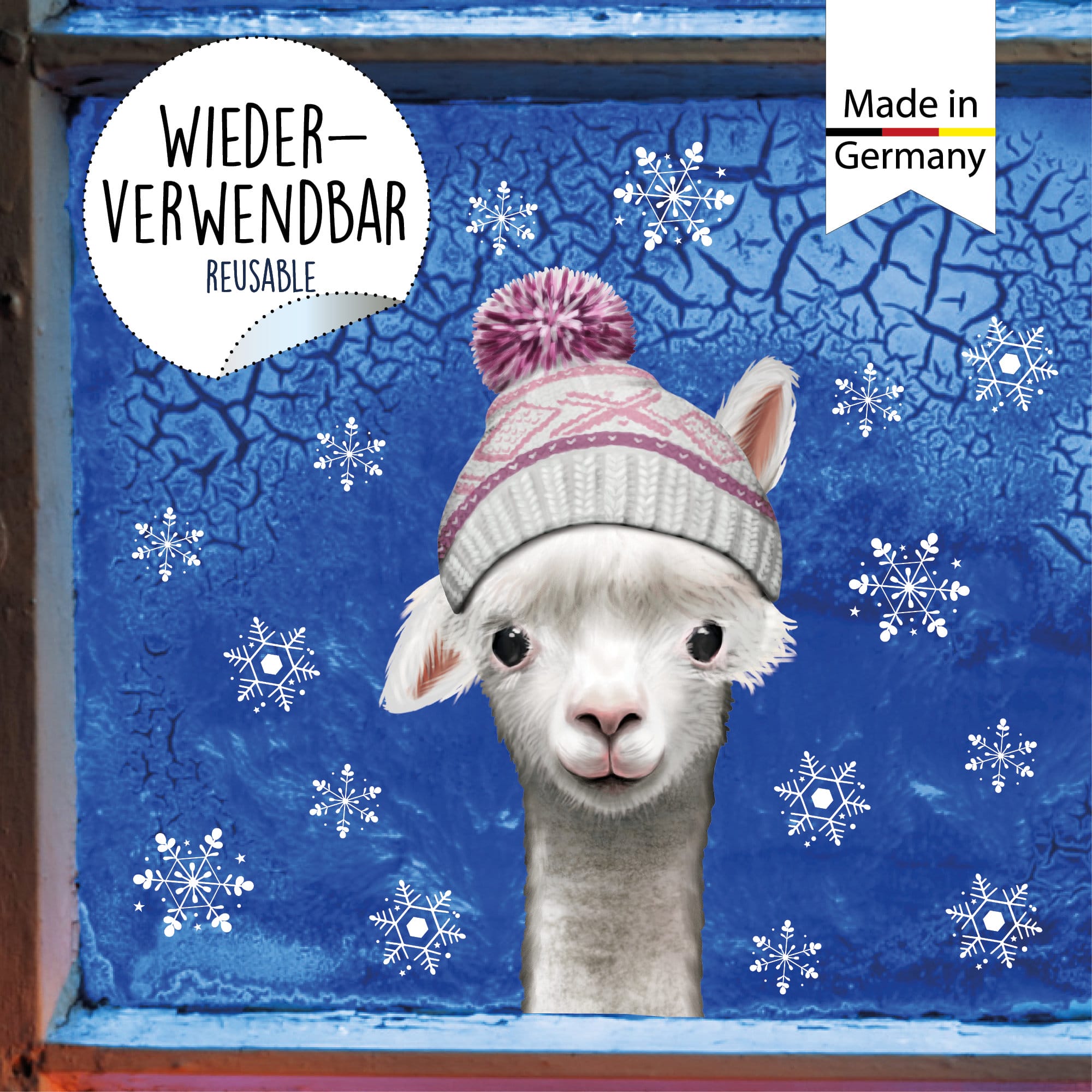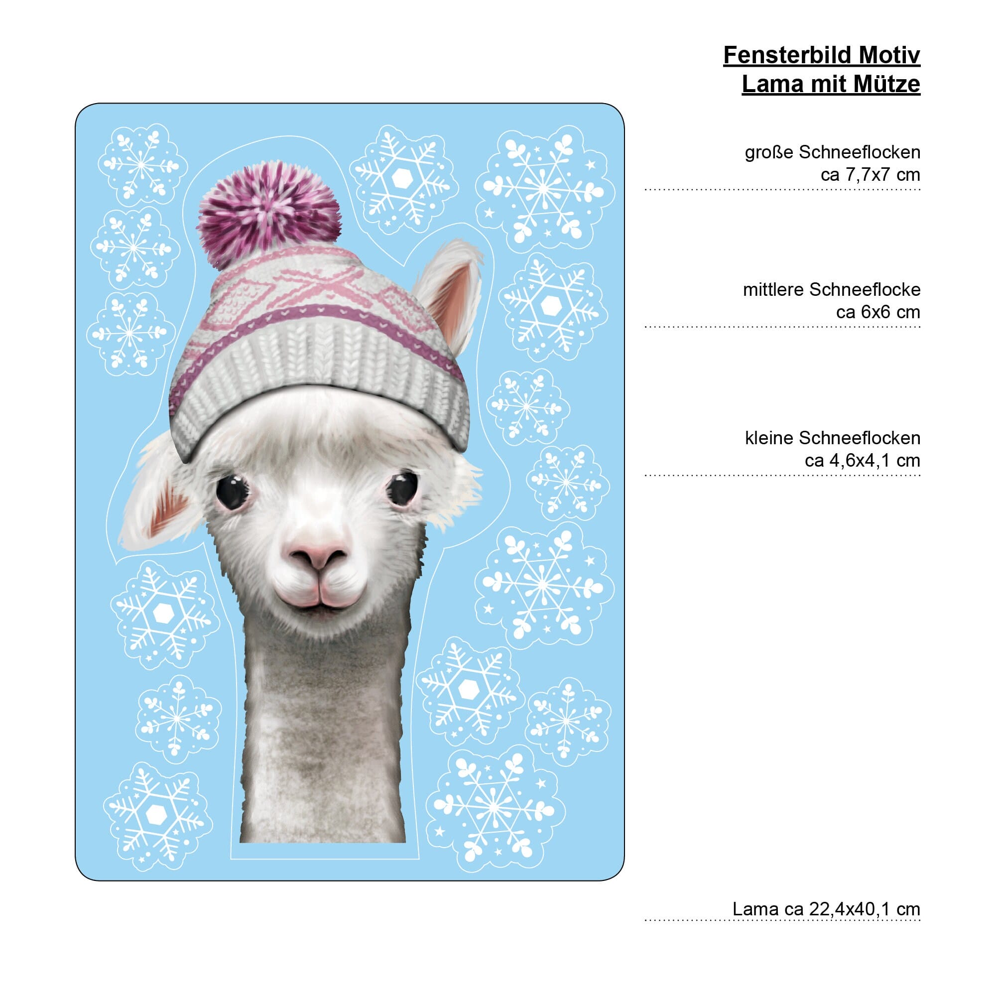 Fensterbild Lama mit rosa Mütze Schneeflocken Winter winterlicher Fensteraufkleber Fensterdeko Weihnachten, Adventdeko