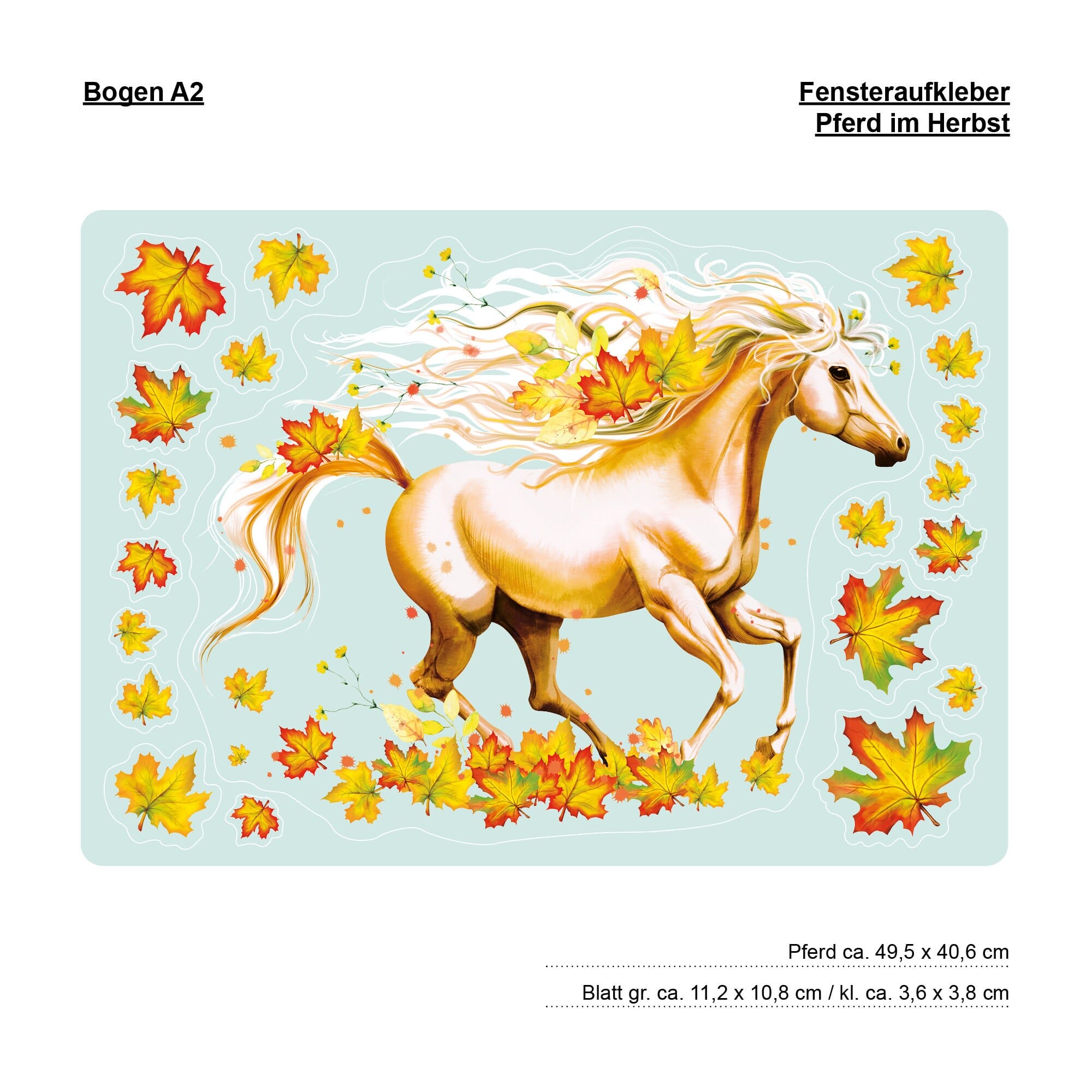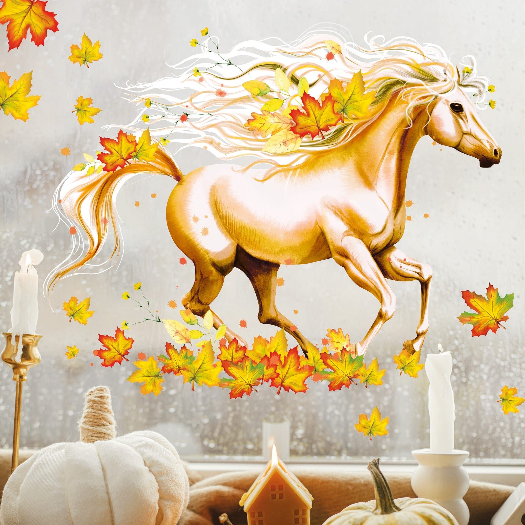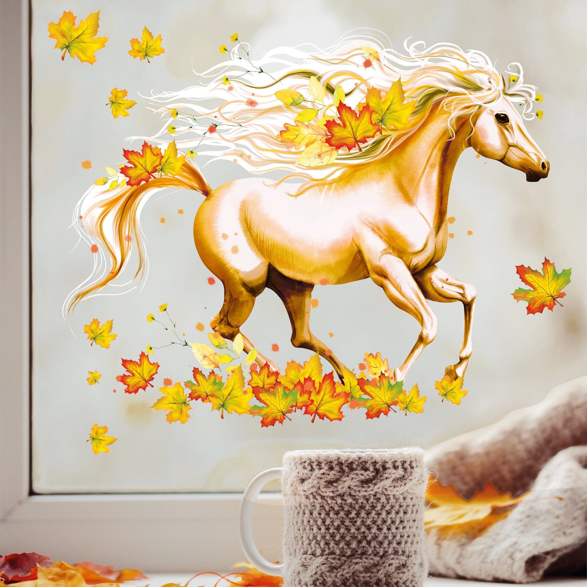 Fensterbild Pferd Herbst Galopp Blätter Herbstblätter bunt farbig wiederverwendbare Fensteraufkleber